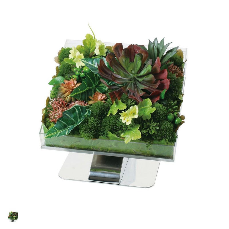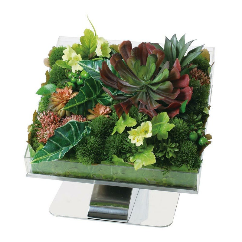 個性豊かな多肉植物やグリーンを、スタイリッシュな器にぎゅっと詰め込んだフェイクグリーンアレンジメント。