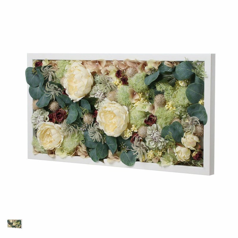 クリーム色のピオニーを主役に、ユーカリやモス、愛らしい小花を白いフレームの中にアレンジしたアーティフィシャルフラワーアート。