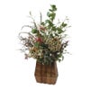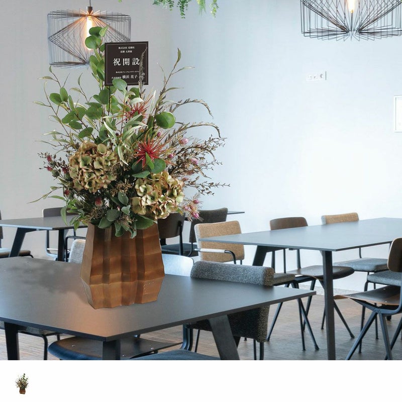 アンティークカラーのアジサイやユーカリ、個性的なワイルドフラワーを束ねたシックなアーティフィシャルフラワーアレンジメント。