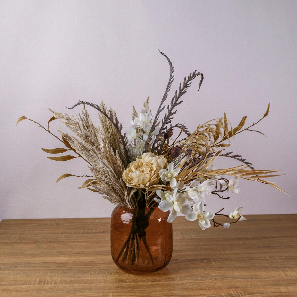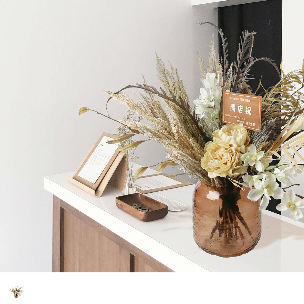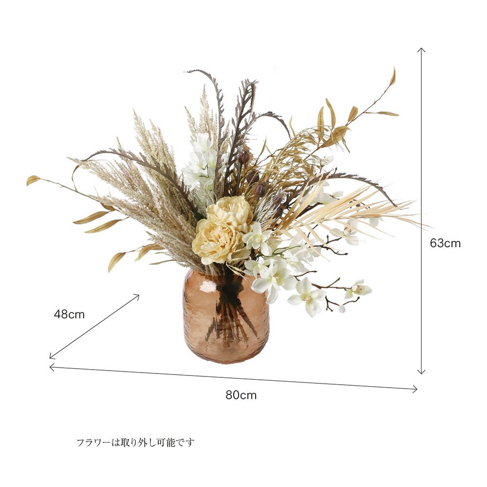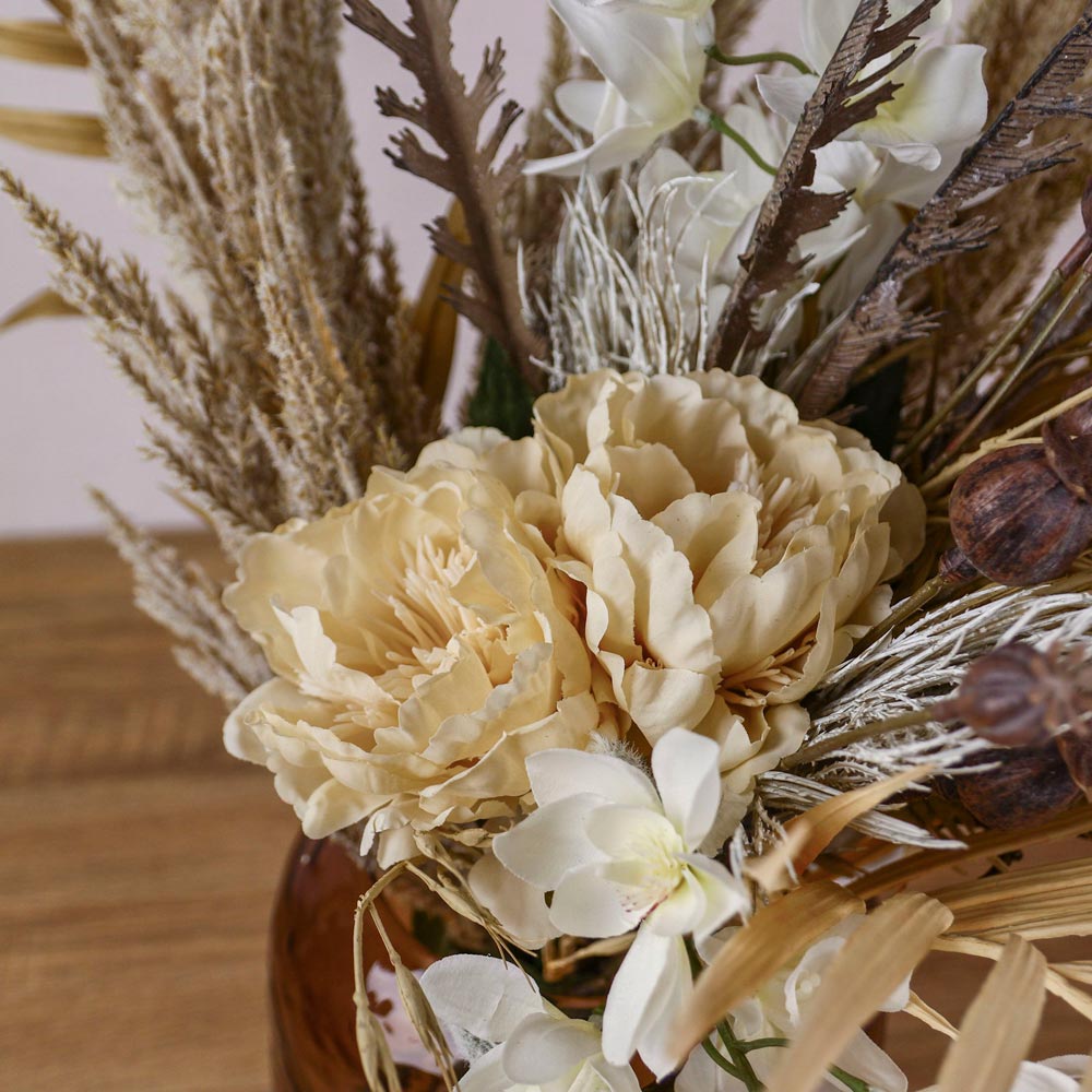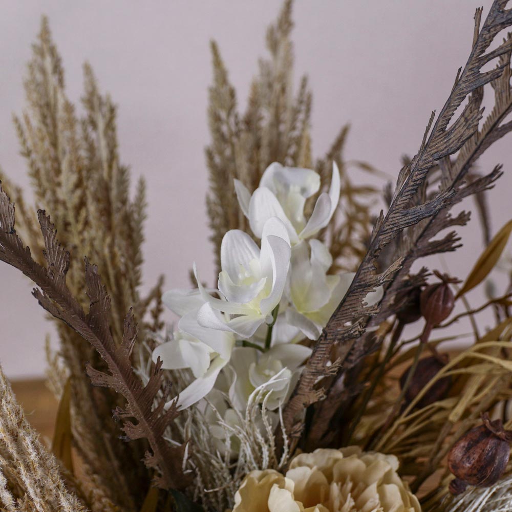 パンパスグラスなどのドライな質感の植物に、クリーム色のピオニーや胡蝶蘭を合わせたフェイクグリーンアレンジメント。