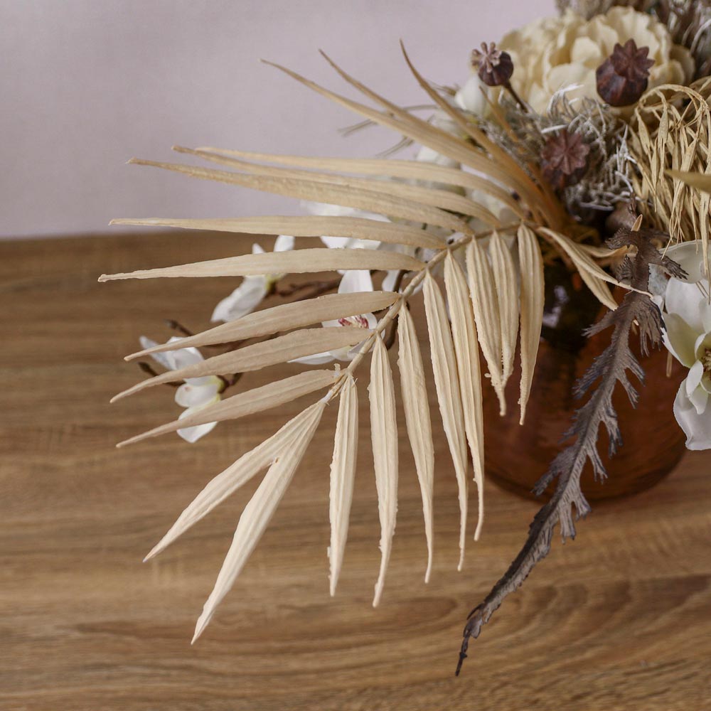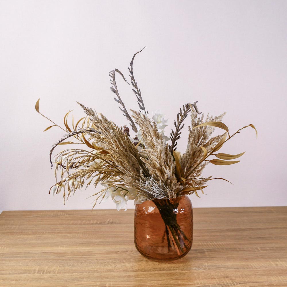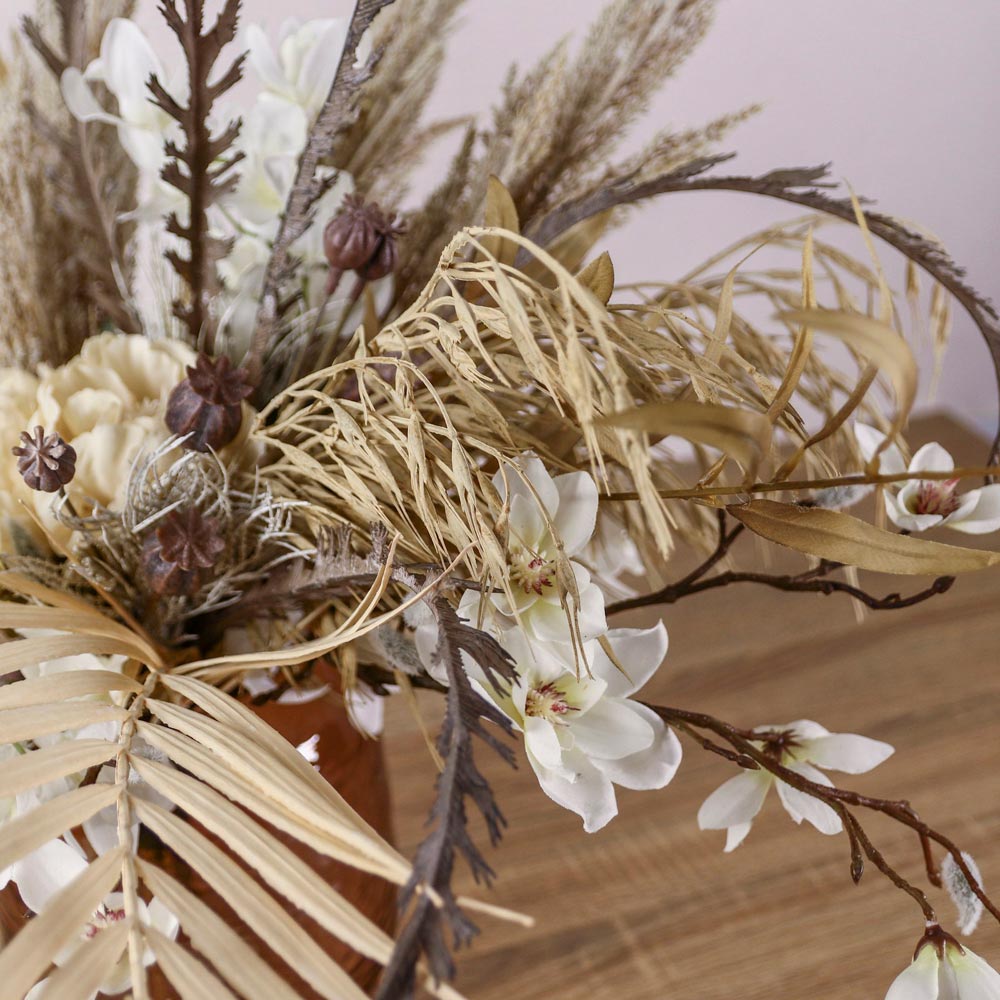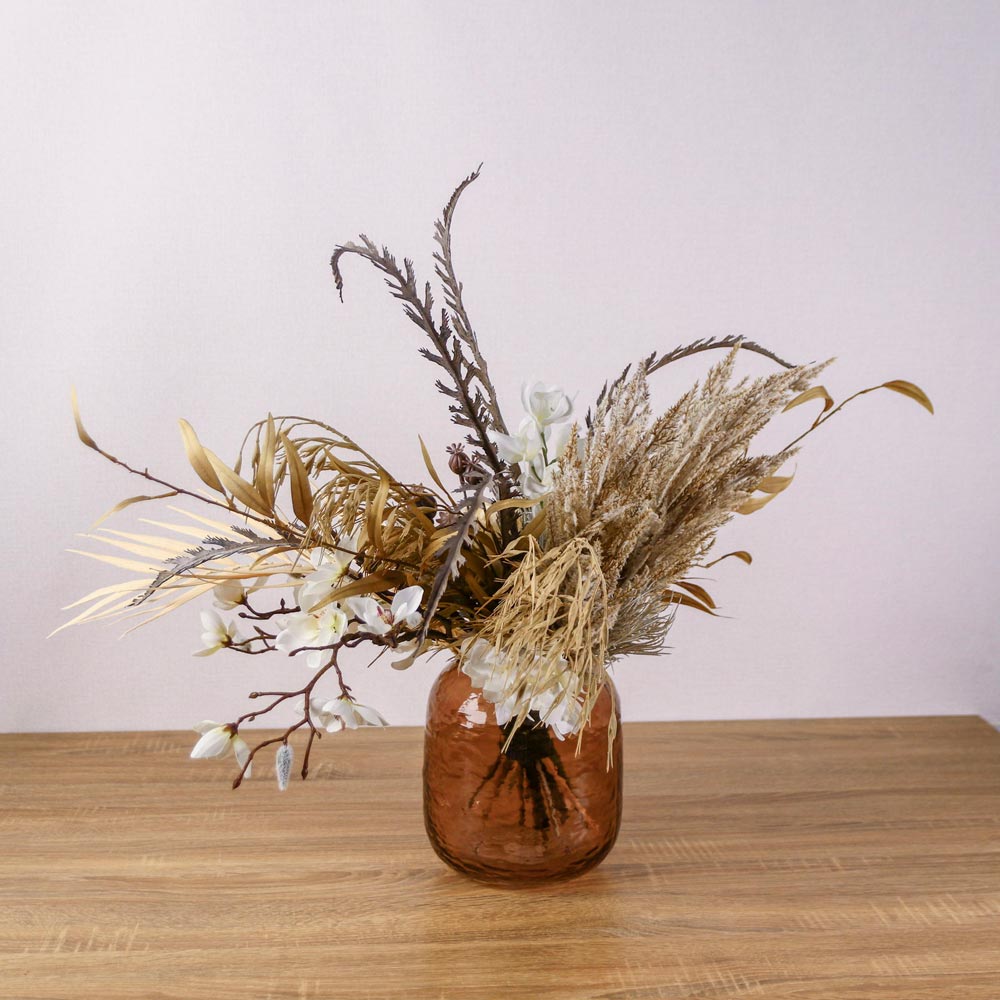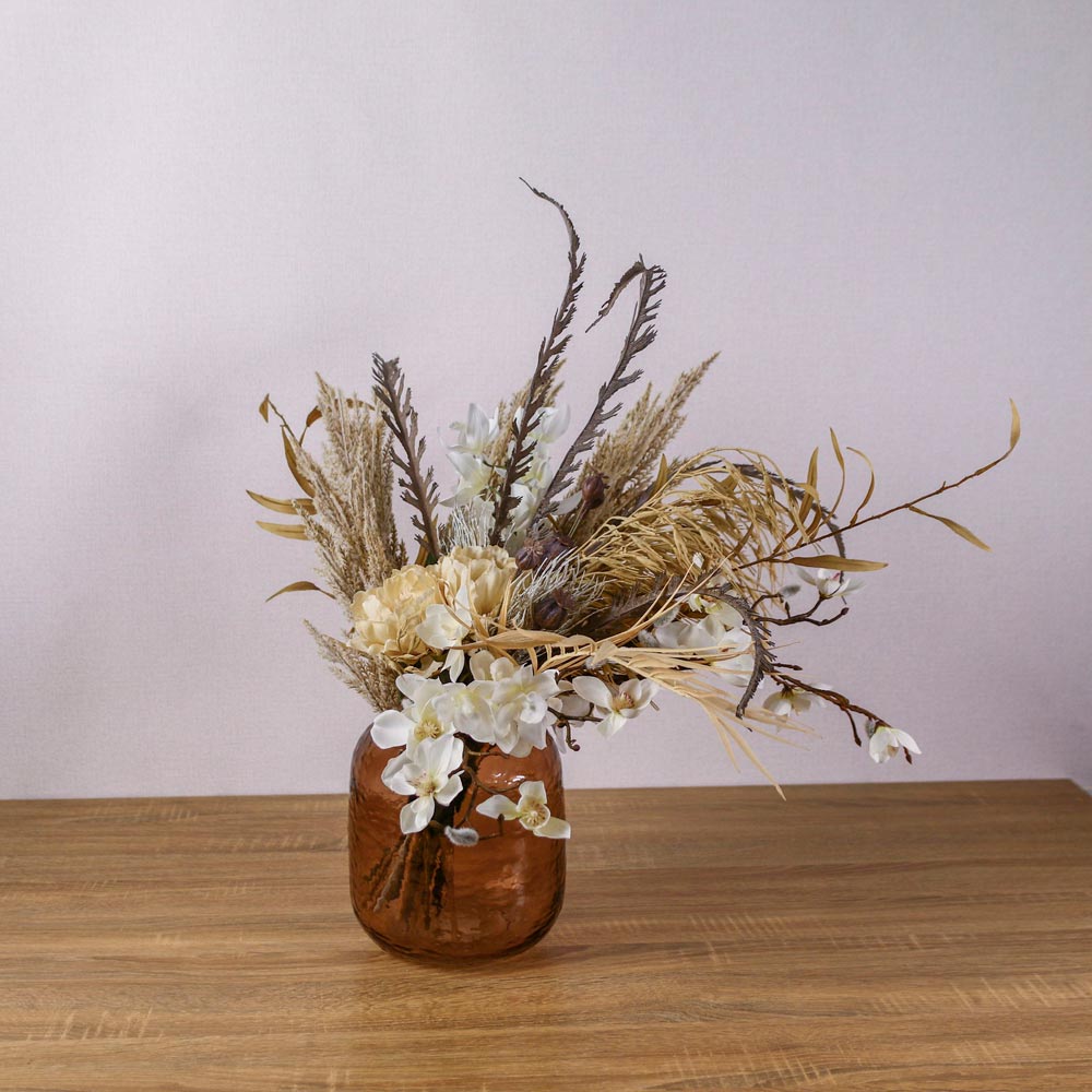 パンパスグラスなどのドライな質感の植物に、クリーム色のピオニーや胡蝶蘭を合わせたフェイクグリーンアレンジメント。