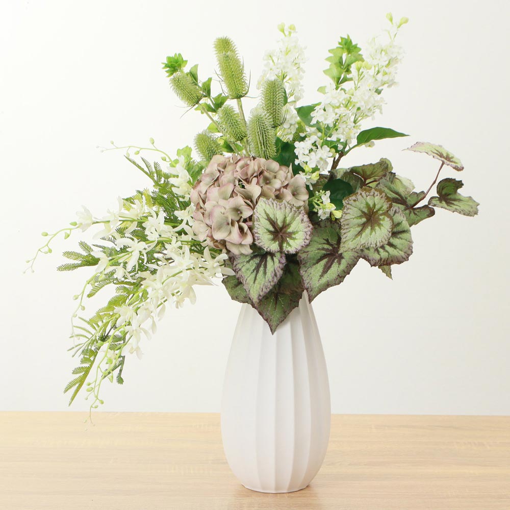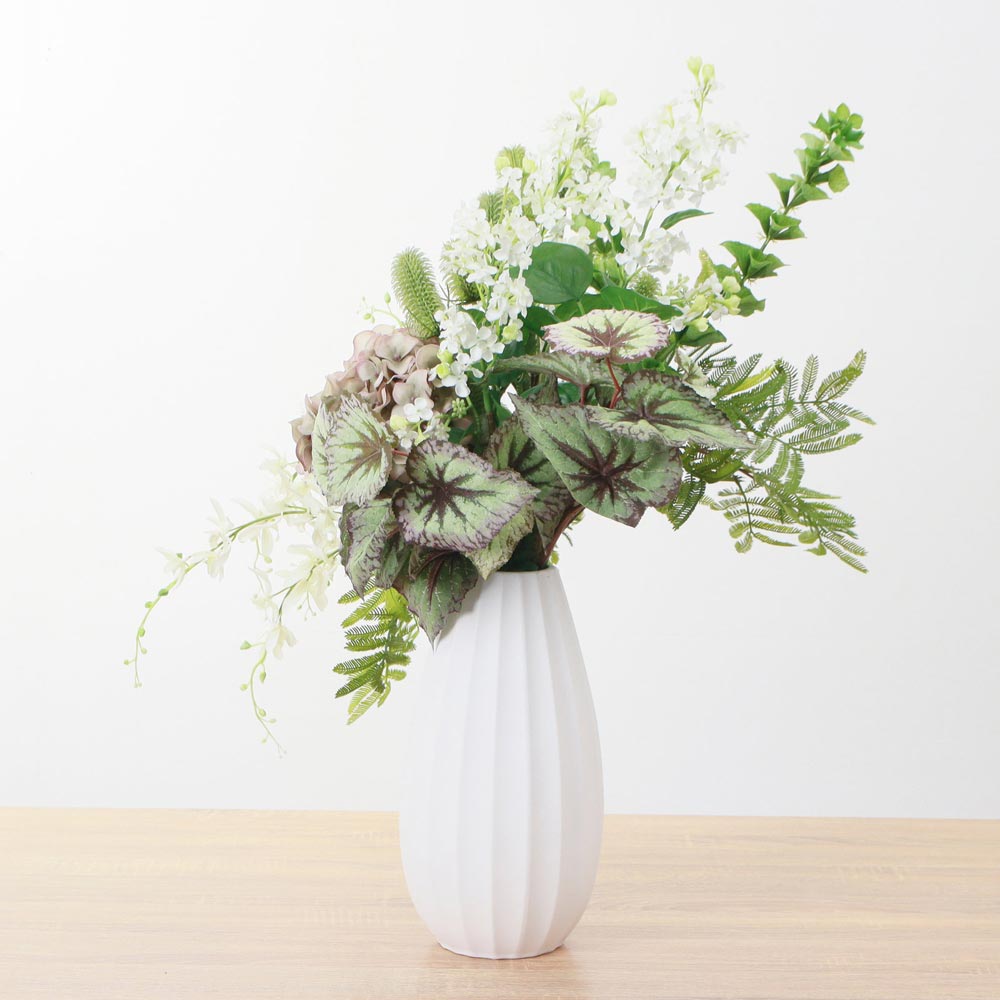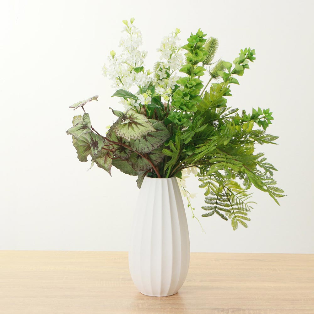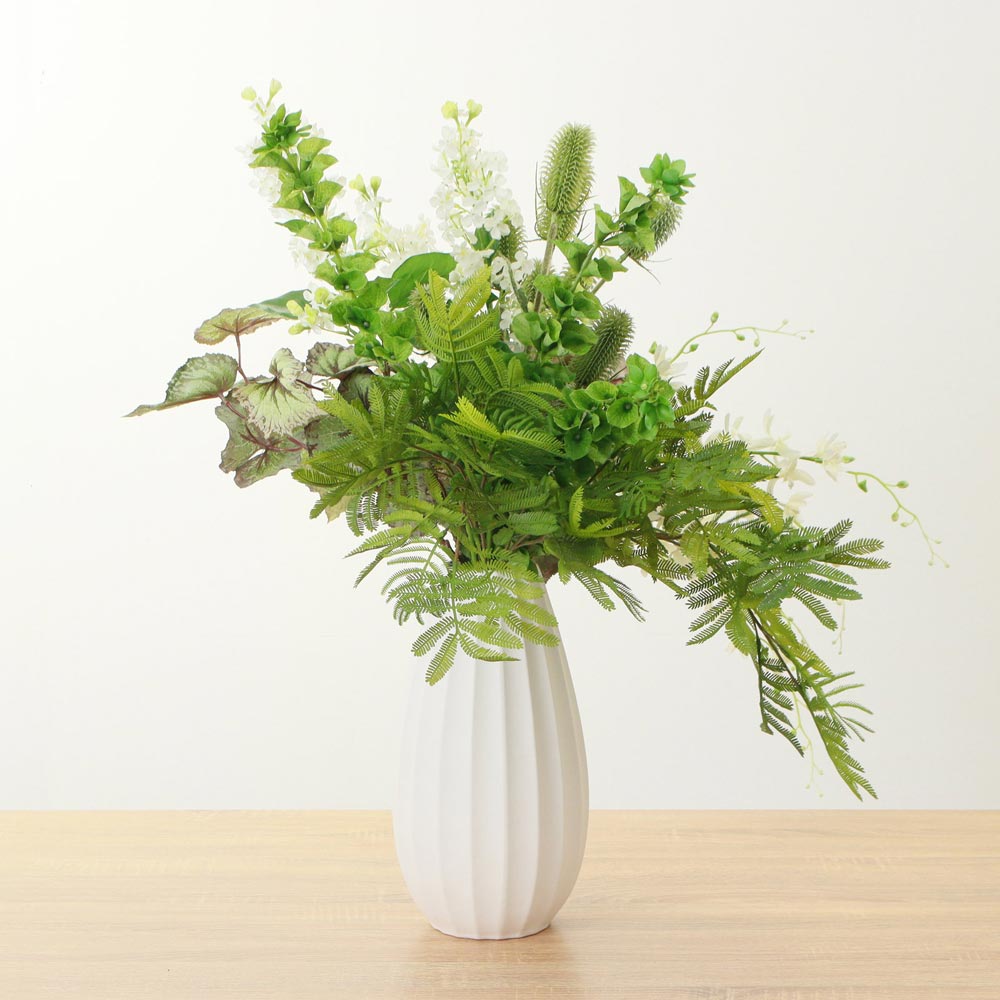 白やグリーンの爽やかな花々が上品な華やかさを添えています。美しい曲線の白いベースが、植物の生き生きとした表情を際立たせます。