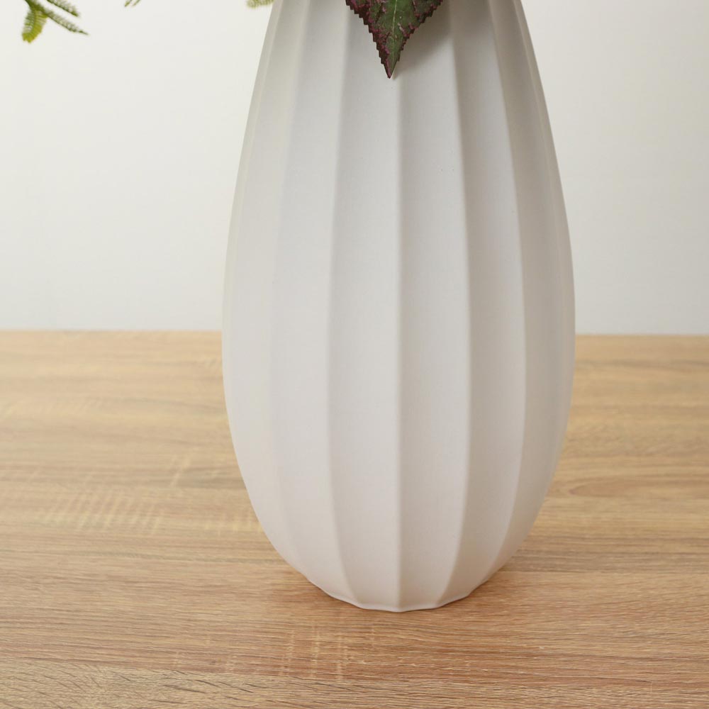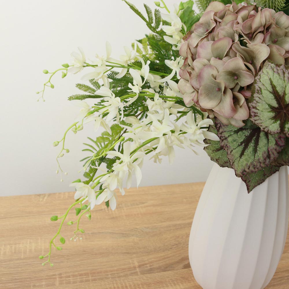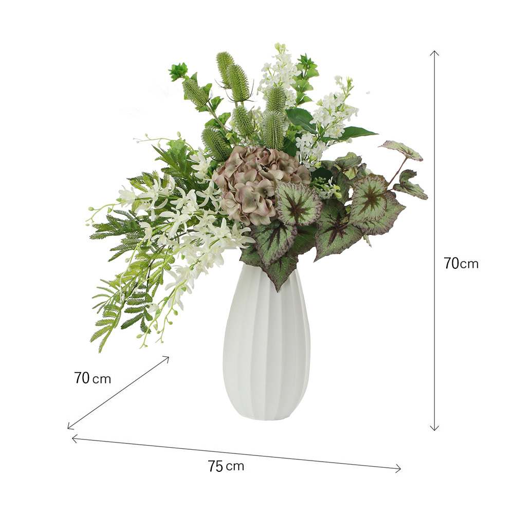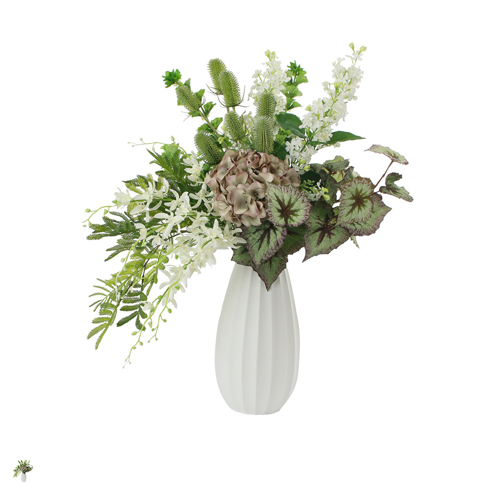 白やグリーンの爽やかな花々が上品な華やかさを添えています。美しい曲線の白いベースが、植物の生き生きとした表情を際立たせます。