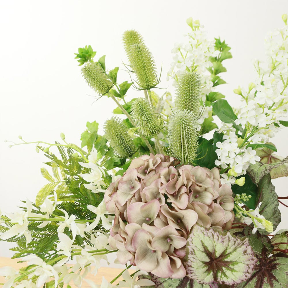 アンティークカラーの花々に個性的な葉を合わせた、シックでモダンなアーティフィシャルフラワーアレンジメント。