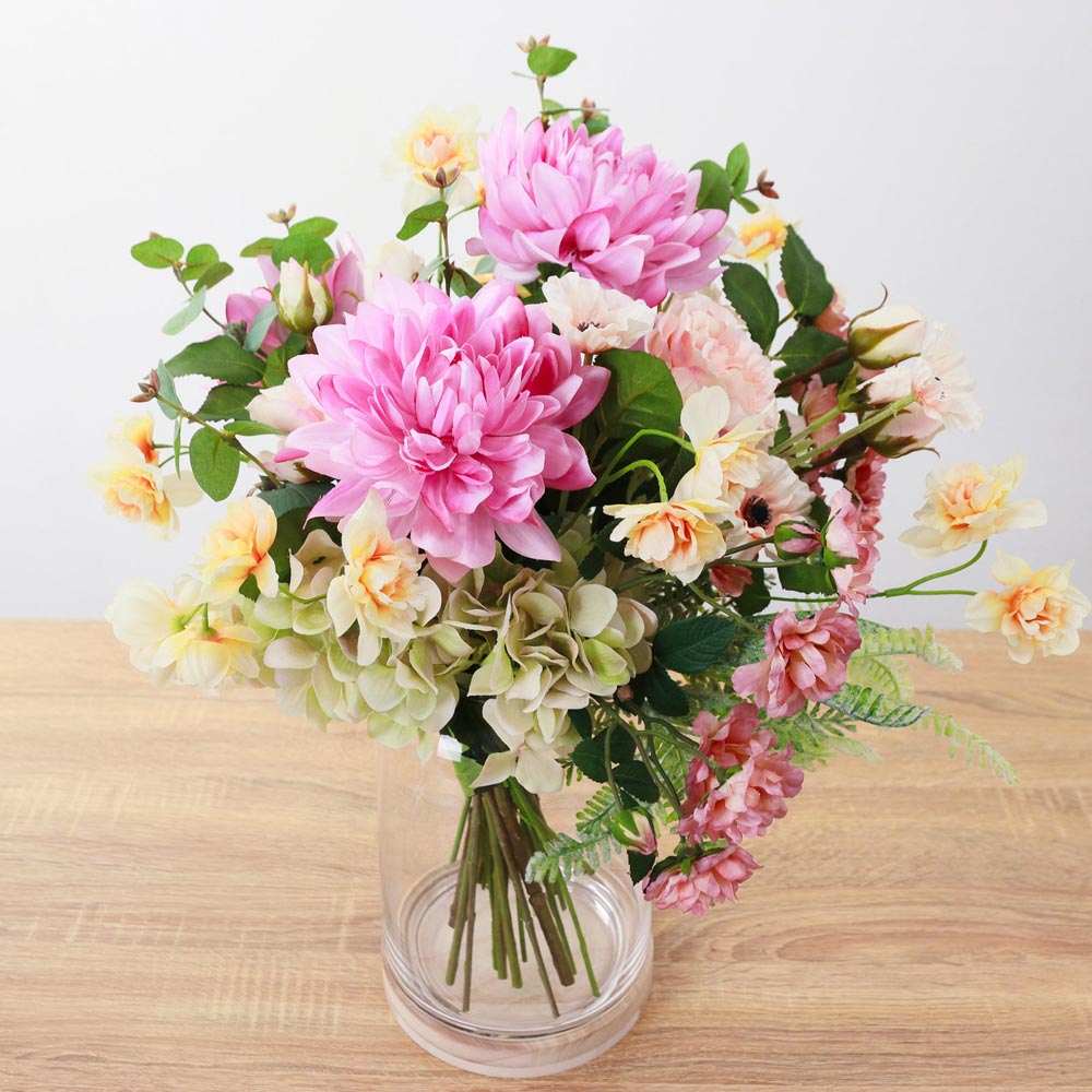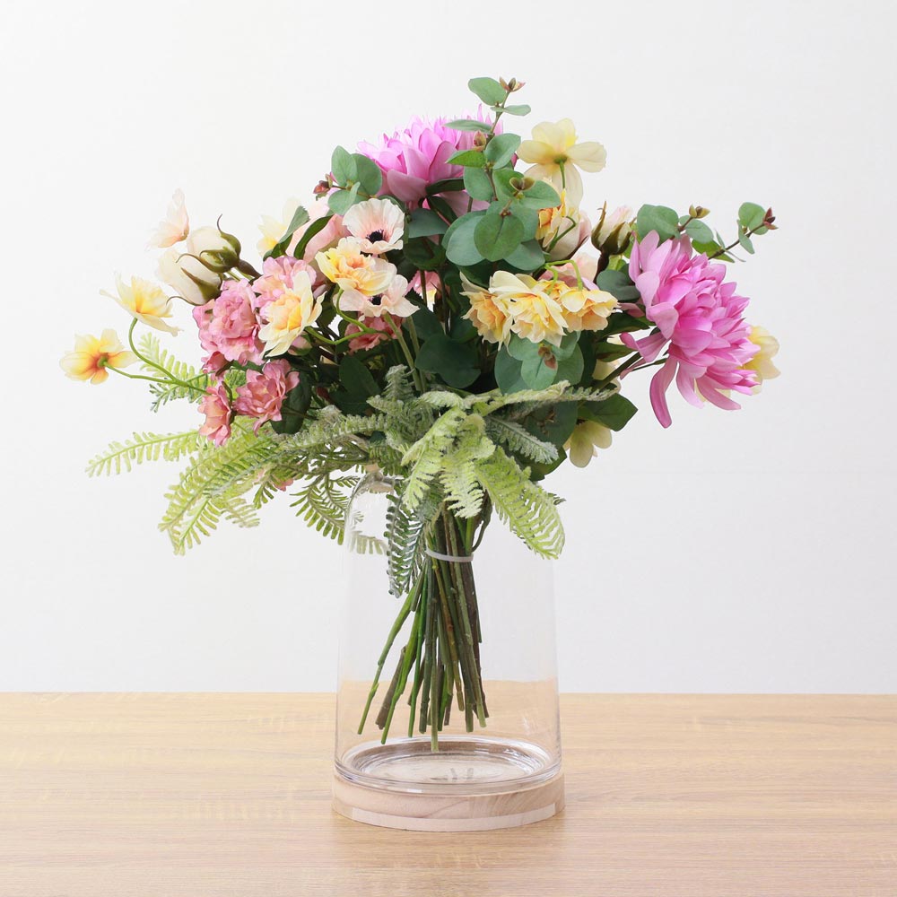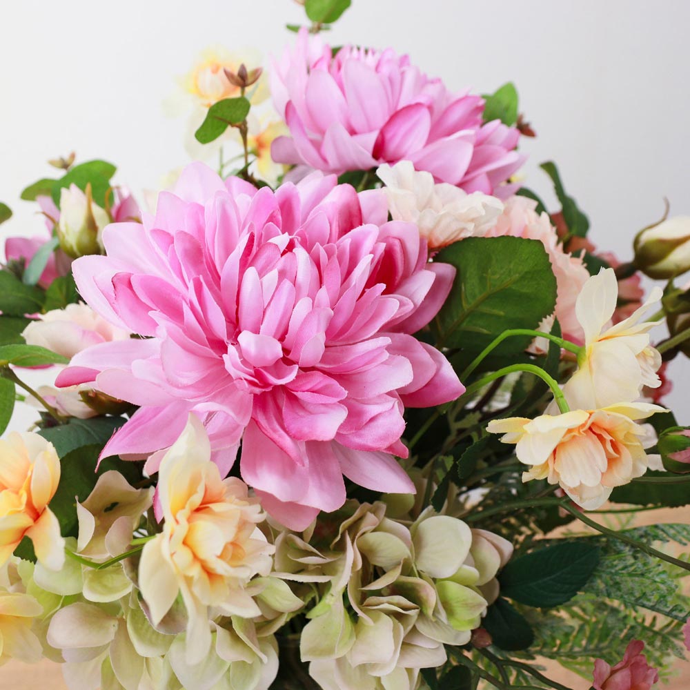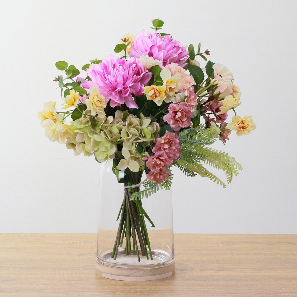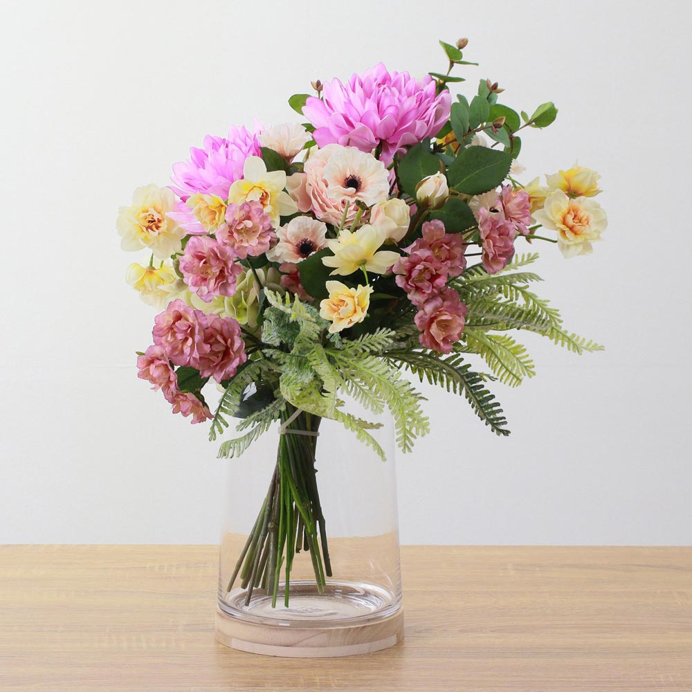 華やかなピンクのダリアを主役に、スイセンやカーネーションなど、春を感じさせる花々を束ねたアーティフィシャルフラワーアレンジメント。