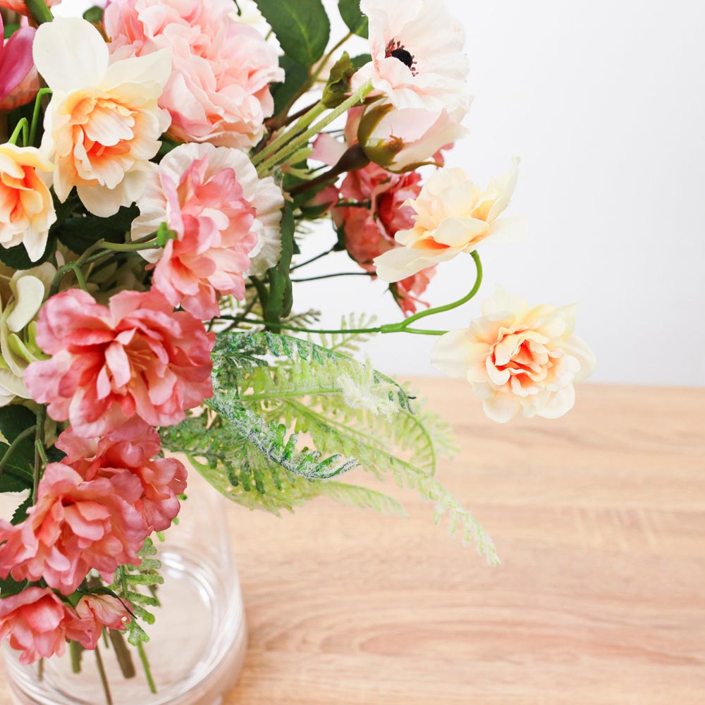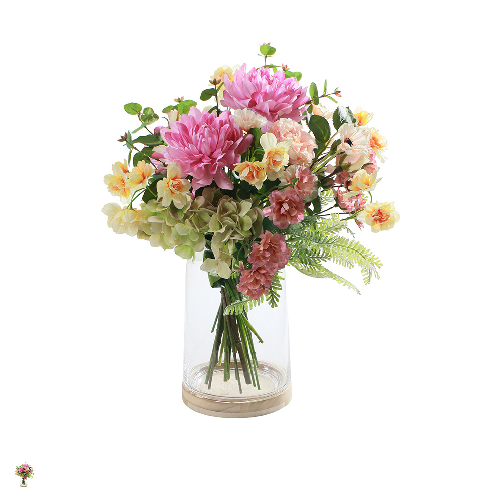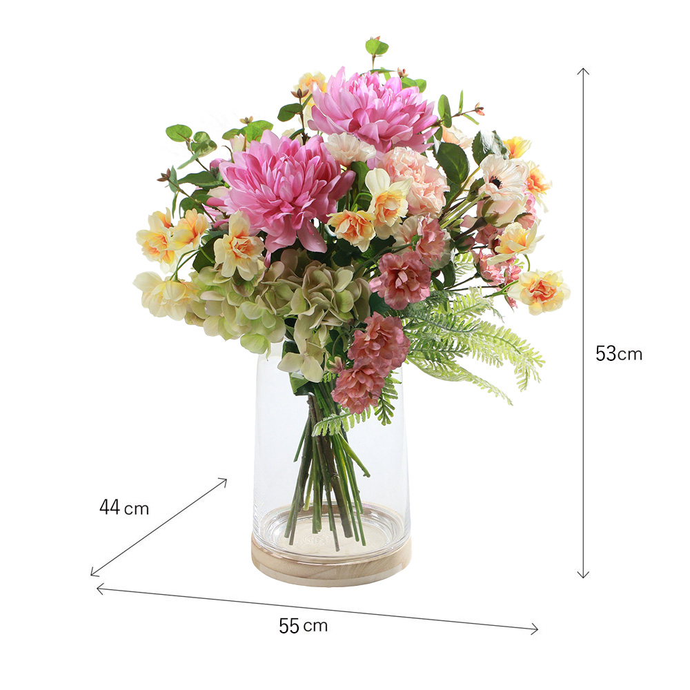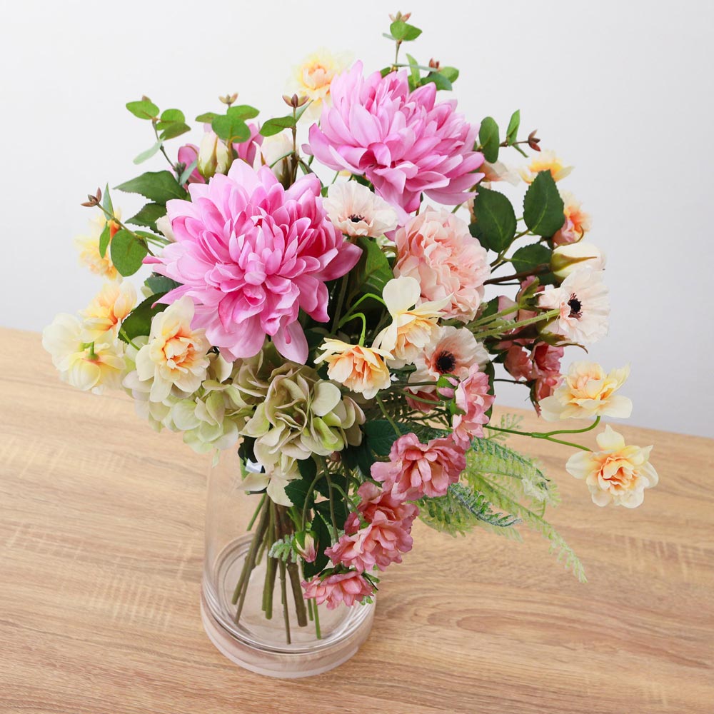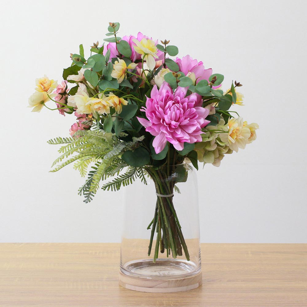 華やかなピンクのダリアを主役に、スイセンやカーネーションなど、春を感じさせる花々を束ねたアーティフィシャルフラワーアレンジメント。