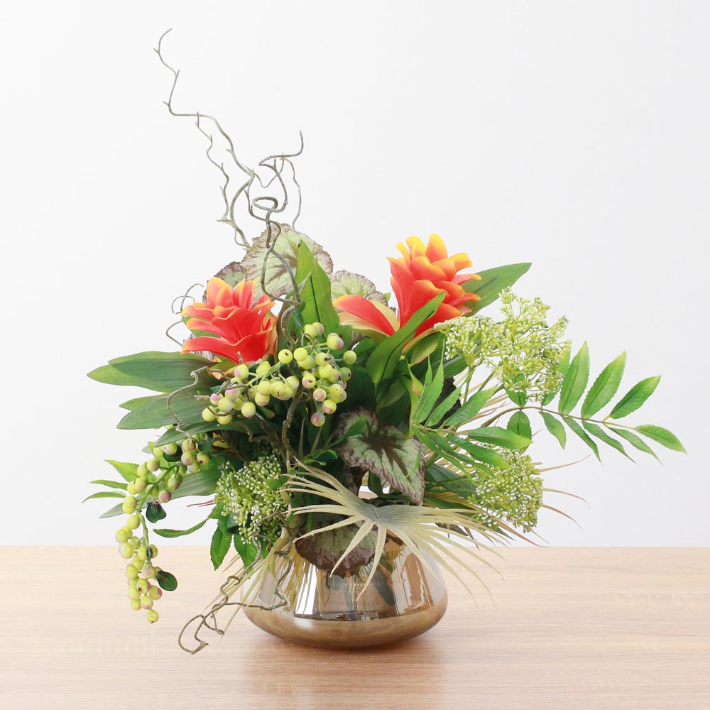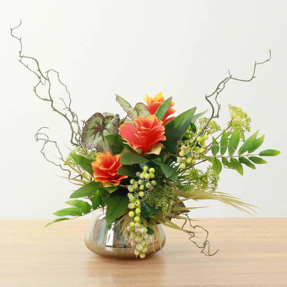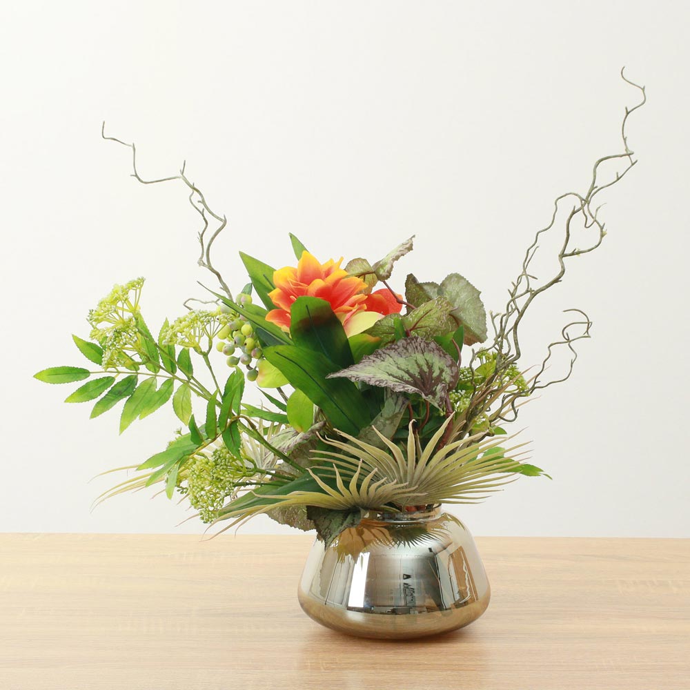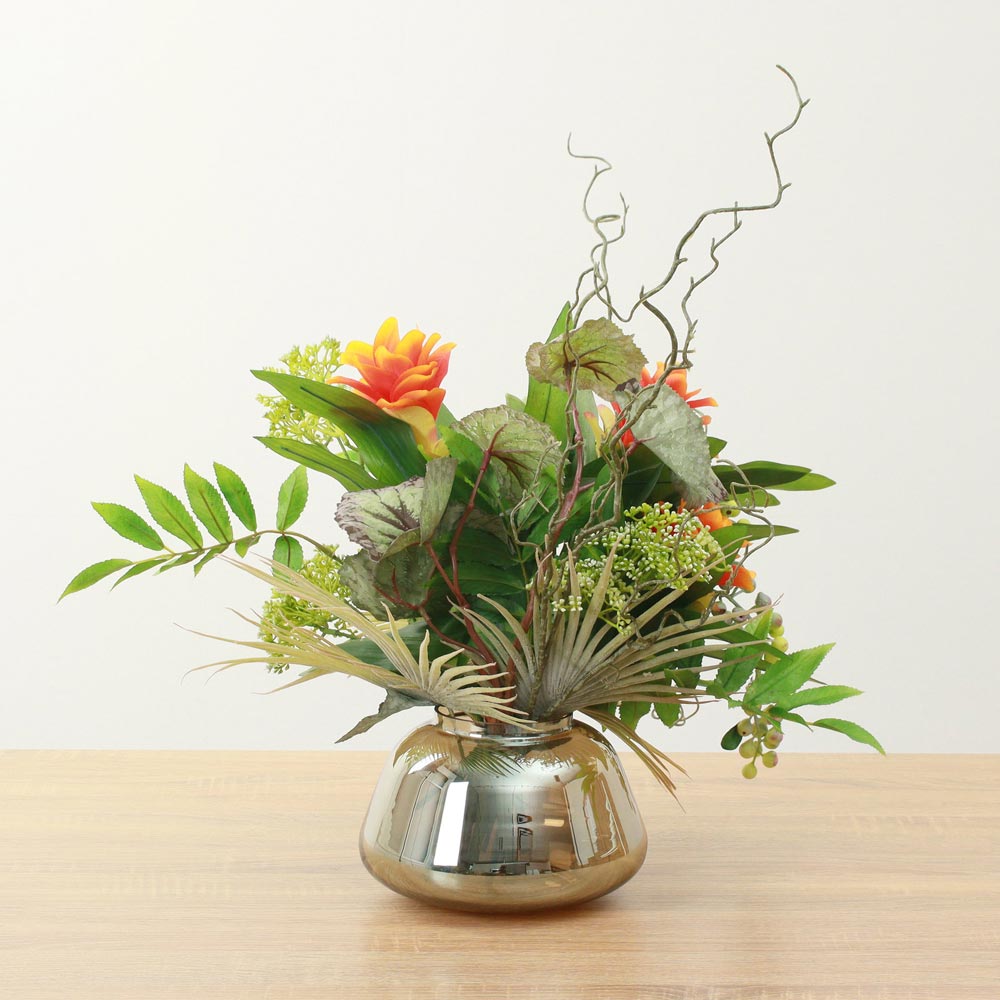 鮮やかなオレンジ色の花が目を惹く、エネルギッシュなアーティフィシャルフラワーアレンジメント。