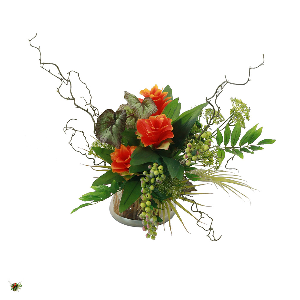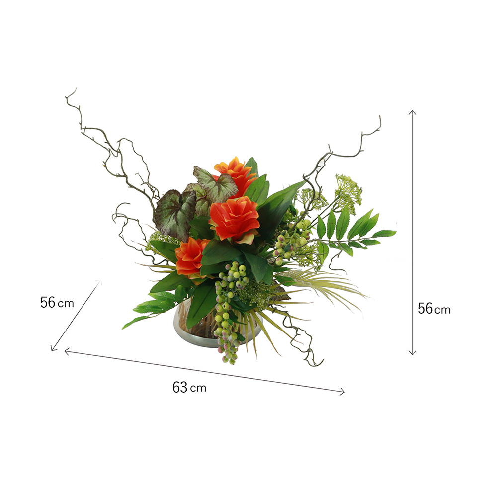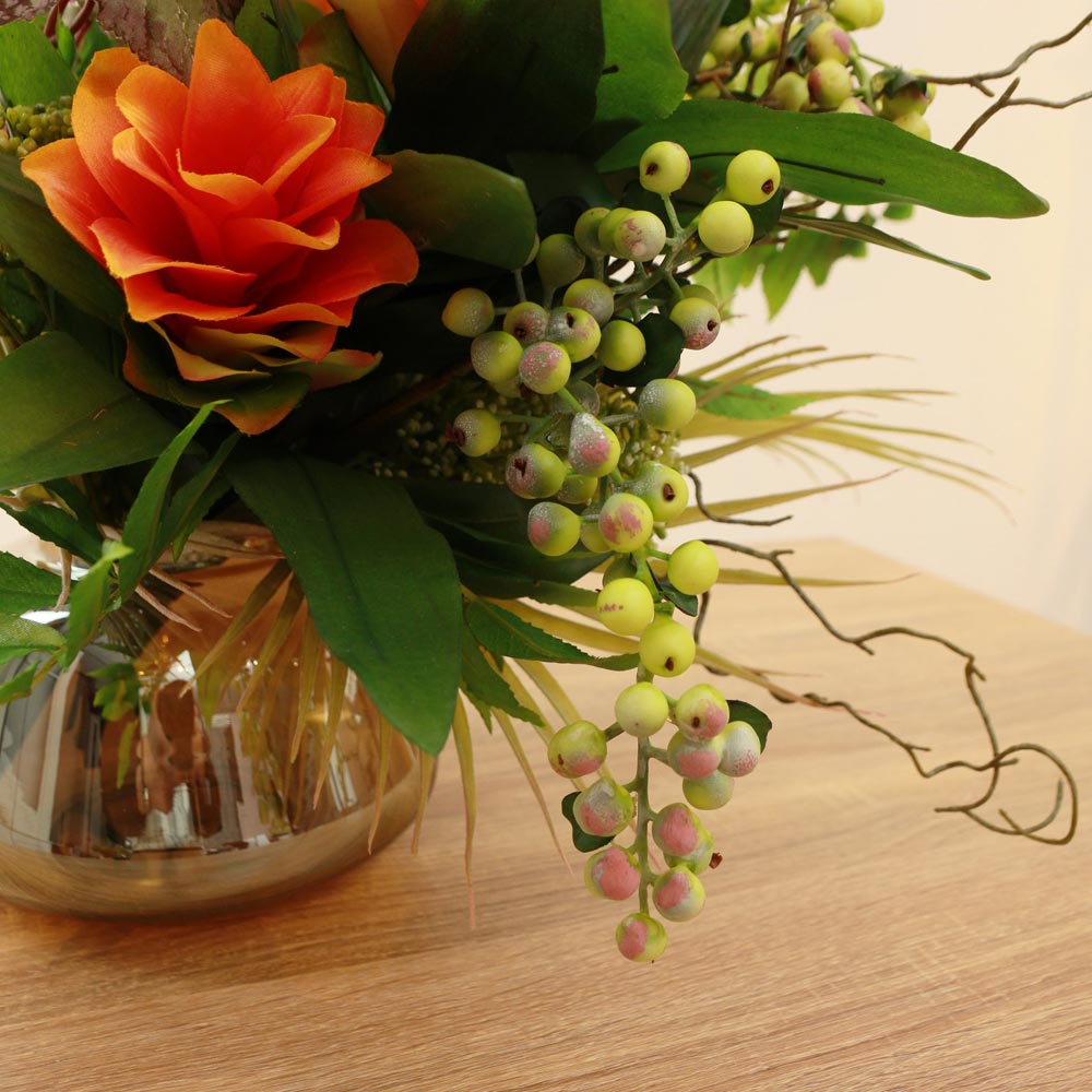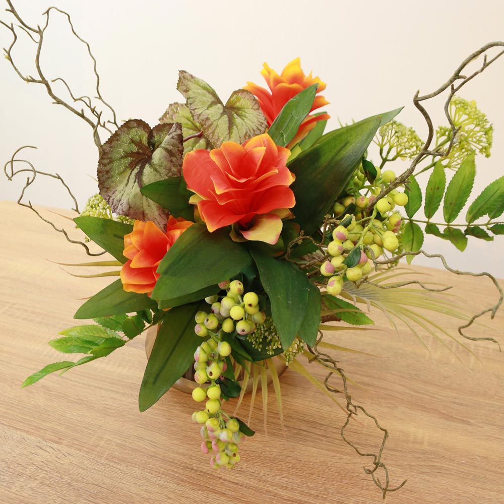 鮮やかなオレンジ色の花が目を惹く、エネルギッシュなアーティフィシャルフラワーアレンジメント。