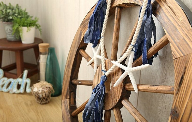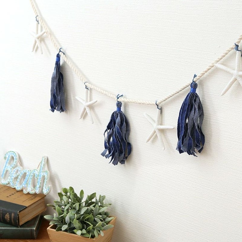 切りっぱなしのラフなデニムのタッセルと、ヒトデのモチーフをつなげたガーランド。