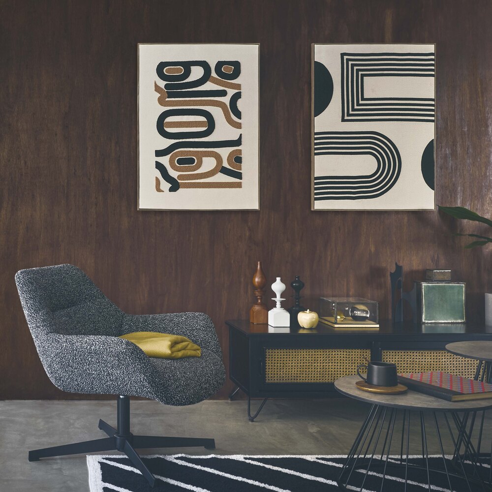 円や四角、U字型などの幾何学模様を大胆にレイアウトしたモダンなアートパネル。