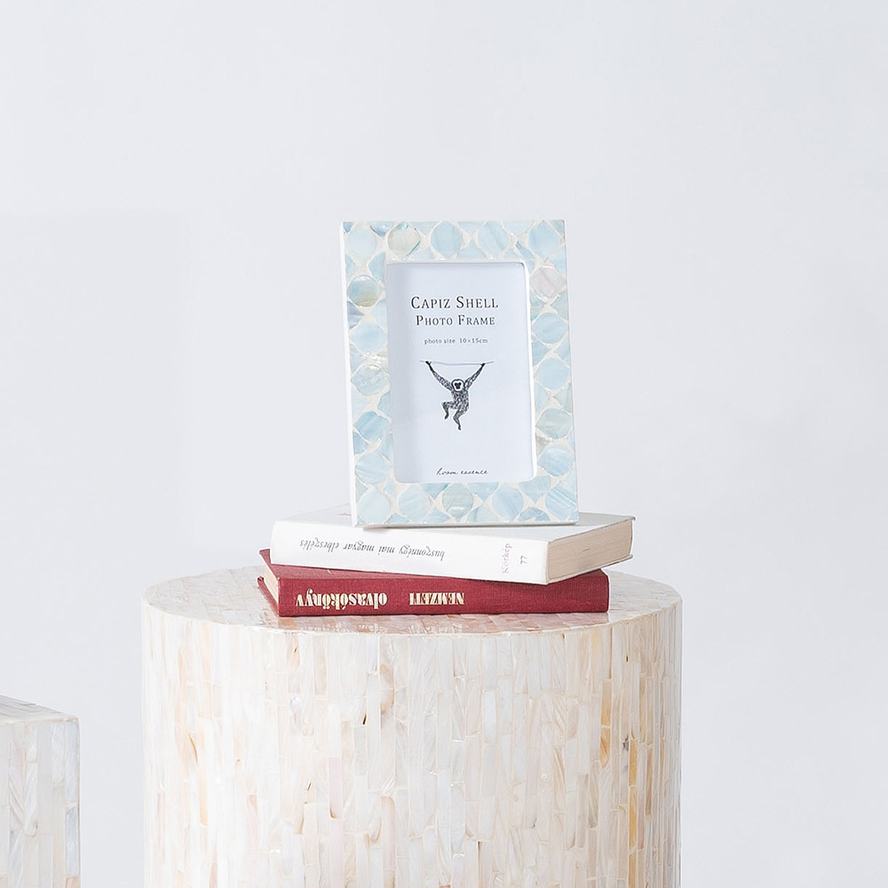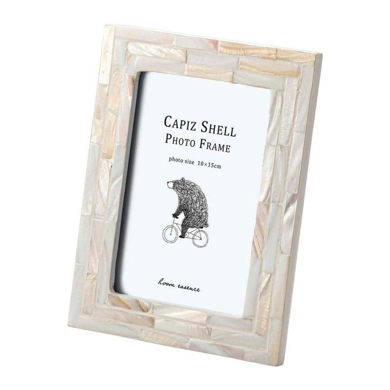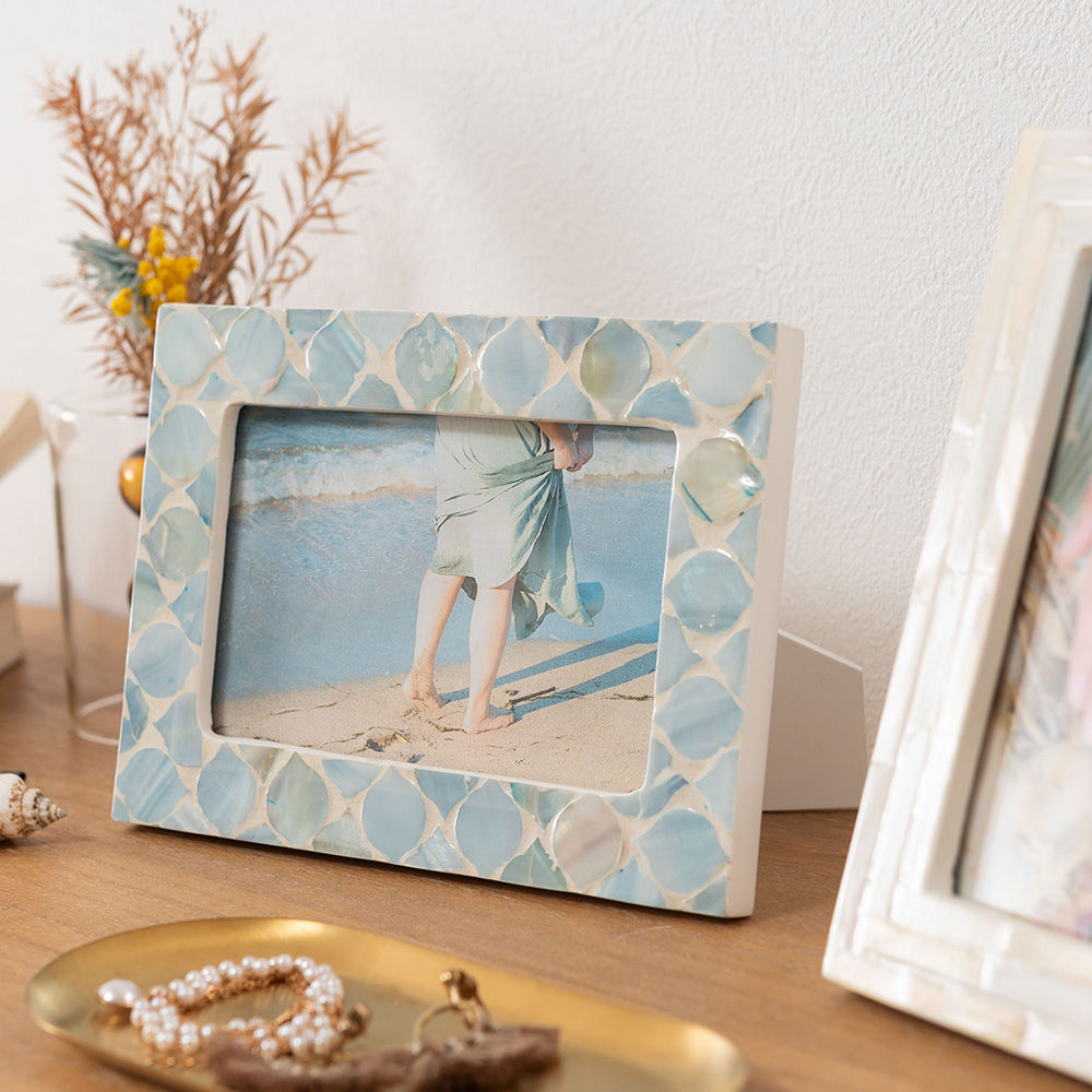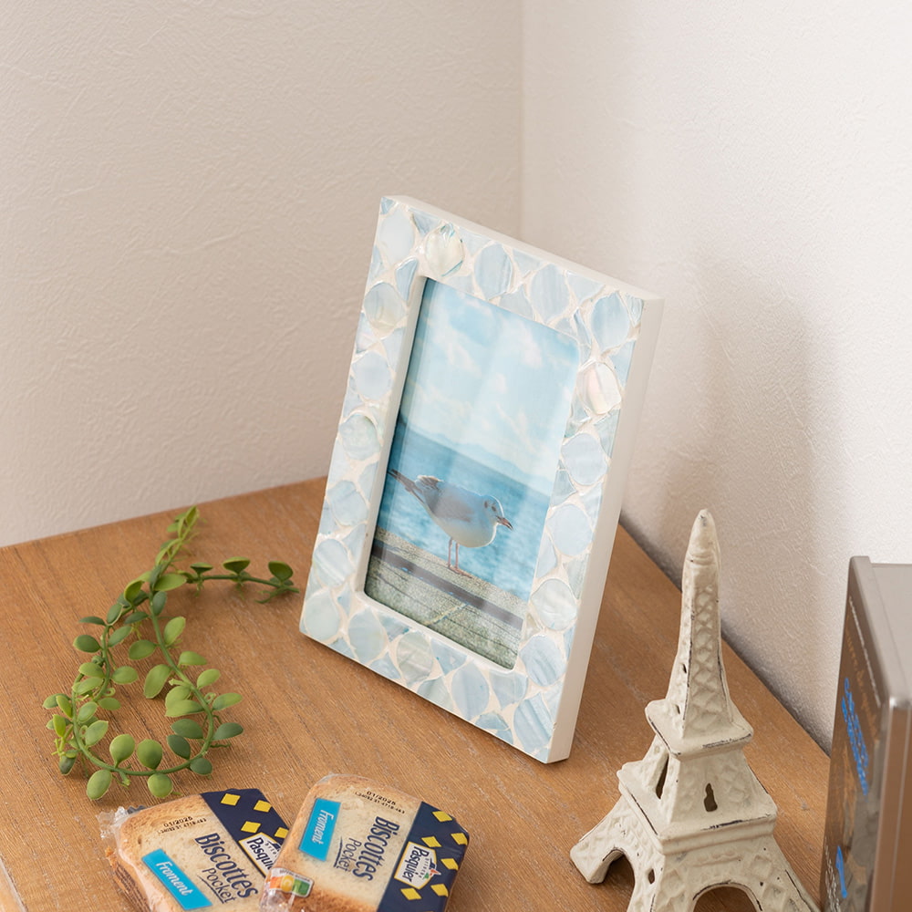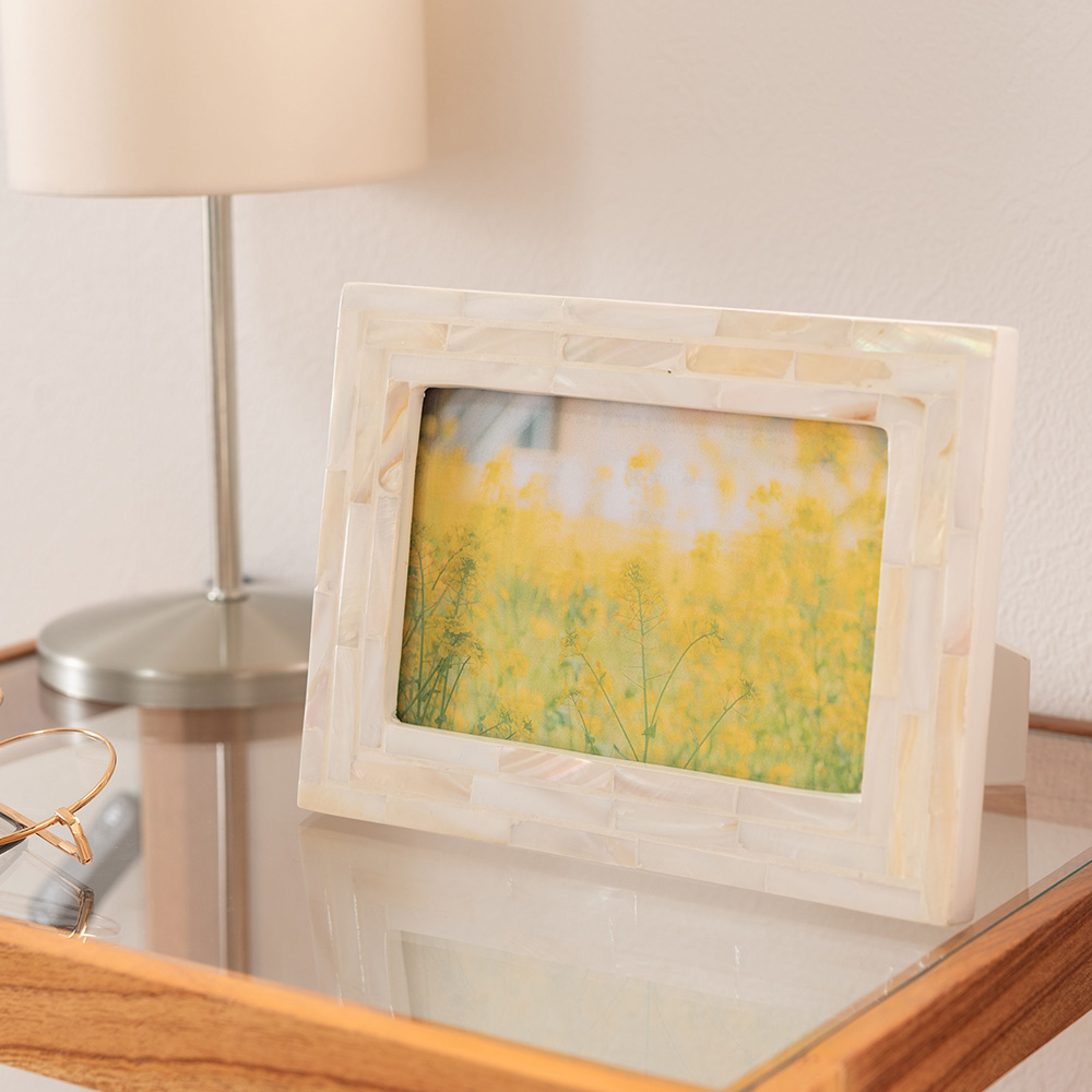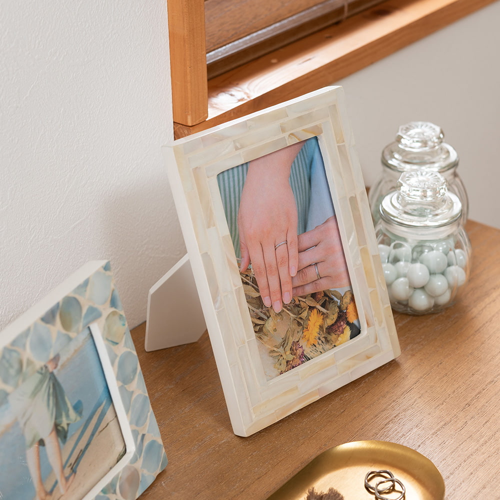 真珠のような上品な輝きが美しい、マザーオブパールをあしらったフォトフレーム。