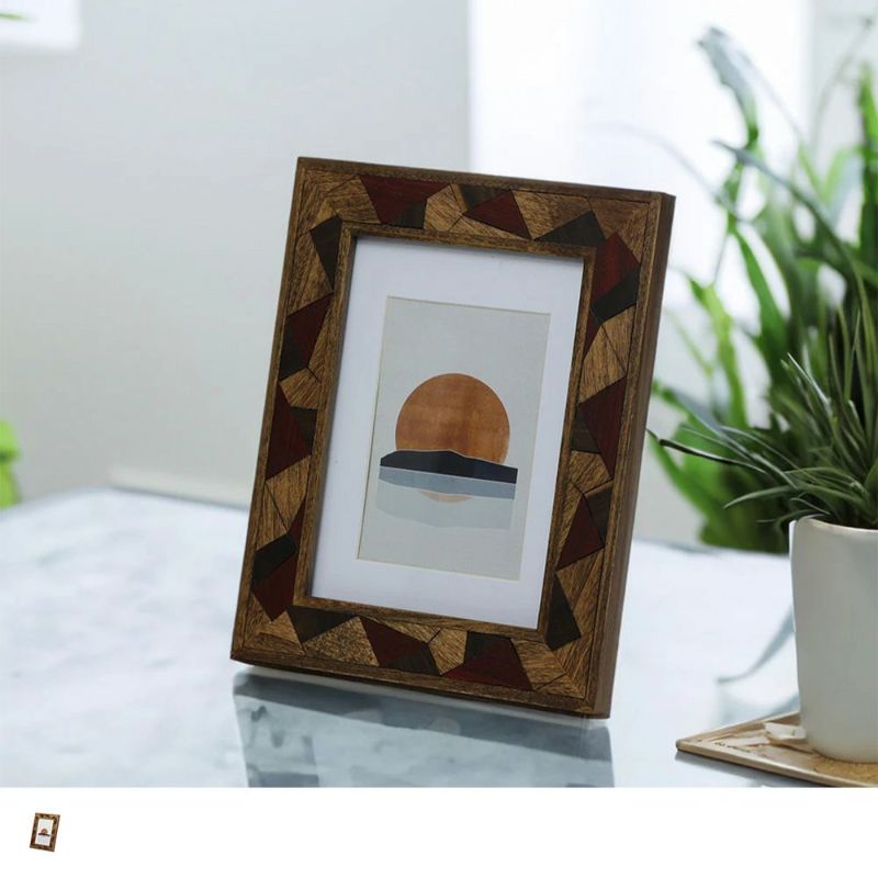 様々な色の木を貼り合わせたユニークなデザインのフォトフレームです。