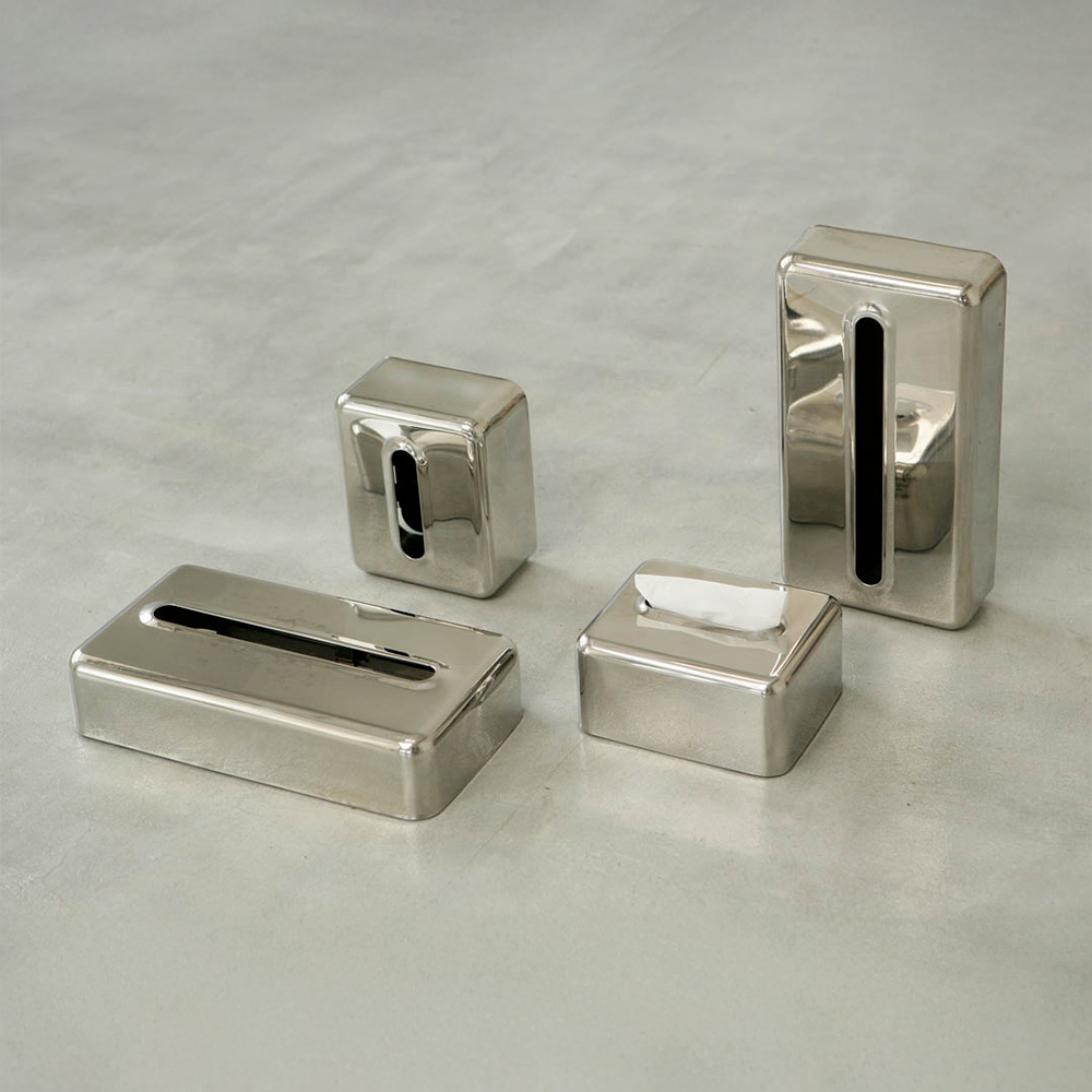 角のコロンっとしたフォルムが優しい見た目のステンレスのティッシュケースです。