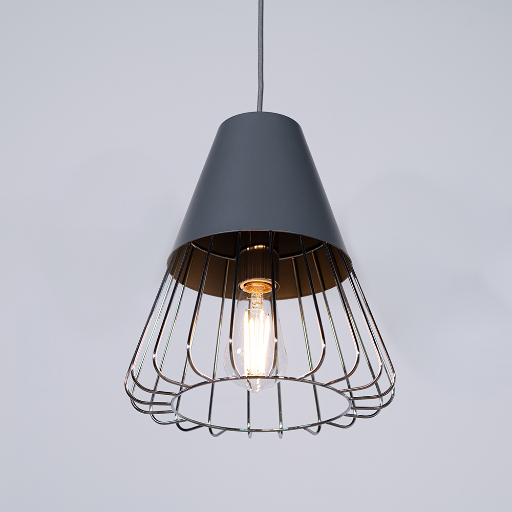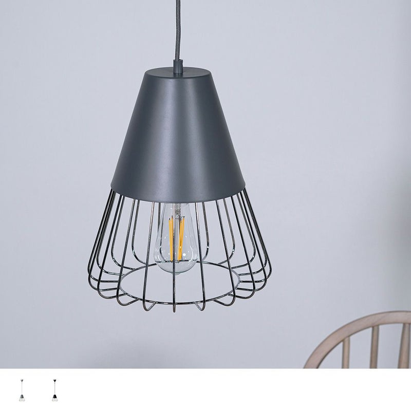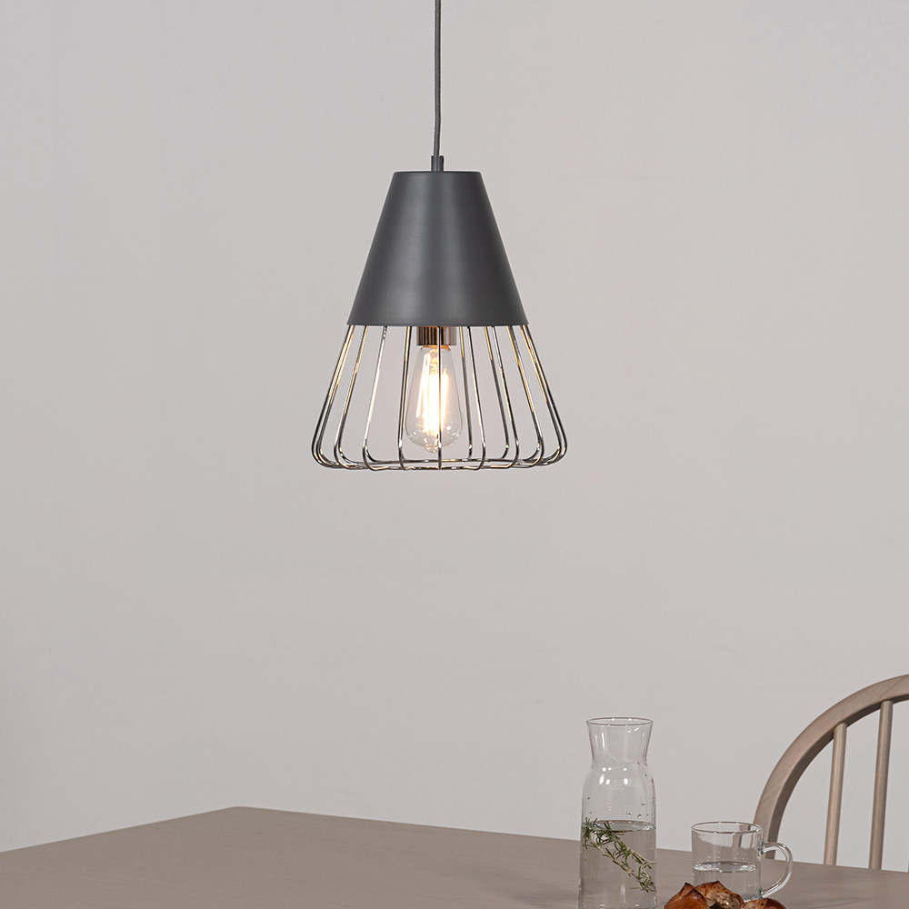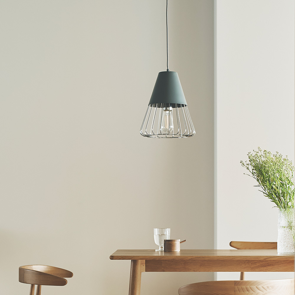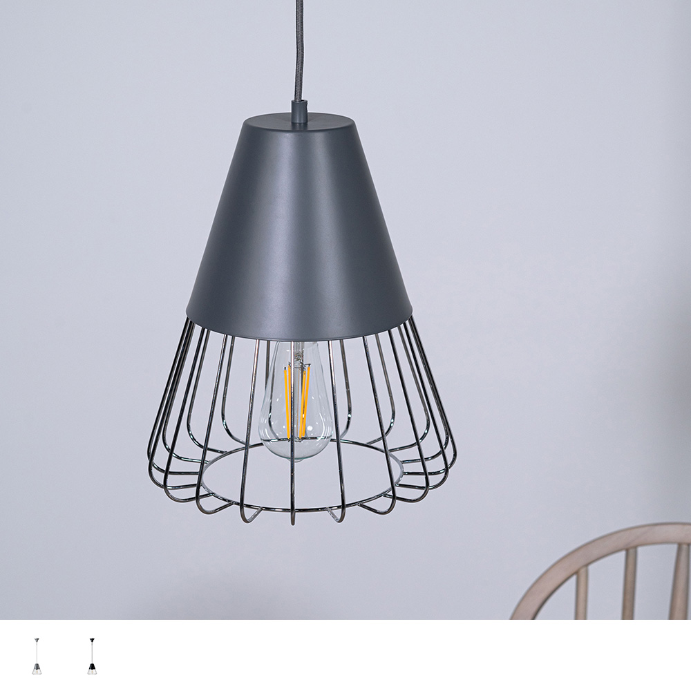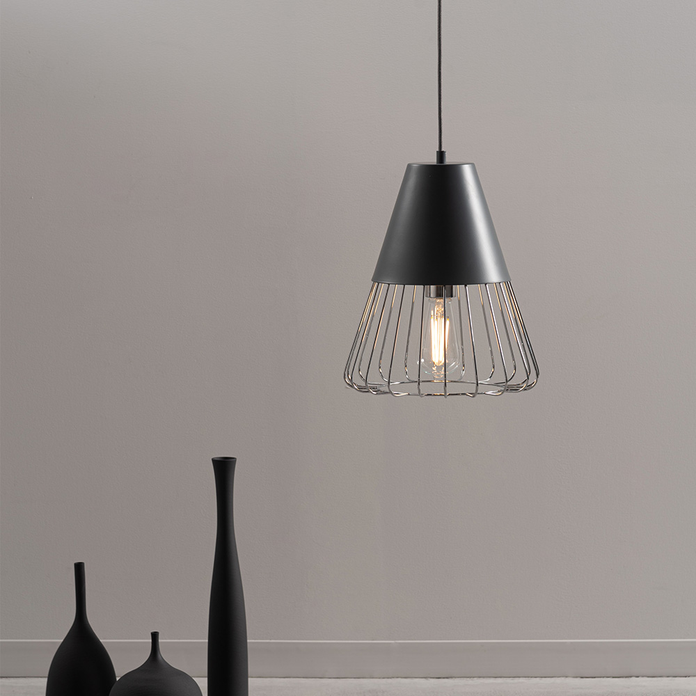 マットな質感のスチールと軽やかなワイヤーフレームを組み合わせたペンダントライト。