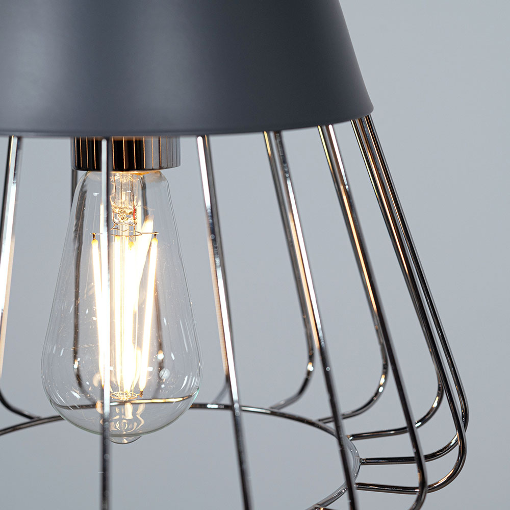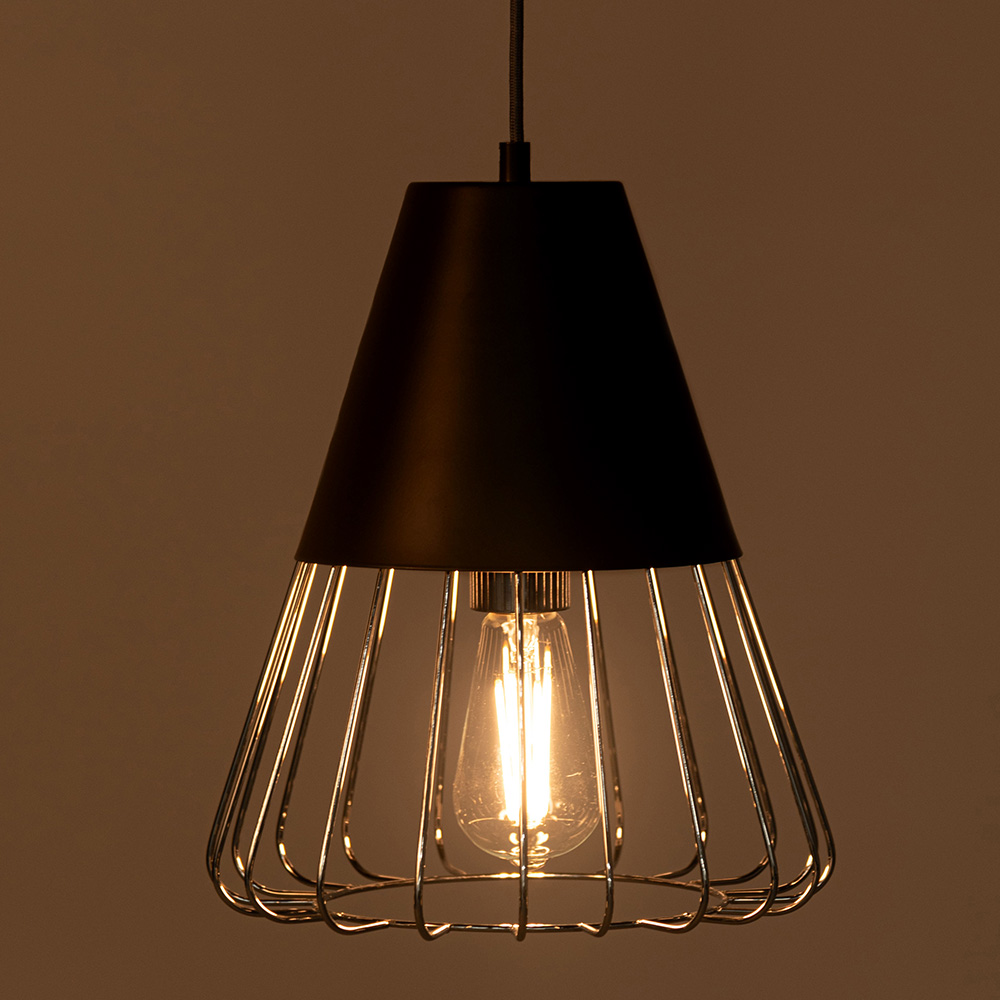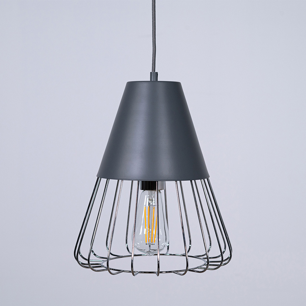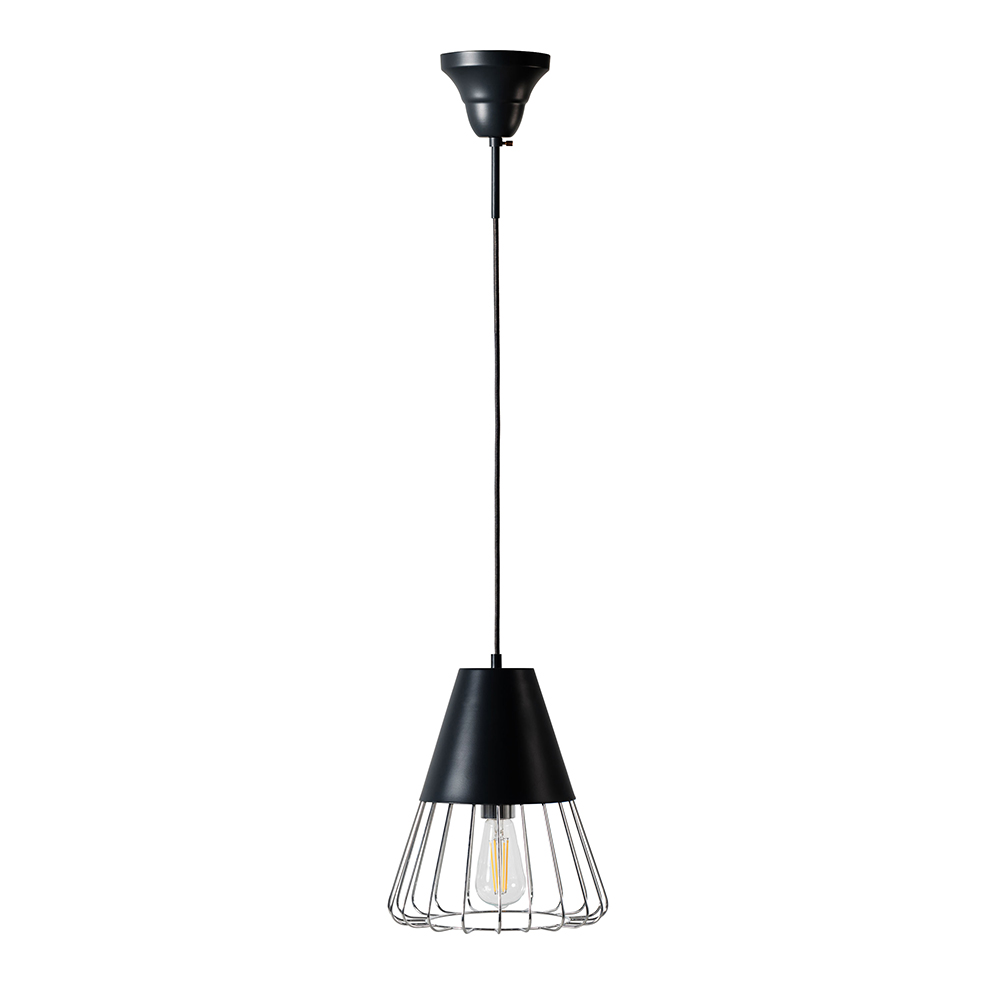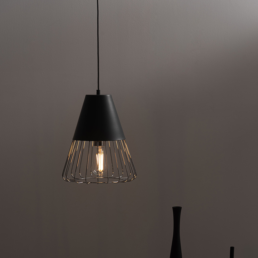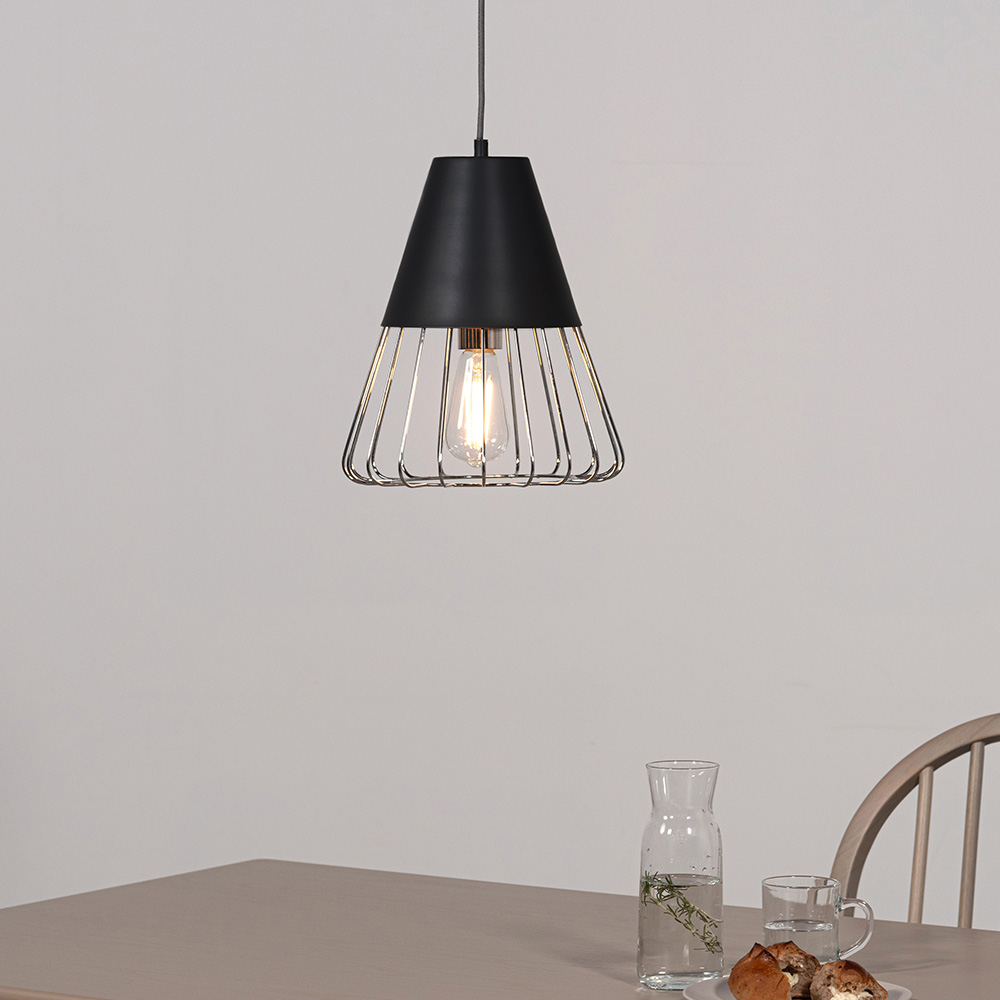 マットな質感のスチールと軽やかなワイヤーフレームを組み合わせたペンダントライト。