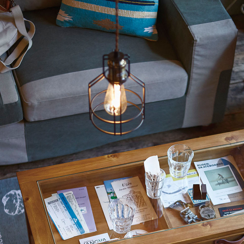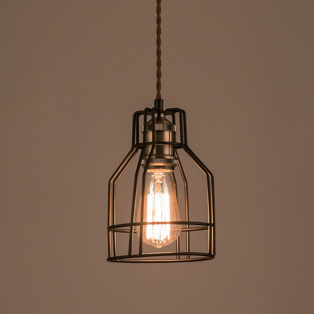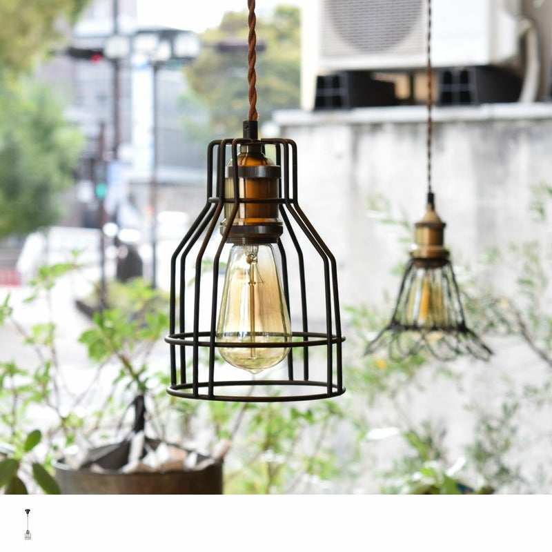 鳥かごのようなガードの中から、付属のエジソン電球が温かい光を放ち、壁や天井に印象的な影を落とします。
