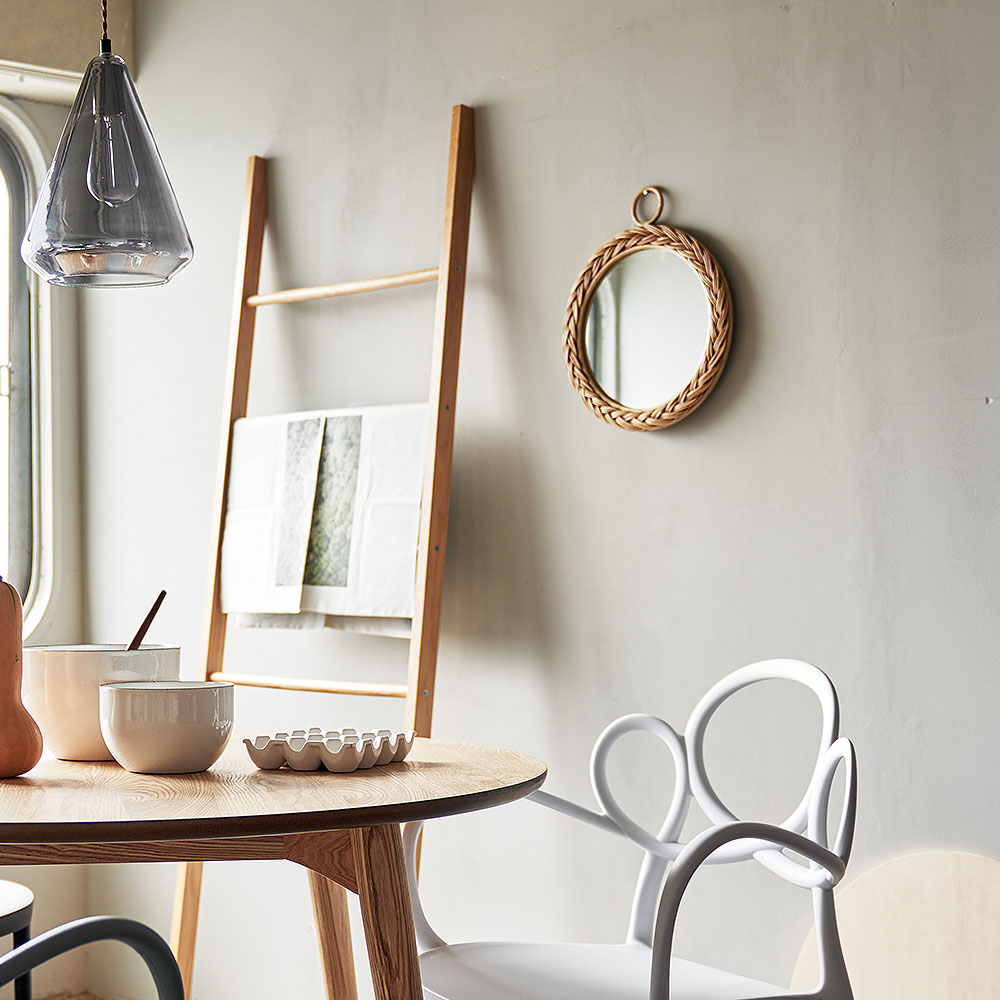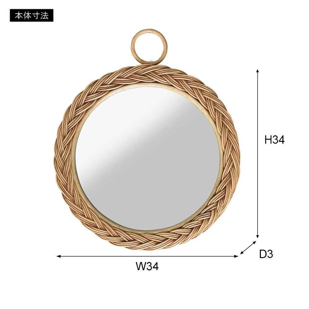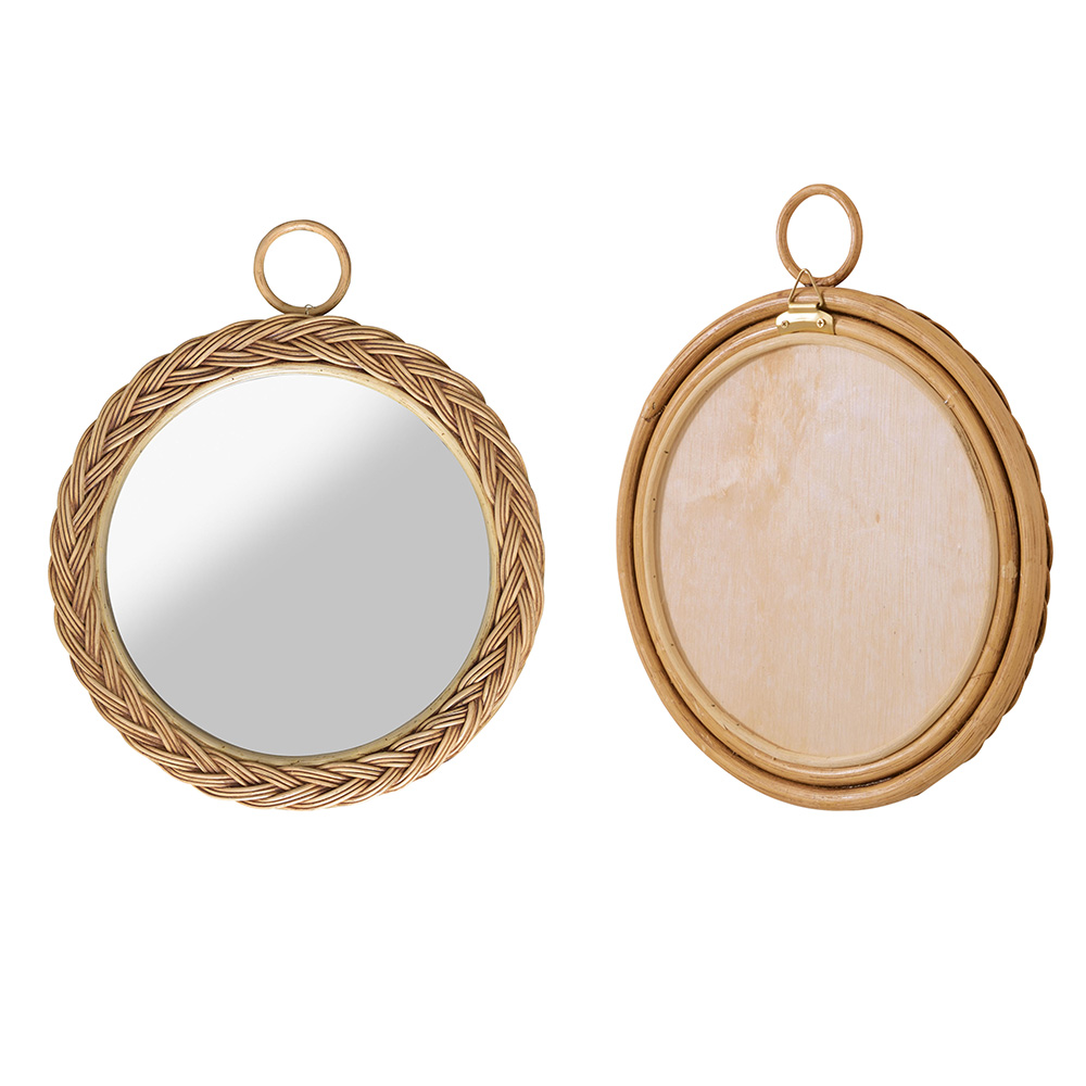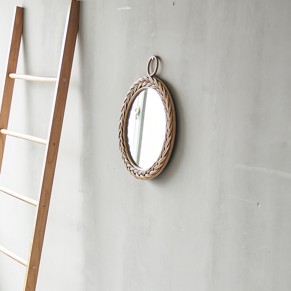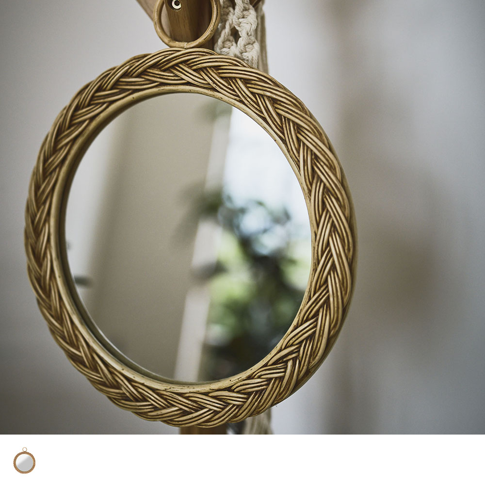 一つひとつ丁寧に手で編まれた、ラタンのフレームが温かみのあるミラー。