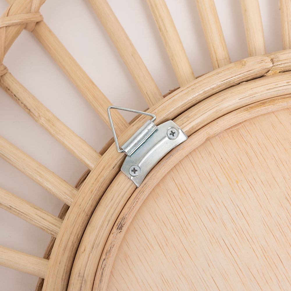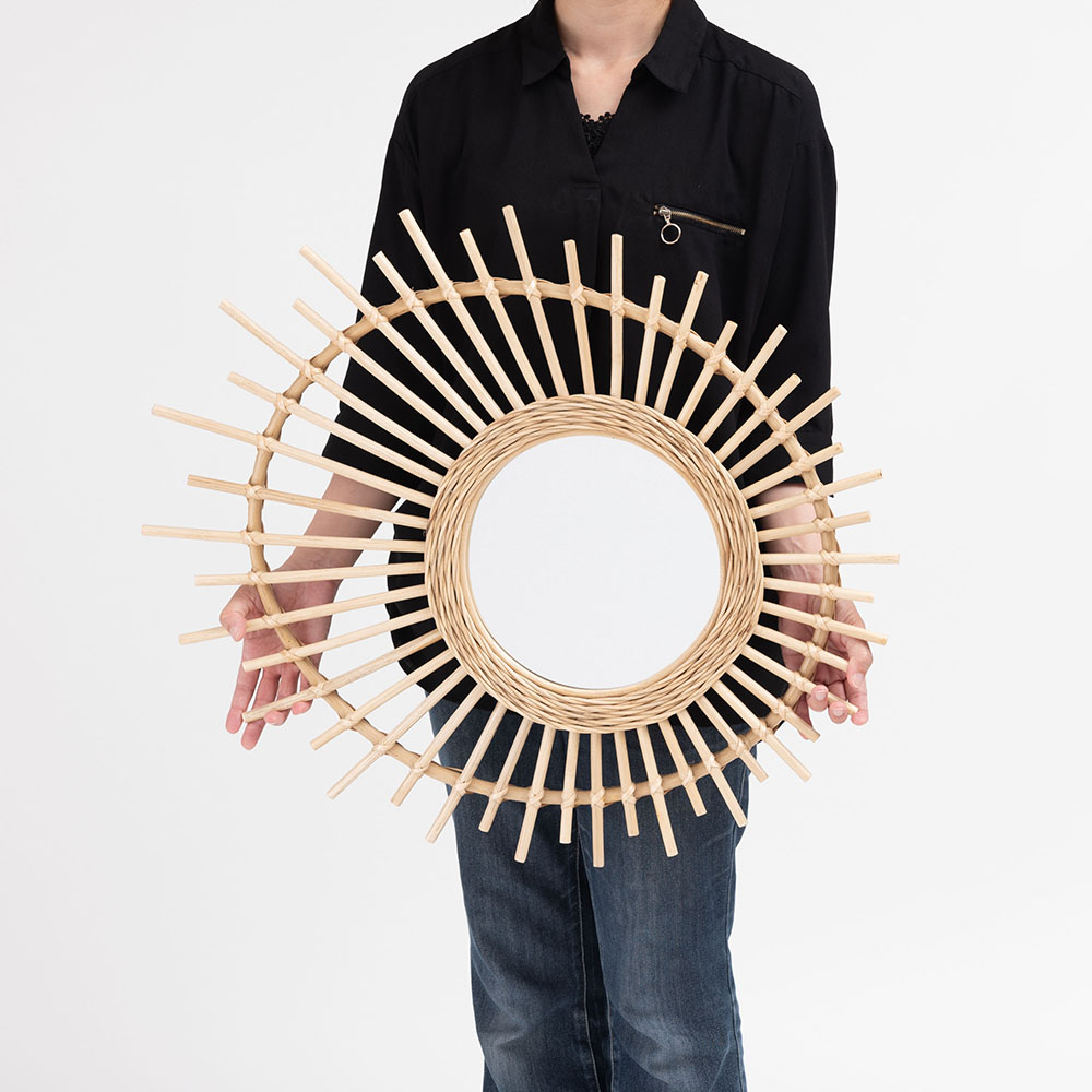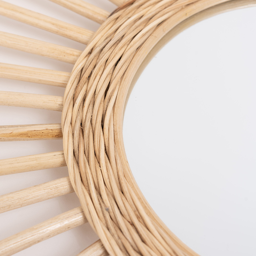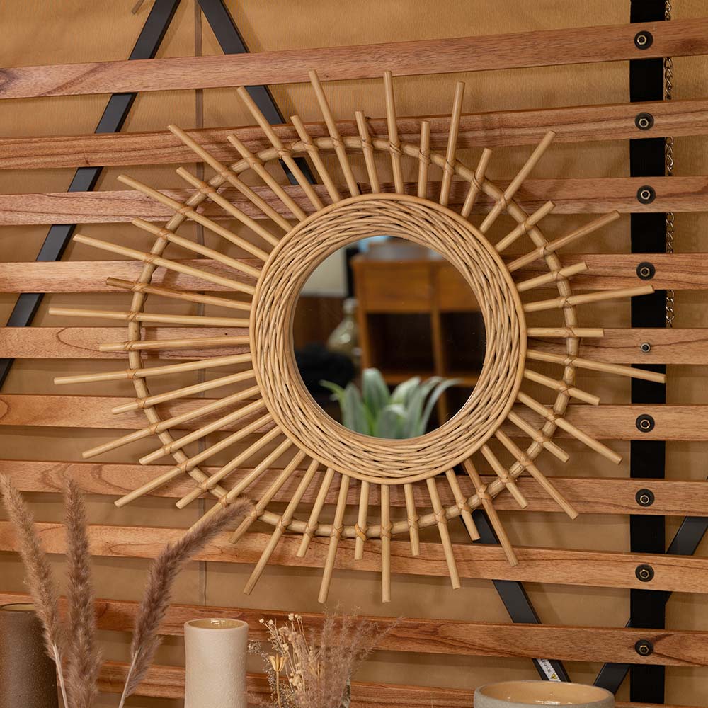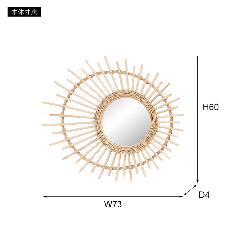 天然素材のラタンを丁寧に編み上げた、オブジェのようなミラー。放射状に広がる華やかなデザインは、お部屋の主役として空間をぱっと明るく彩ります。