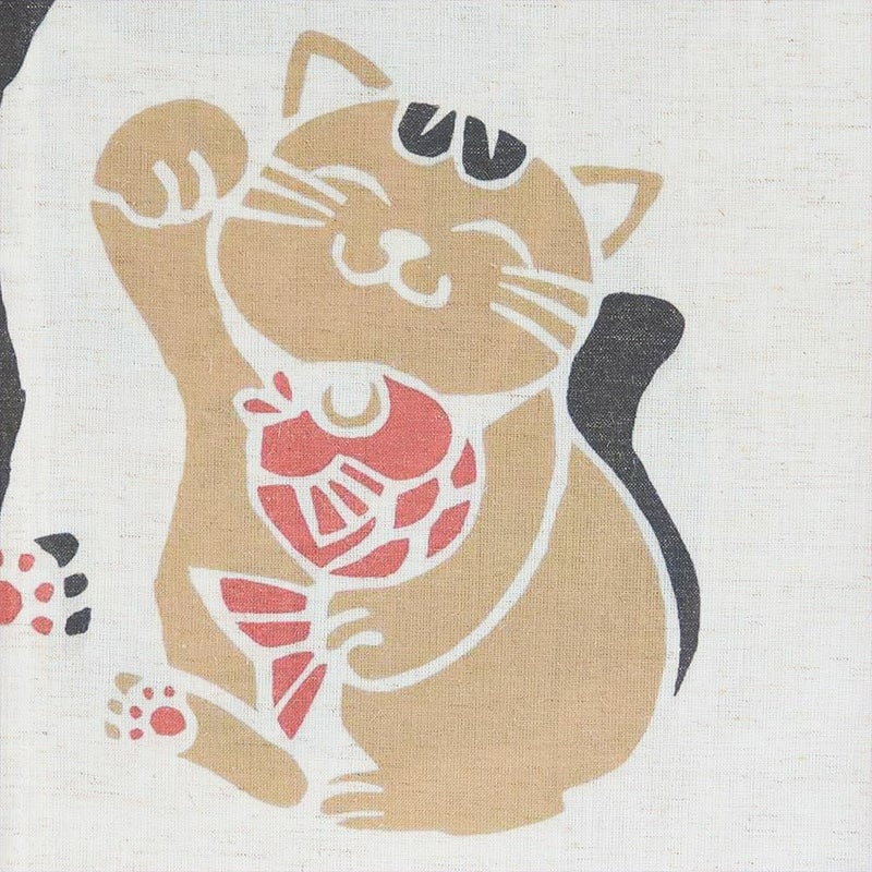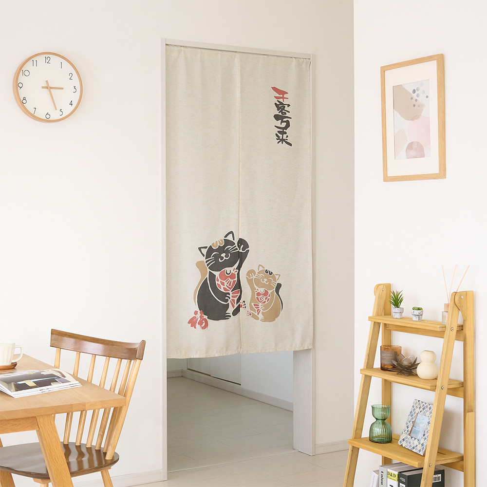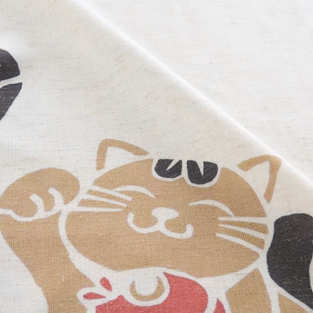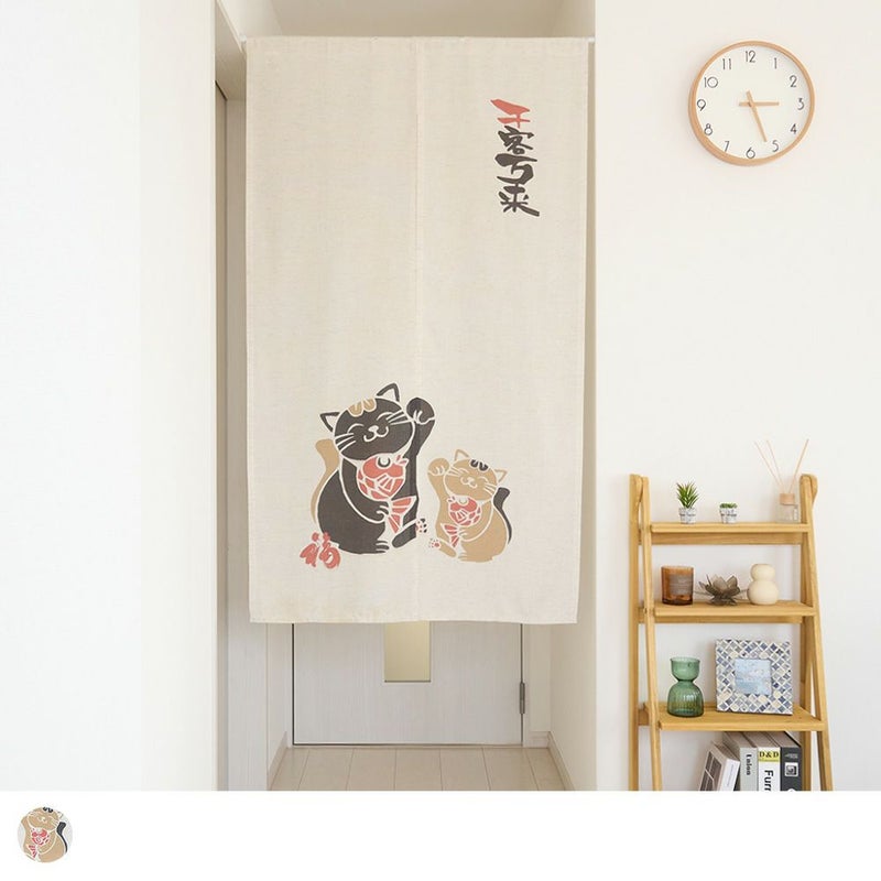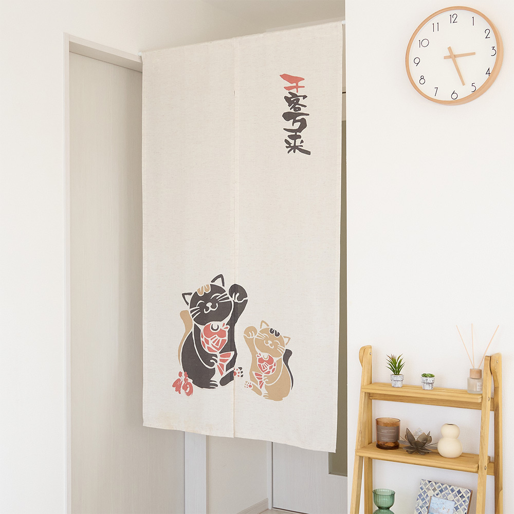 にこやかな招き猫が並ぶ、縁起のよいデザインののれん。