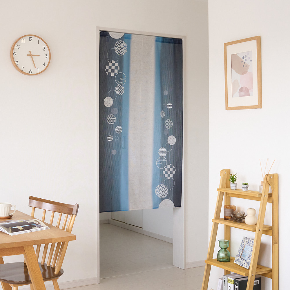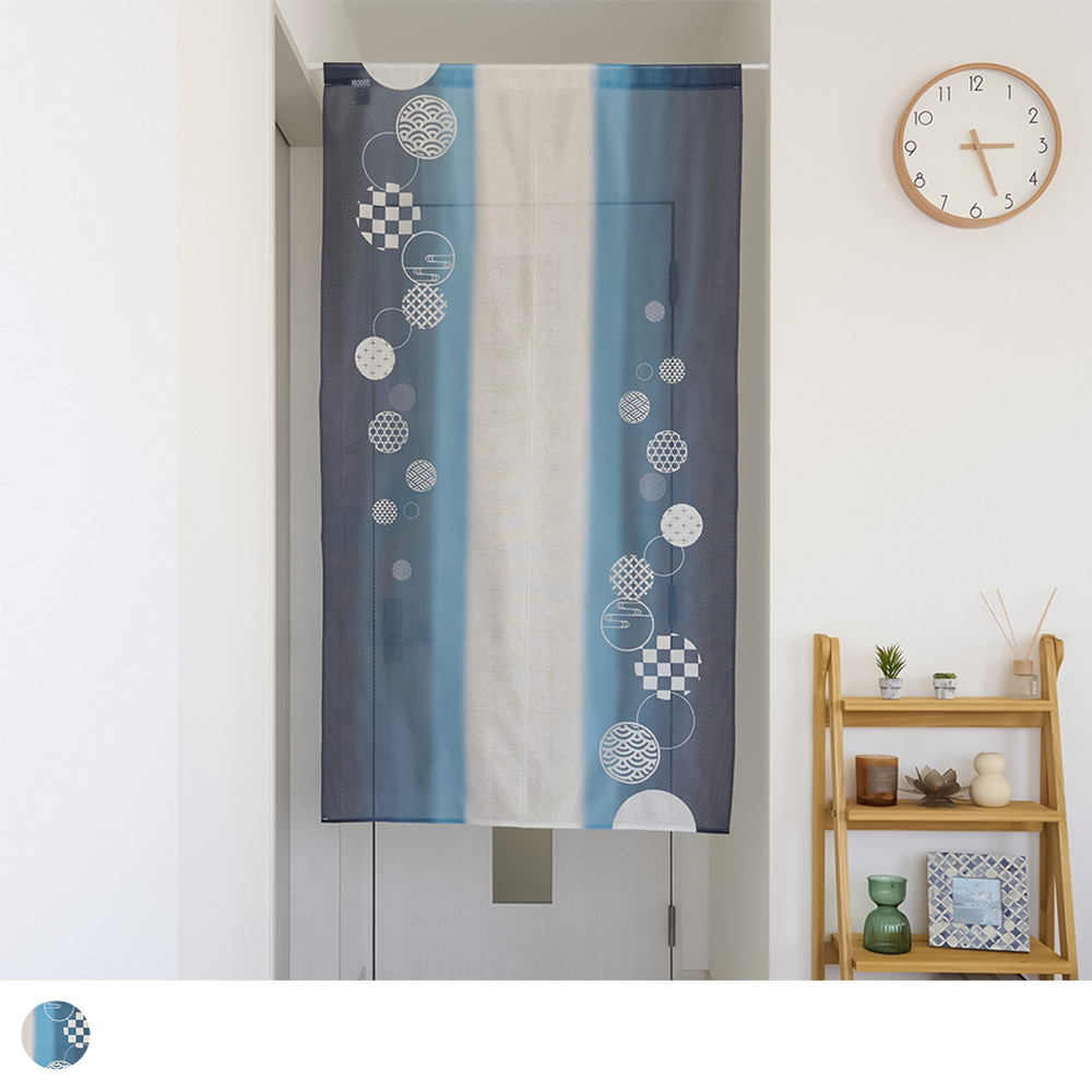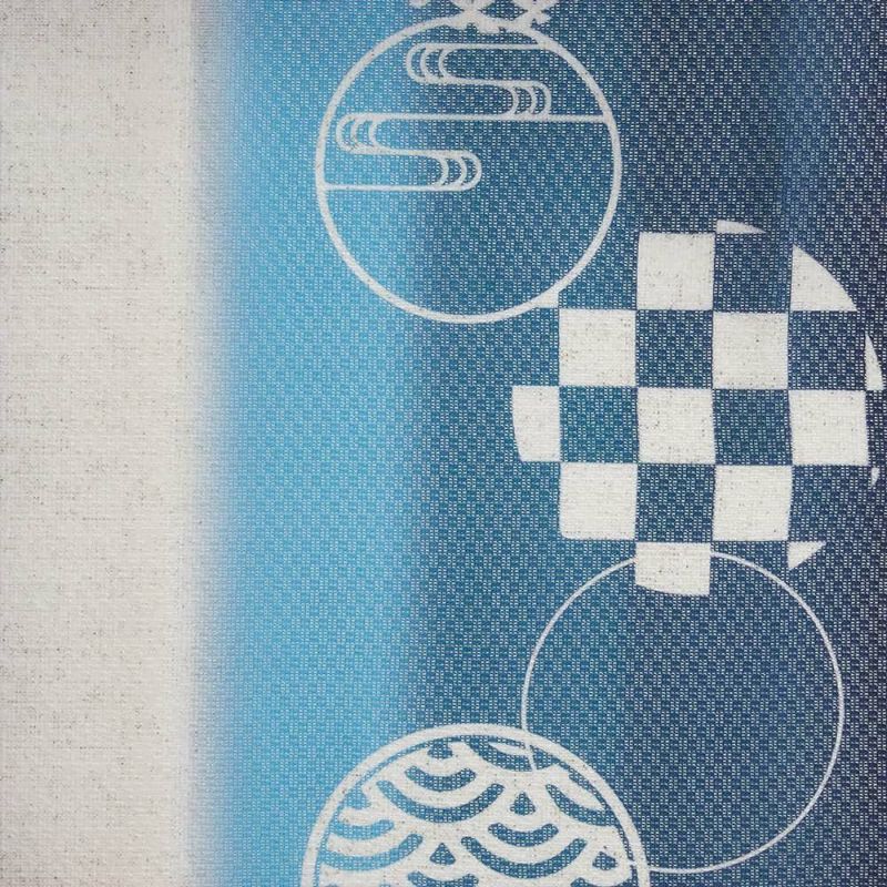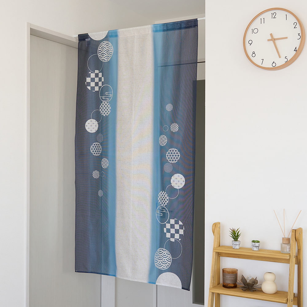 藍と白のグラデーションに、伝統的な和紋をあしらった上品なのれんです。