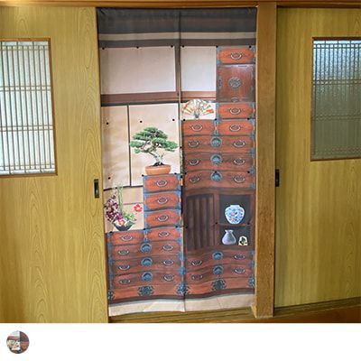 一段短くすると、棚が一段なくなる遊び心溢れるデザイン。 短くするたびに見えるデザインが変わるおもしろい和のれん。