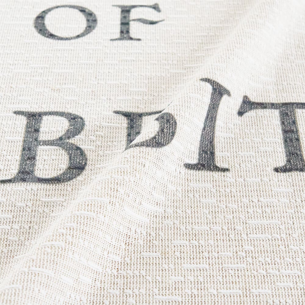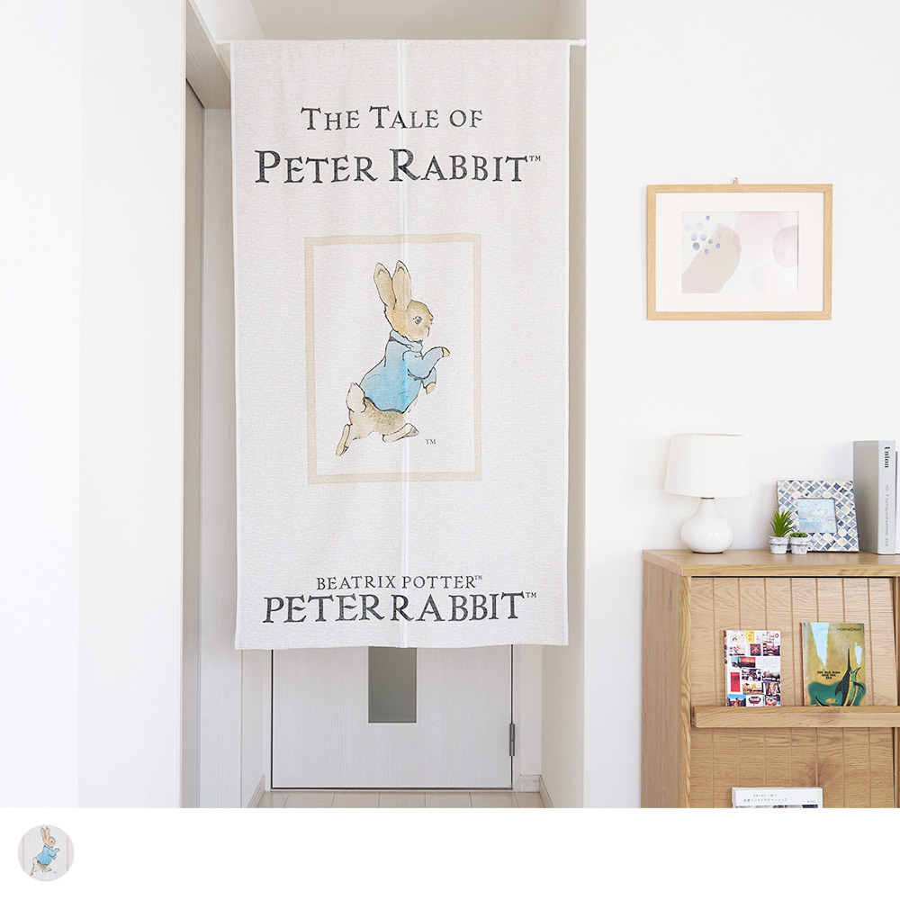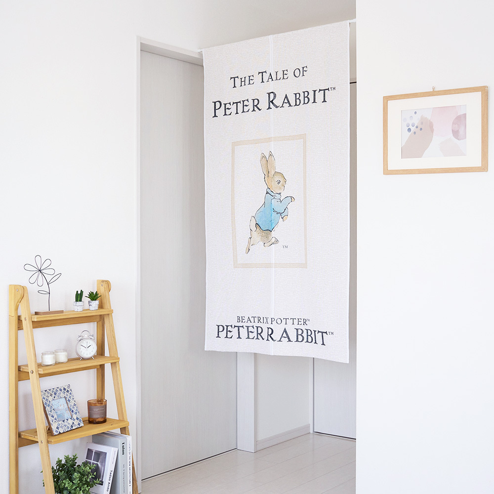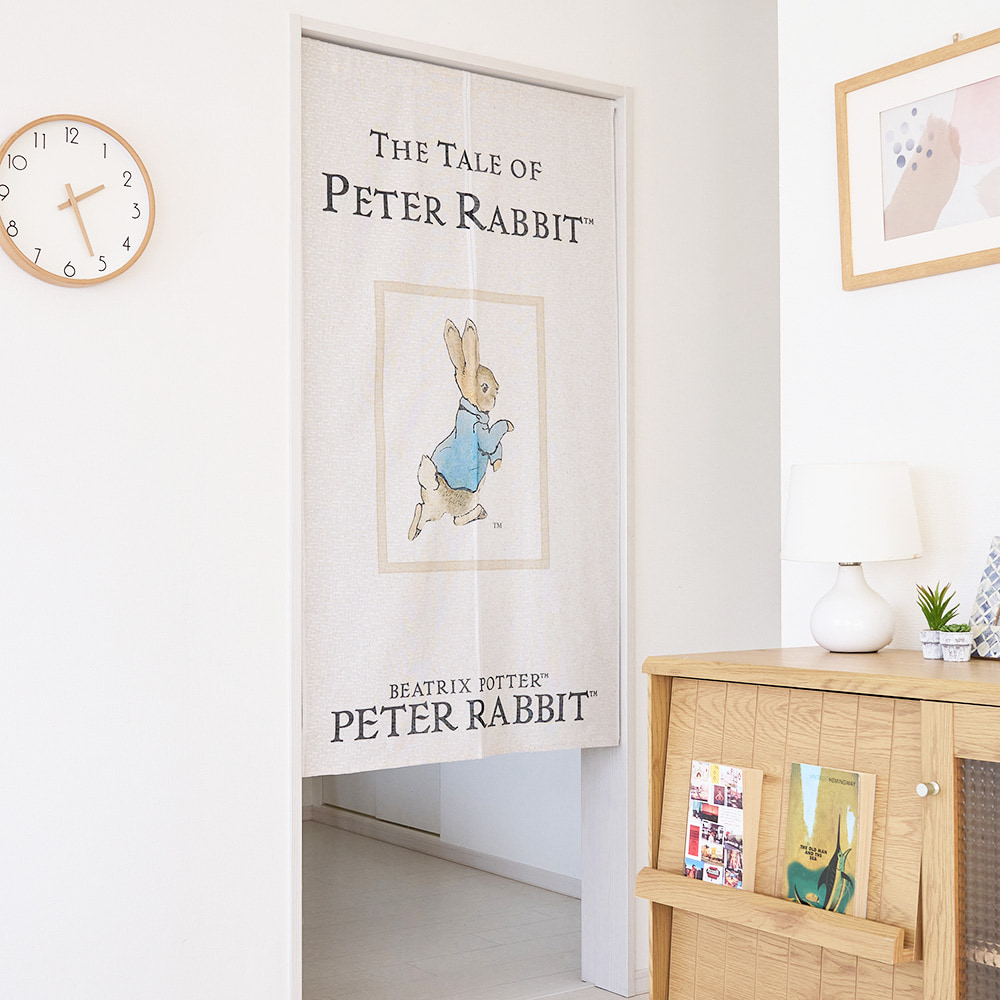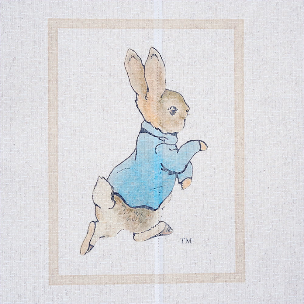 ナチュラルなベージュ地に、軽やかに駆け出すピーターの姿が描かれており、空間にやさしい物語性を添えます。