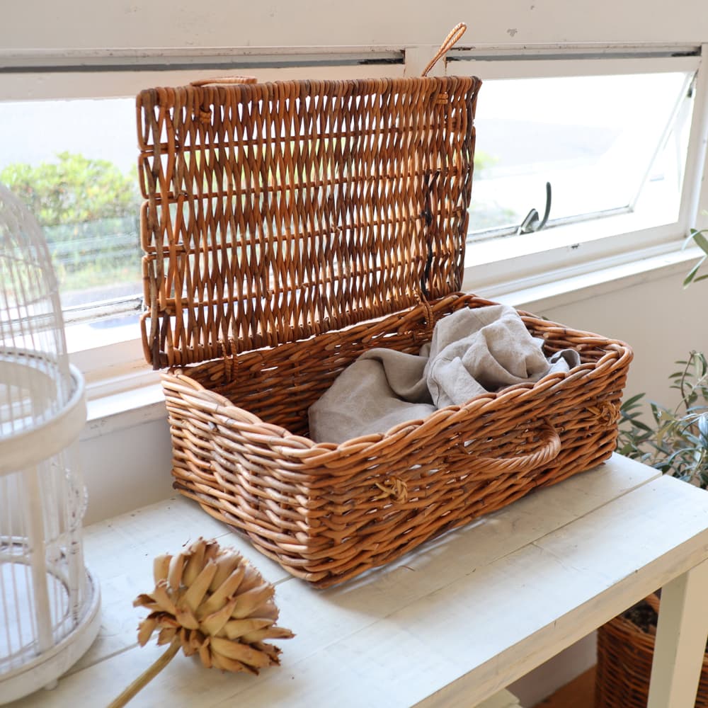 まるで旅に出る時に持っていくような、可愛らしいアラログのバゲッジバスケット。