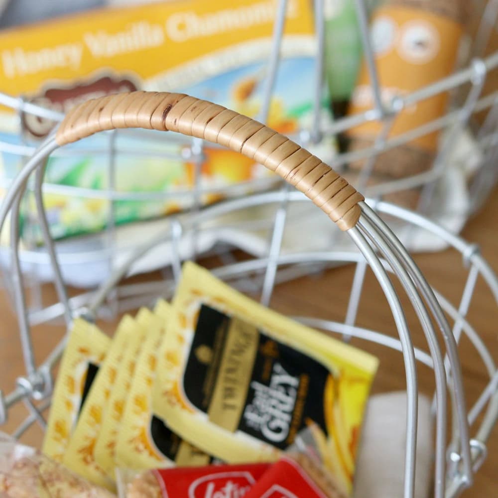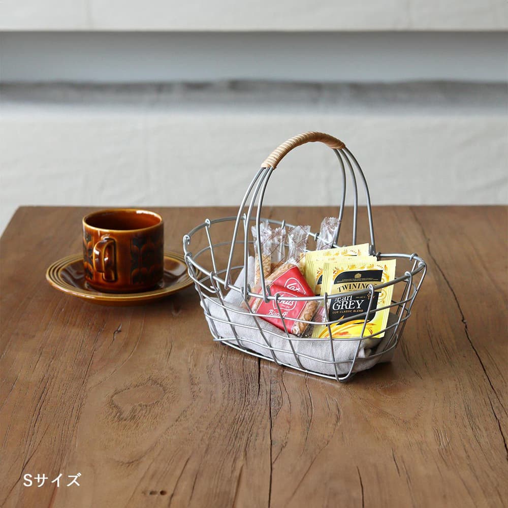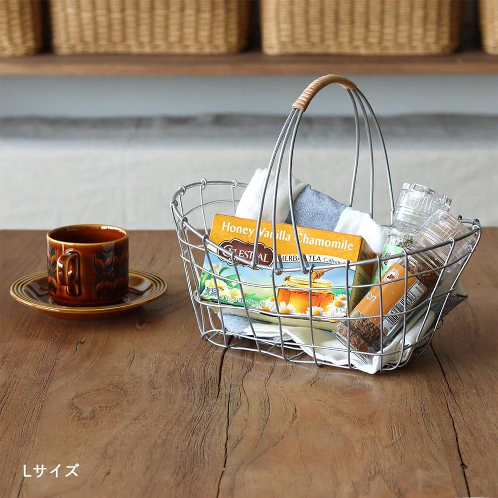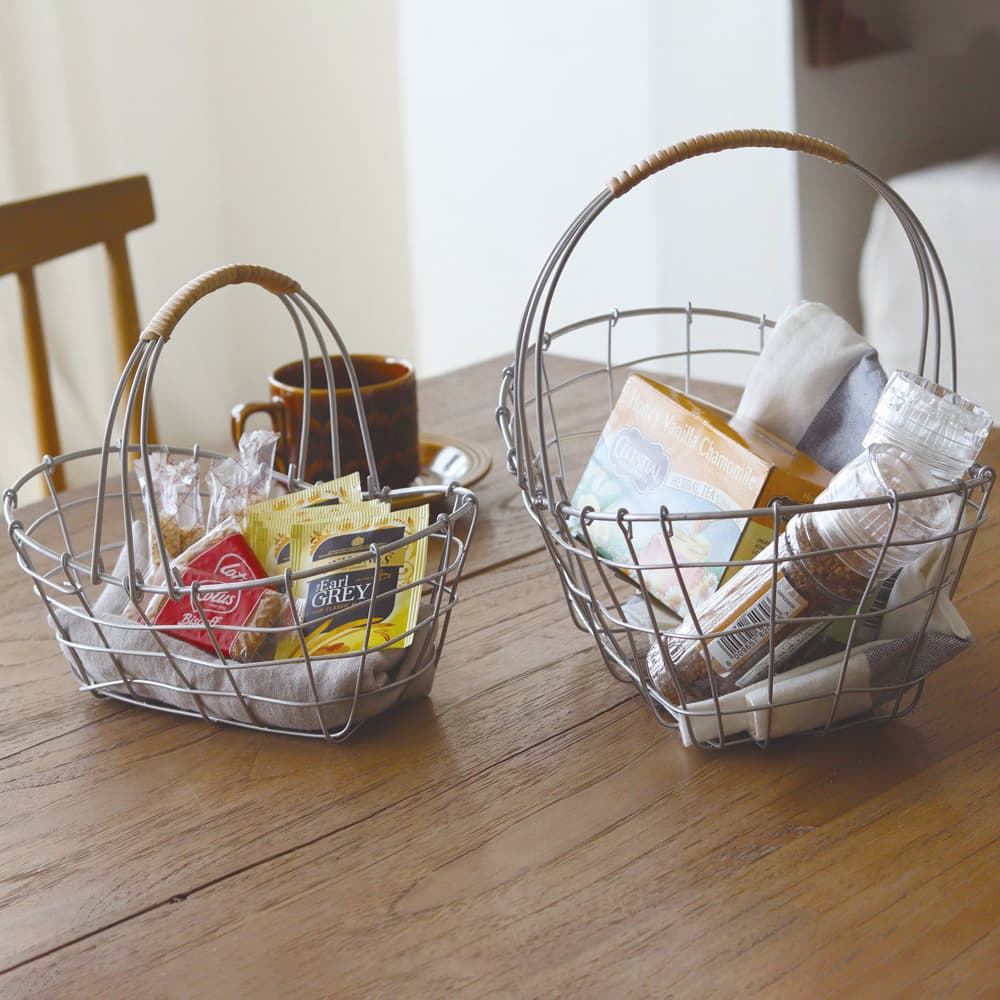 統一感のないものでもワイヤーバスケットに入れることで、まとまりが生まれお洒落なカフェのような雰囲気に。