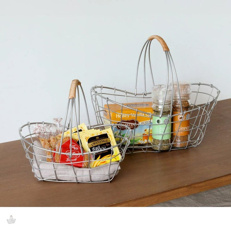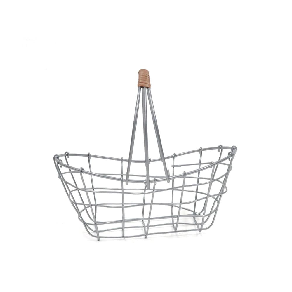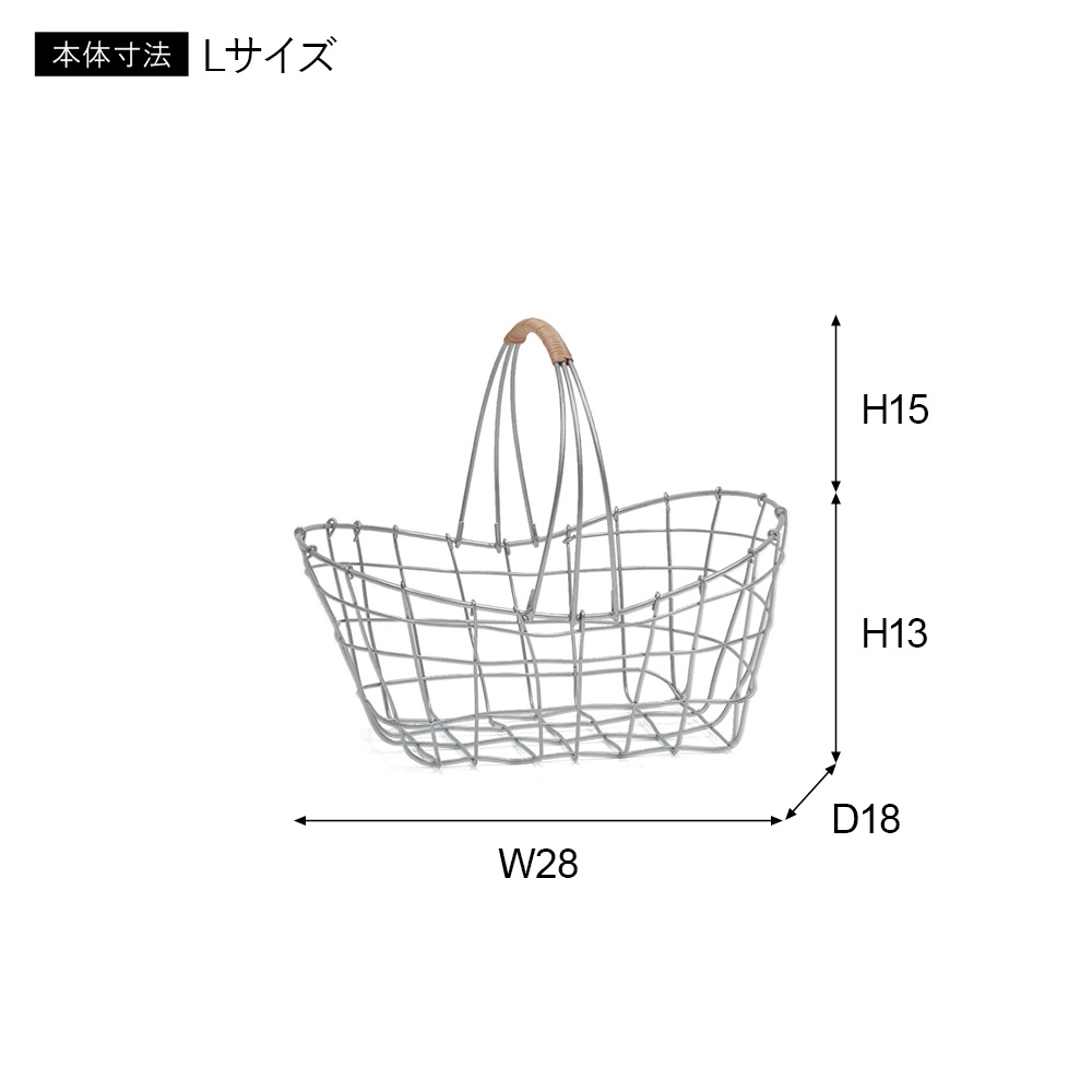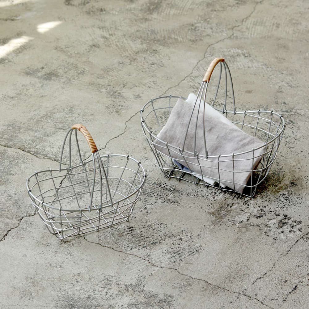 落ち着いたシルバー塗装で仕上げ、アクセントに柳を使ったワイヤーバスケットです。
