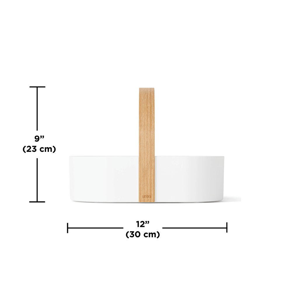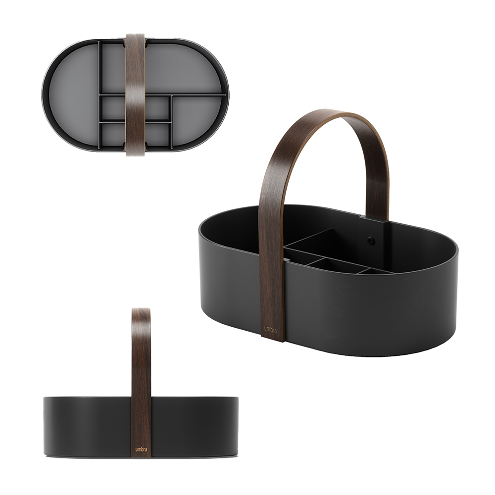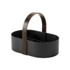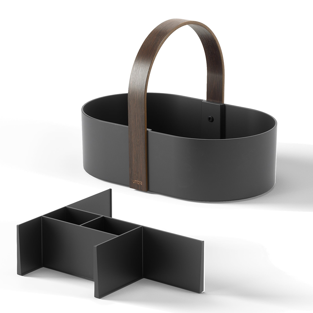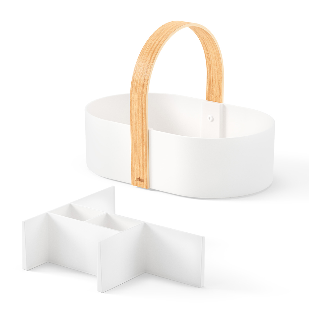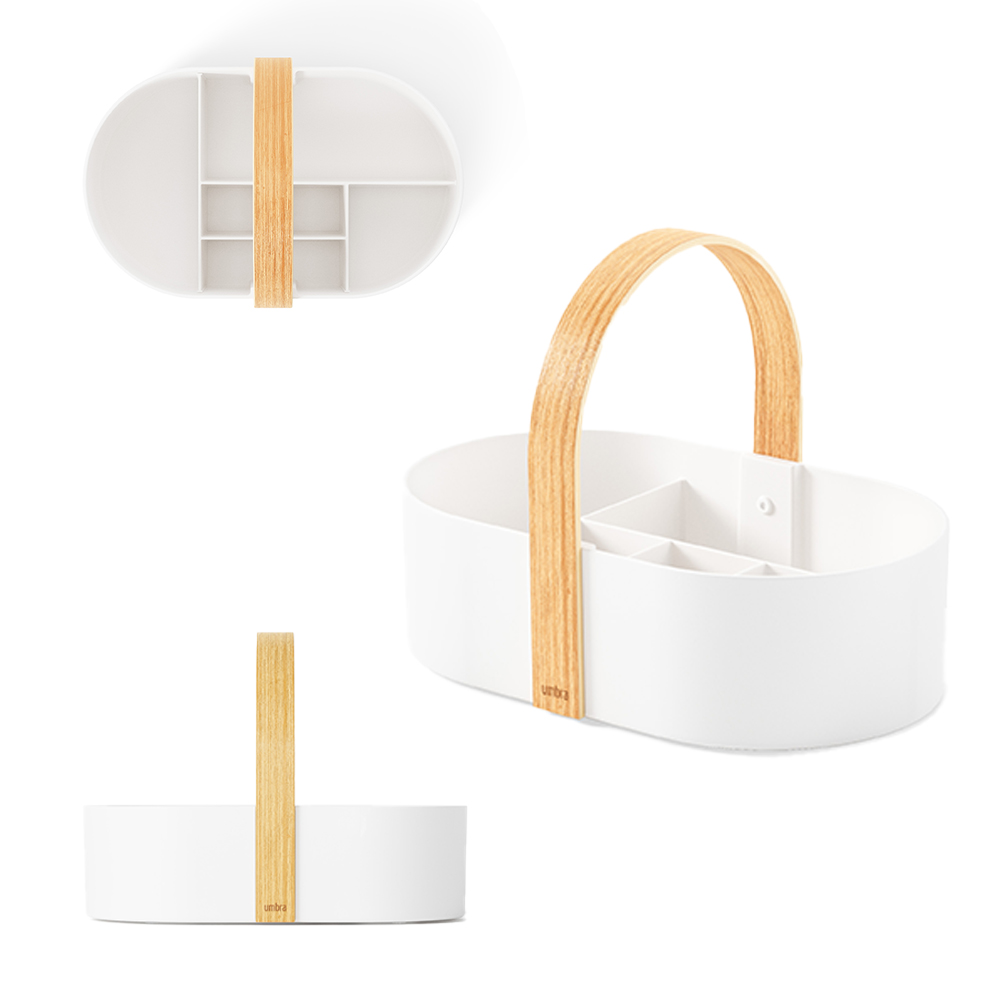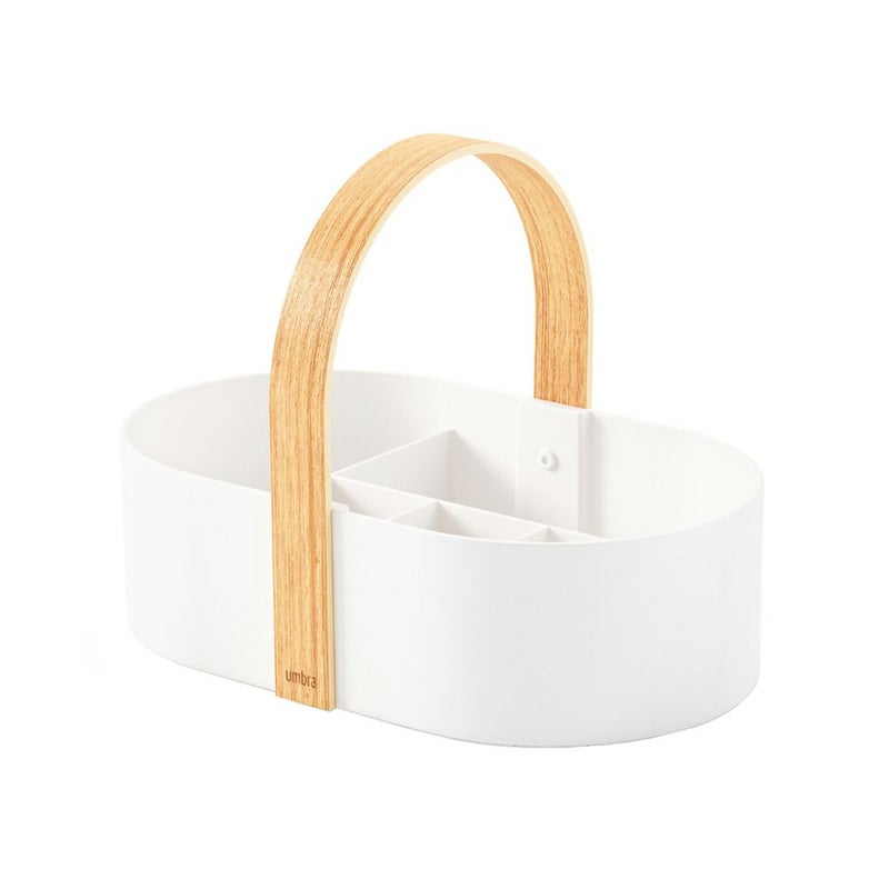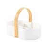 おしゃれな木製ハンドルが付いた、仕切り付きの収納ボックスです。