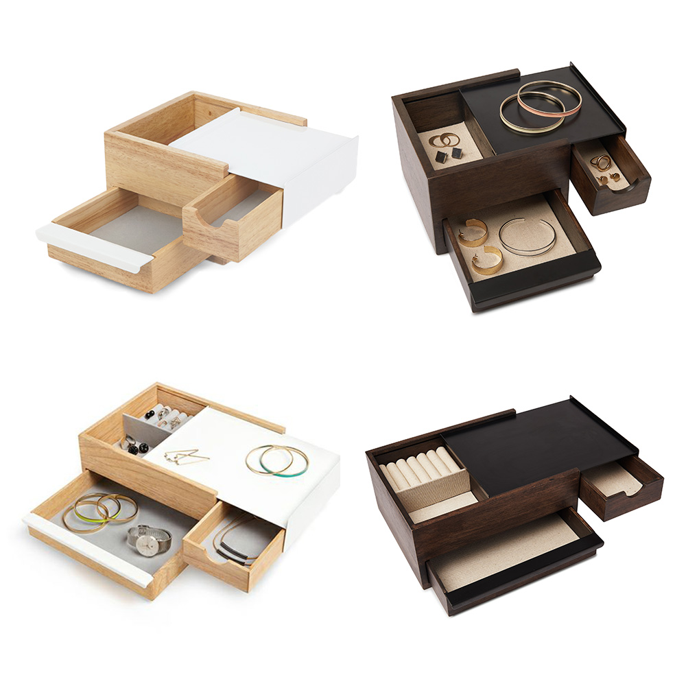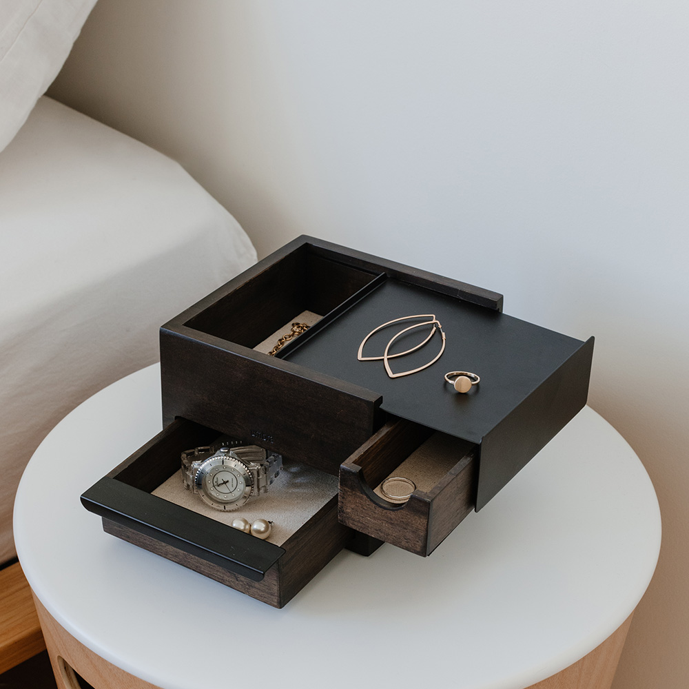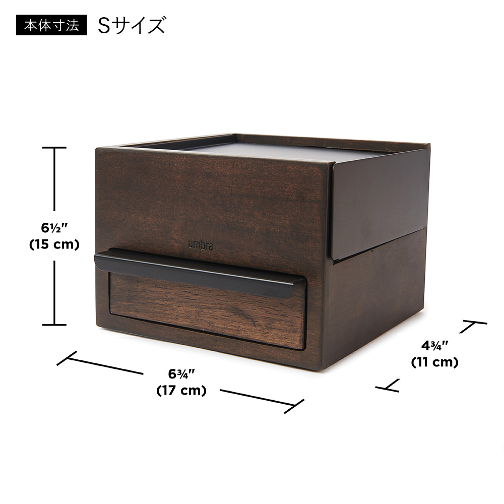 いくつかのサイズの引き出しと、サプライズの隠し引き出しが便利で、リングやネックレス、ブレスレットなど、お気に入りを種類ごとに分けてすっきり収納できます。