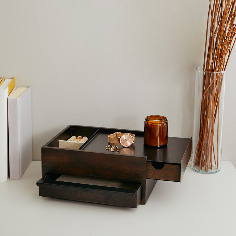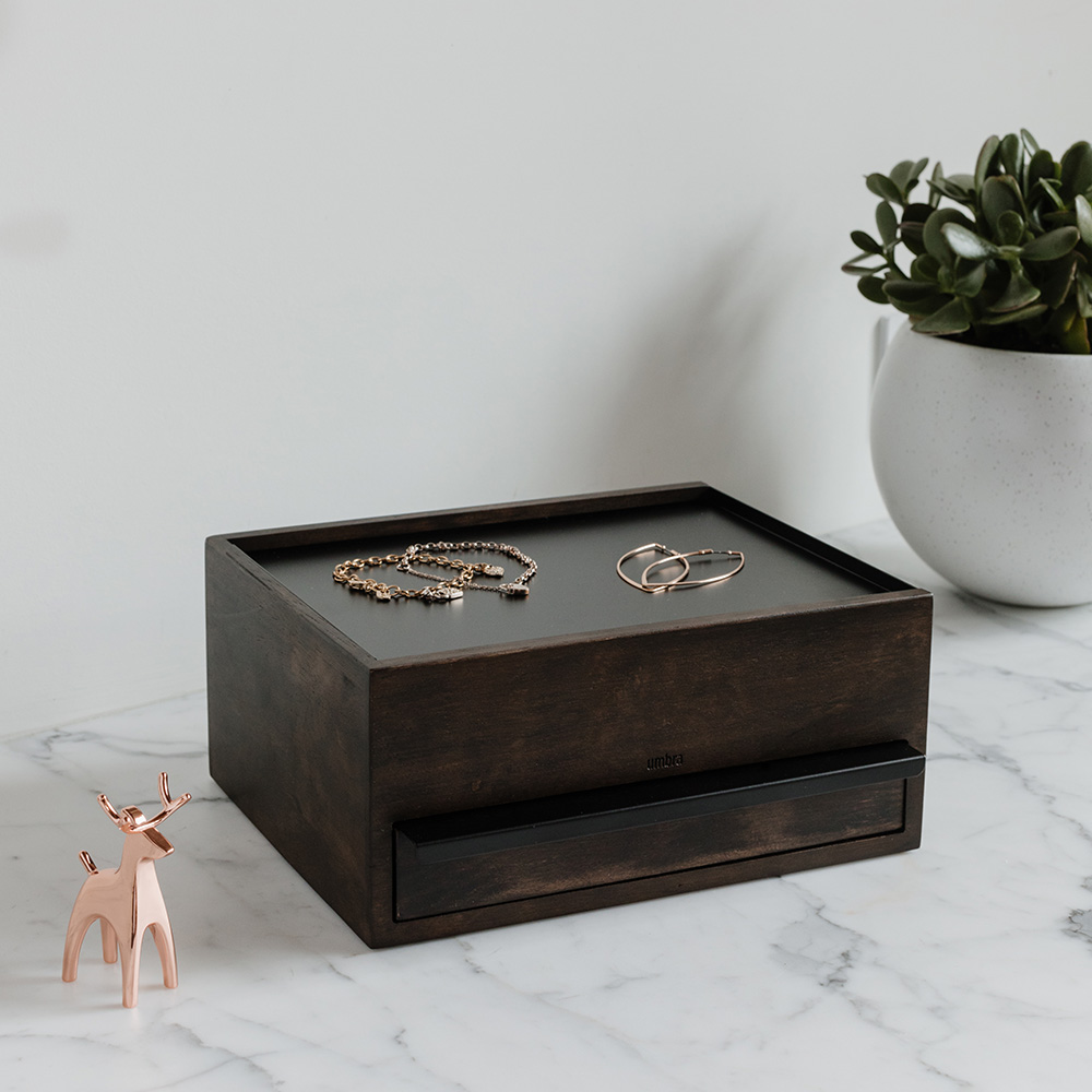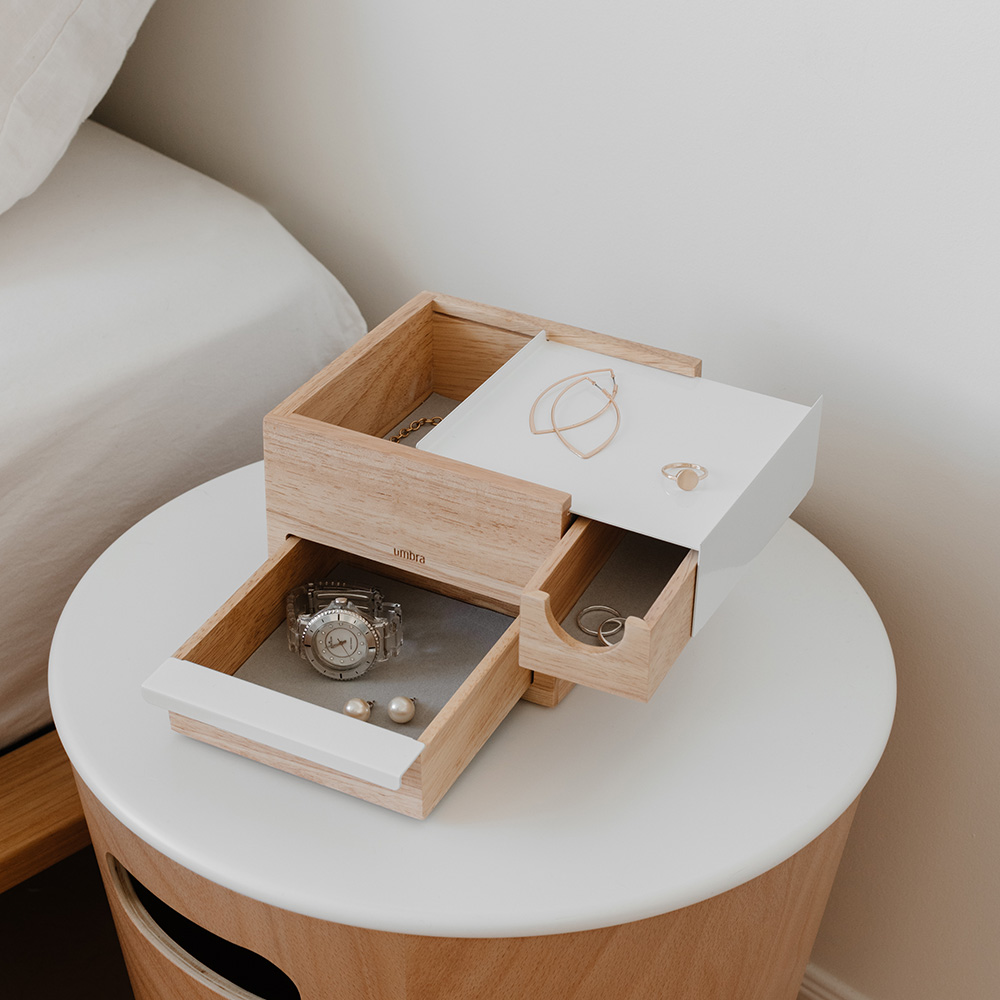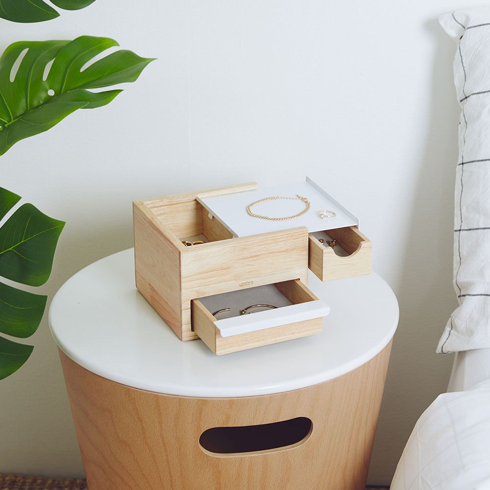 いくつかのサイズの引き出しと、サプライズの隠し引き出しが便利で、リングやネックレス、ブレスレットなど、お気に入りを種類ごとに分けてすっきり収納できます。