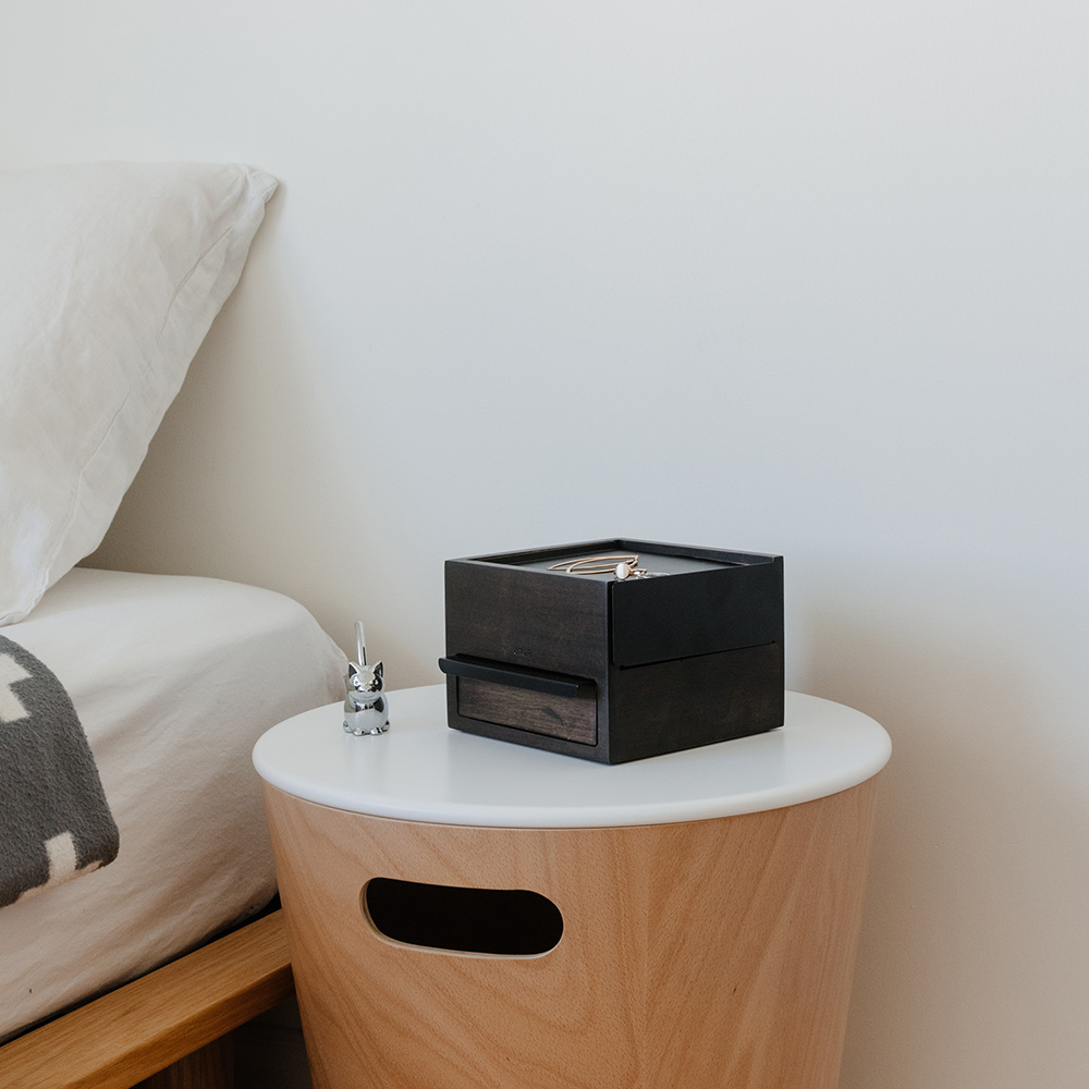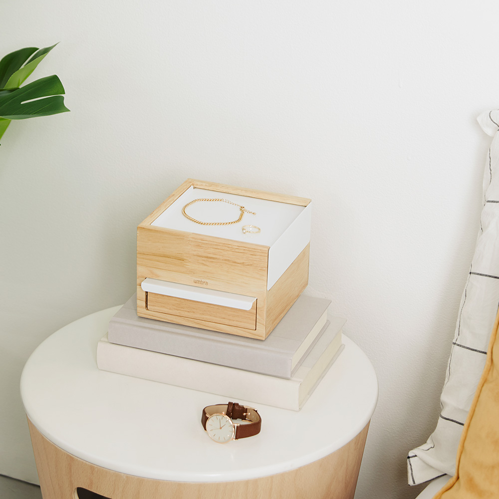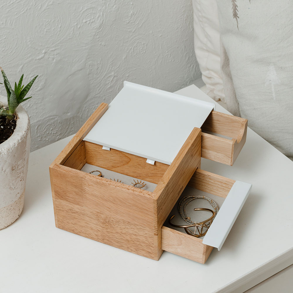 大切なアクセサリーや、心のこもった記念品。そんなあなたにとっての「宝物」を、優しく守りながら美しく整理するジュエリーボックスです。