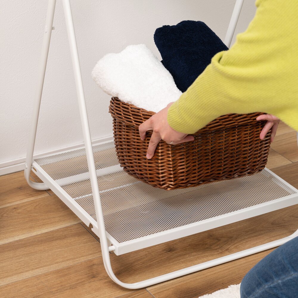 バッグやボックスを置ける棚板付きで、多様な収納に対応。
