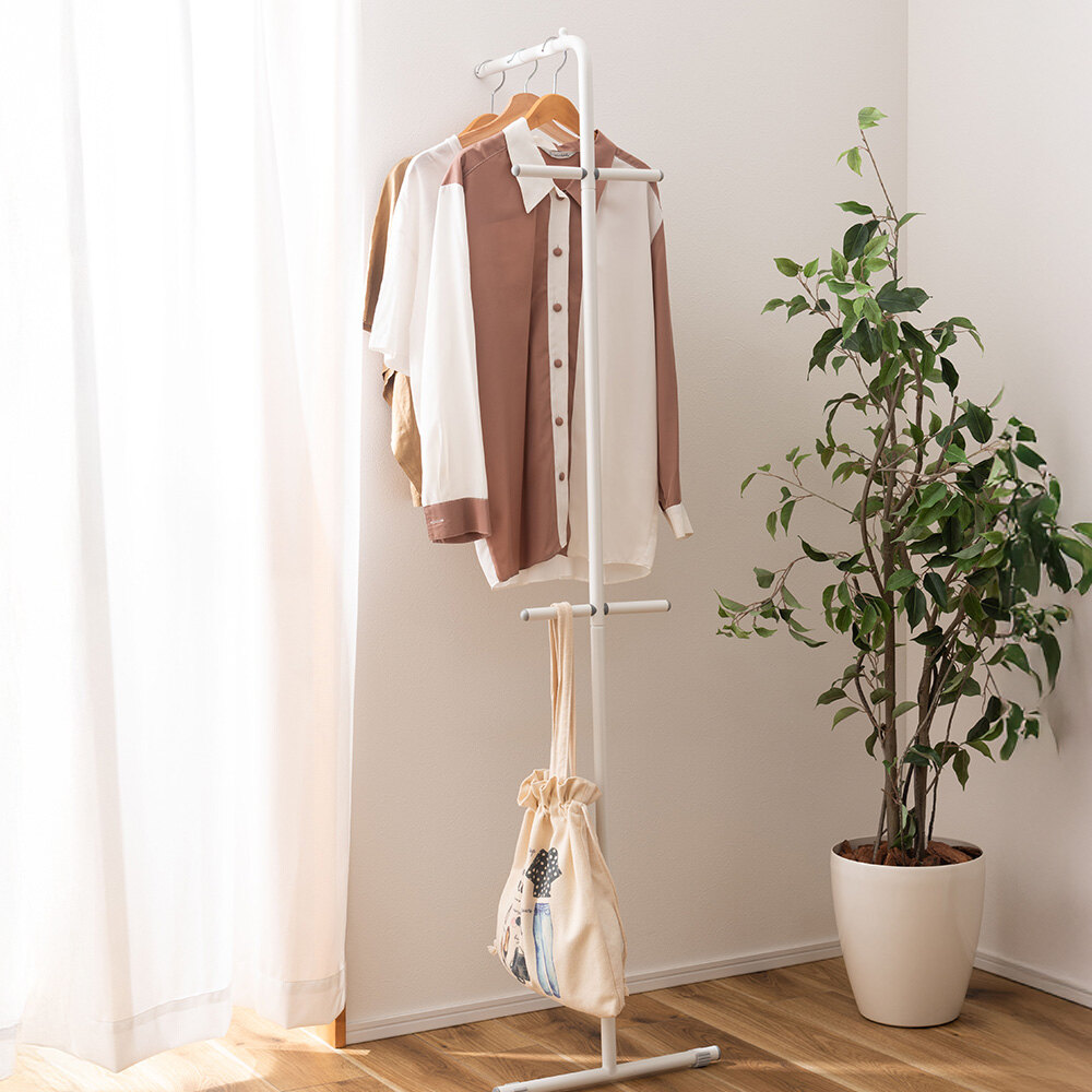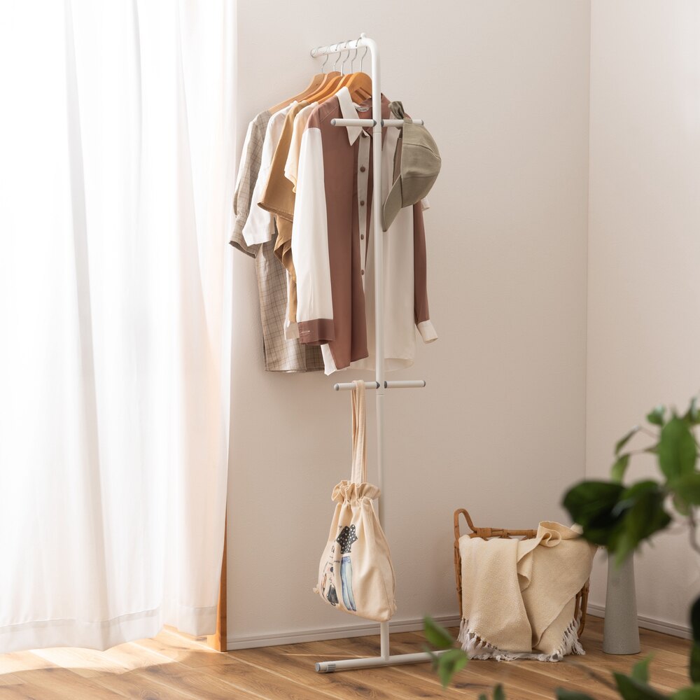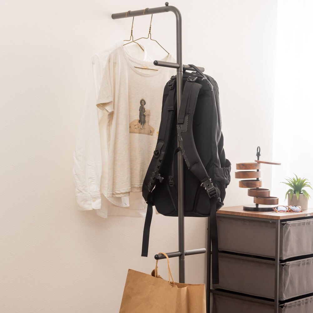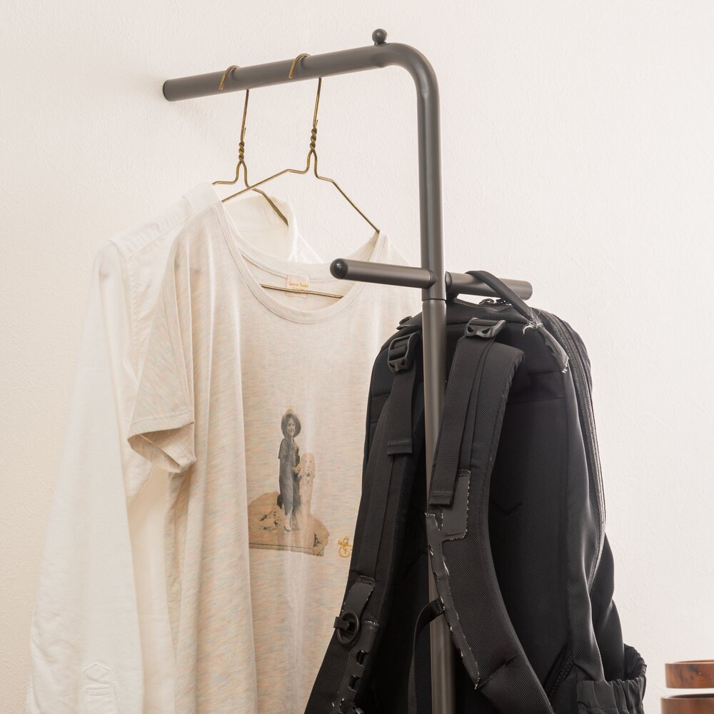 シンプルながらデザイン性の高いハンガーラックは、お部屋や玄関の好きな場所に立てかけるだけで手軽に使えます。