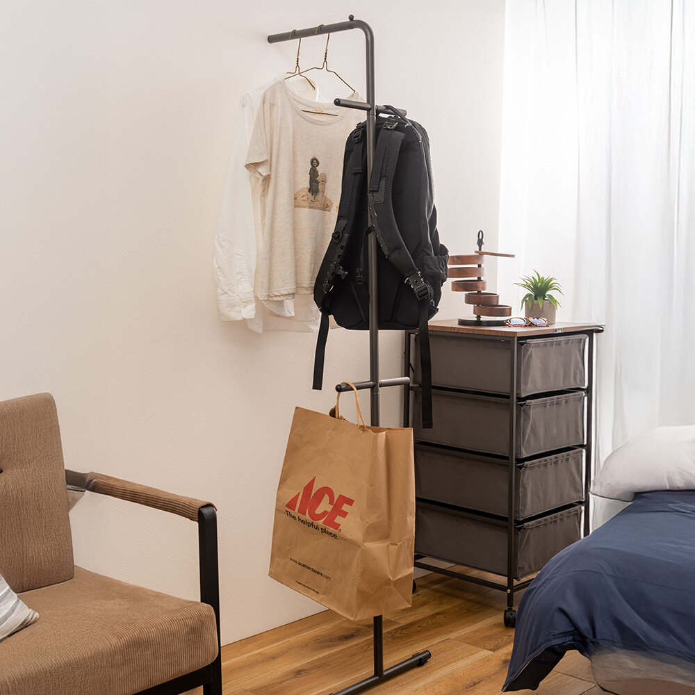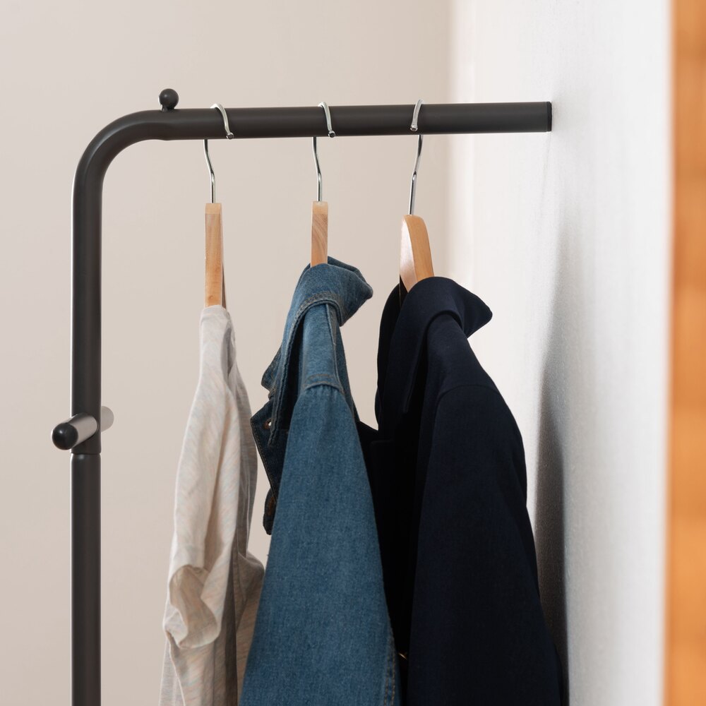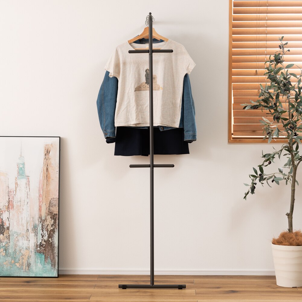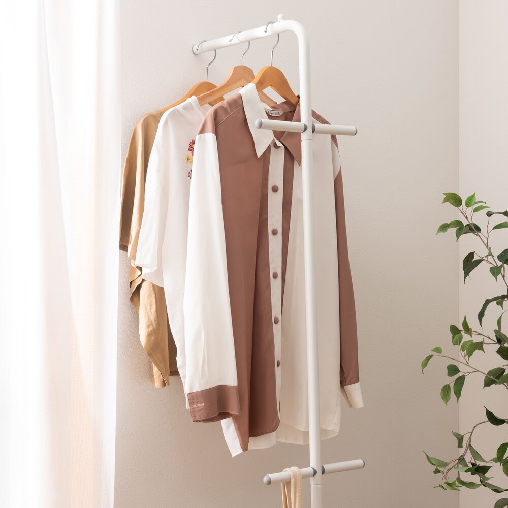 シンプルながらデザイン性の高いハンガーラックは、お部屋や玄関の好きな場所に立てかけるだけで手軽に使えます。