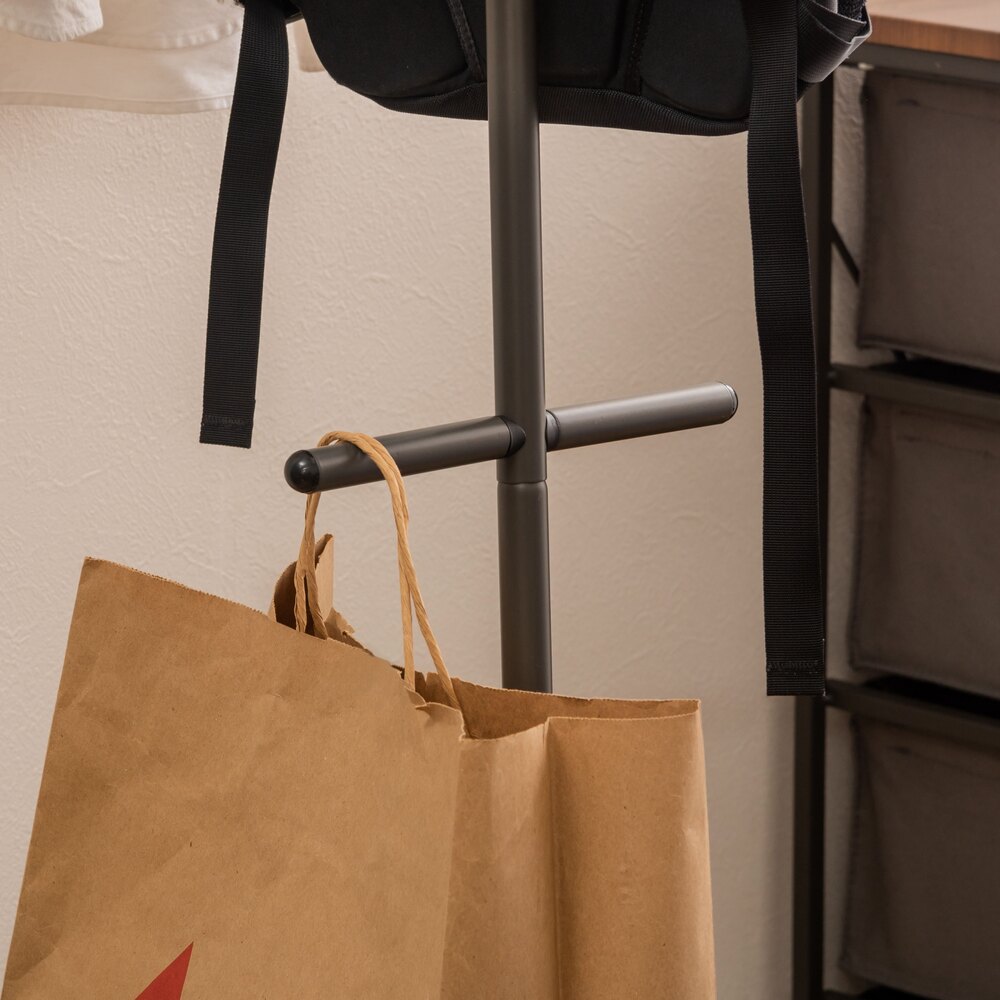 中段と上段のハンガーフレームには帽子やバッグ、ストールなどの小物を掛けられ、使い勝手も抜群です。