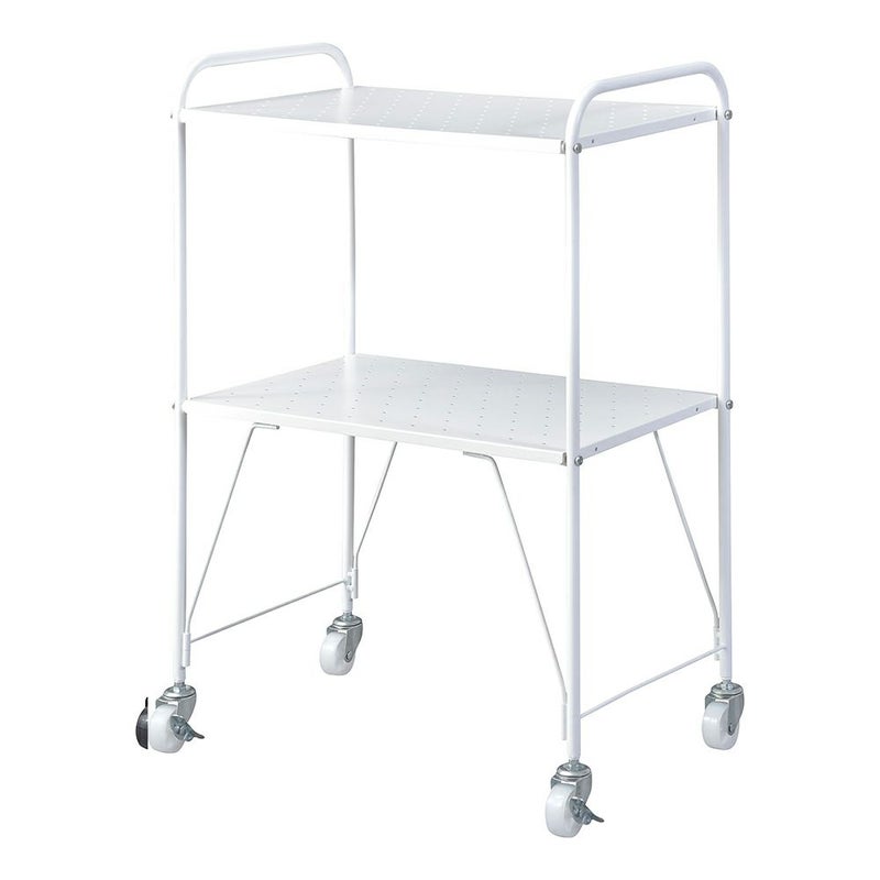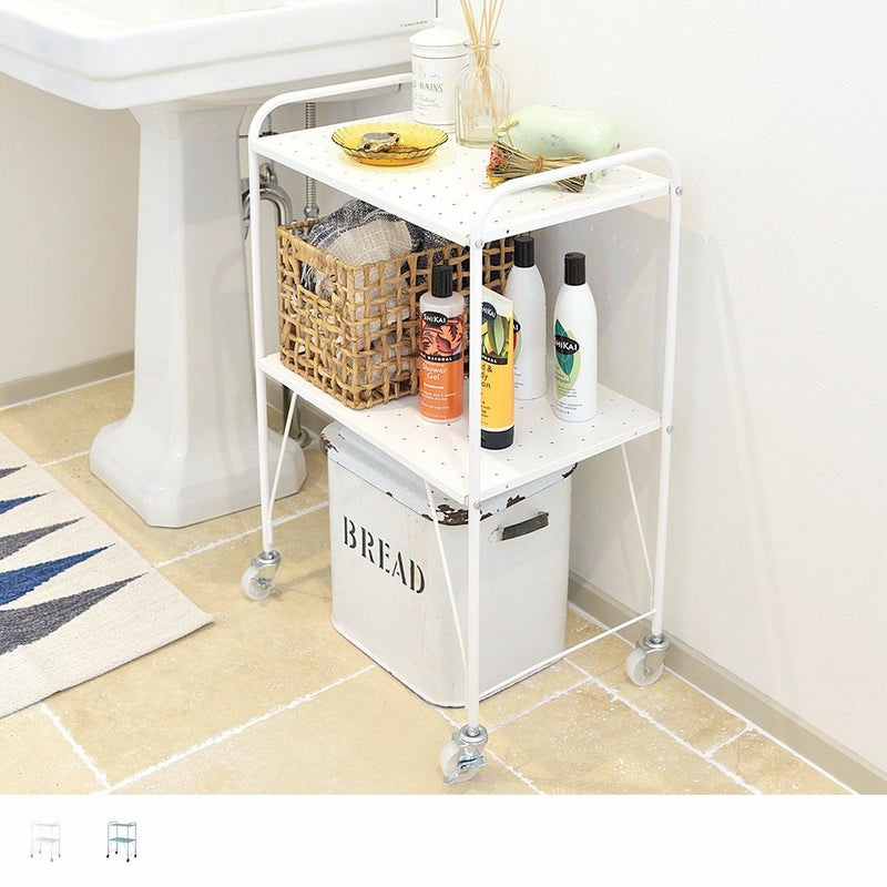 通気性の良いパンチング仕様の棚が2段あり、調味料や化粧品、書類などを置くのにぴったり。