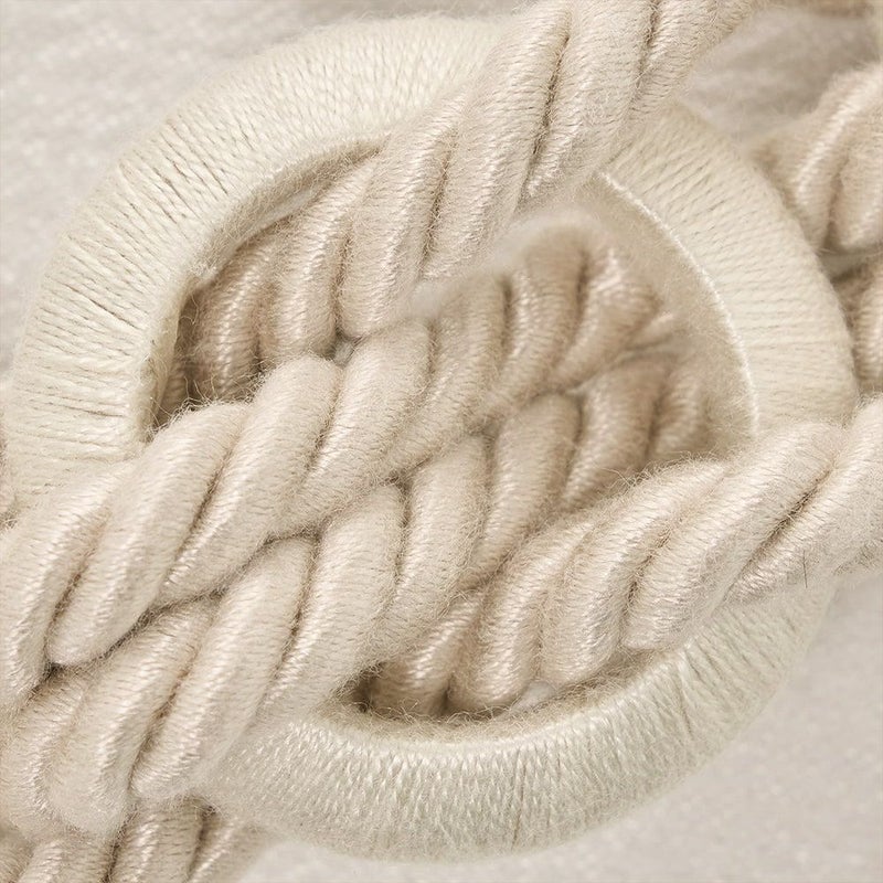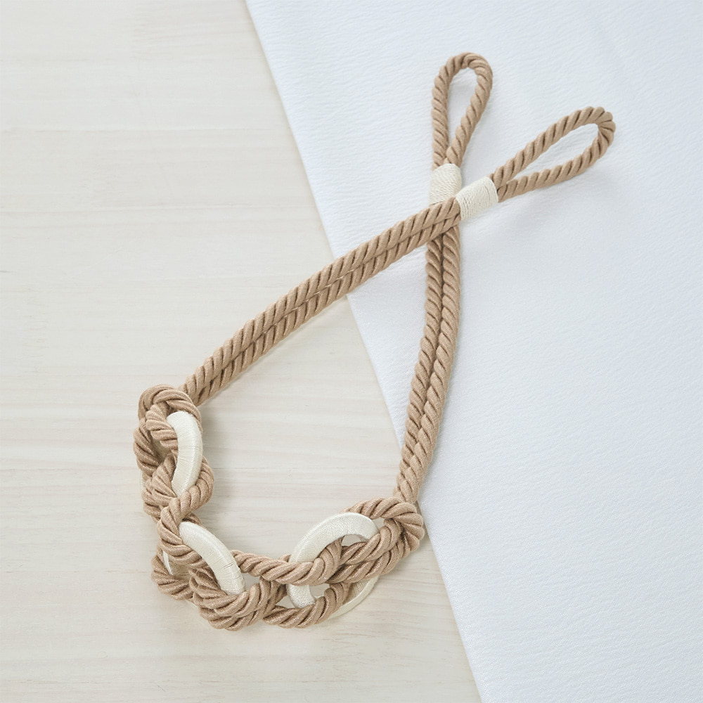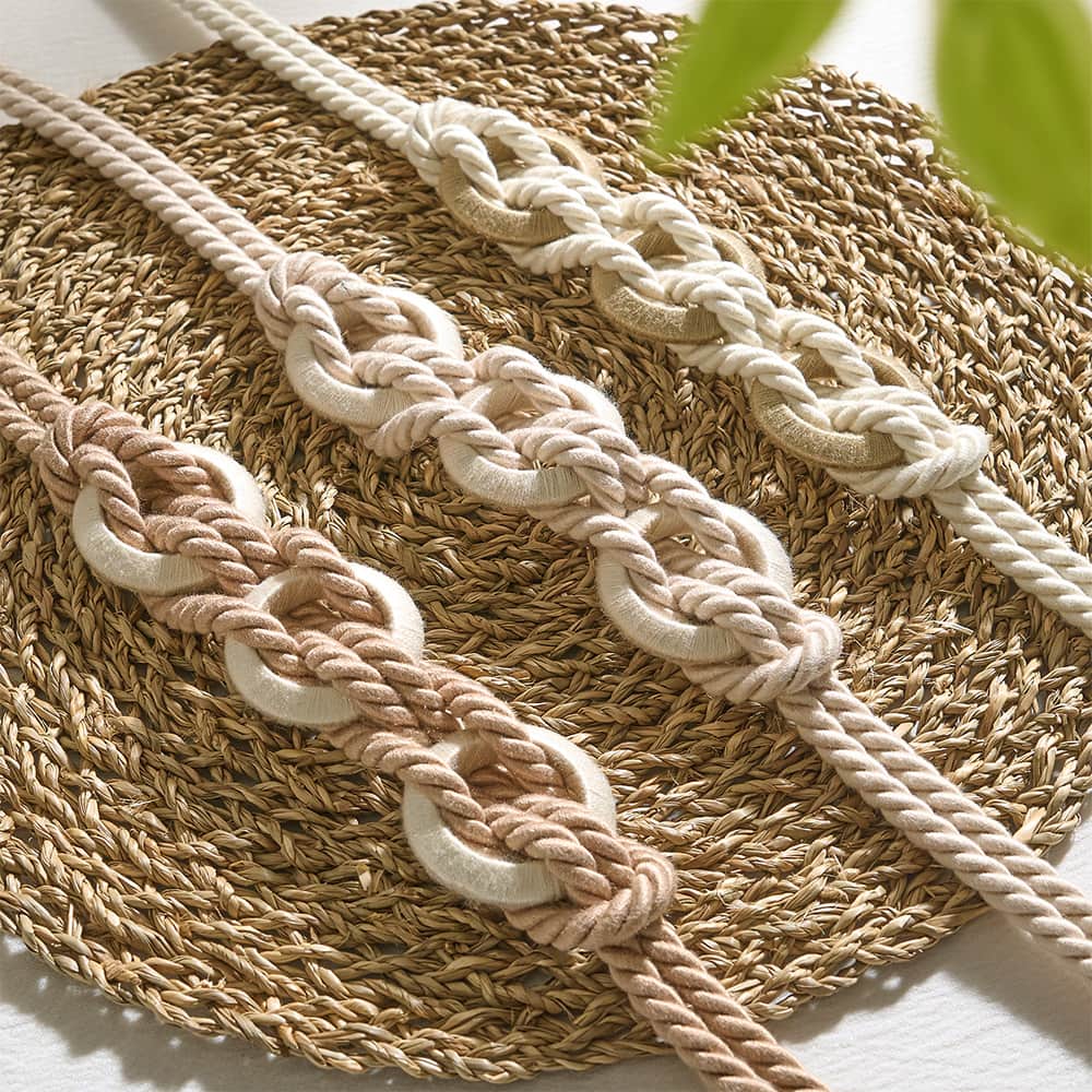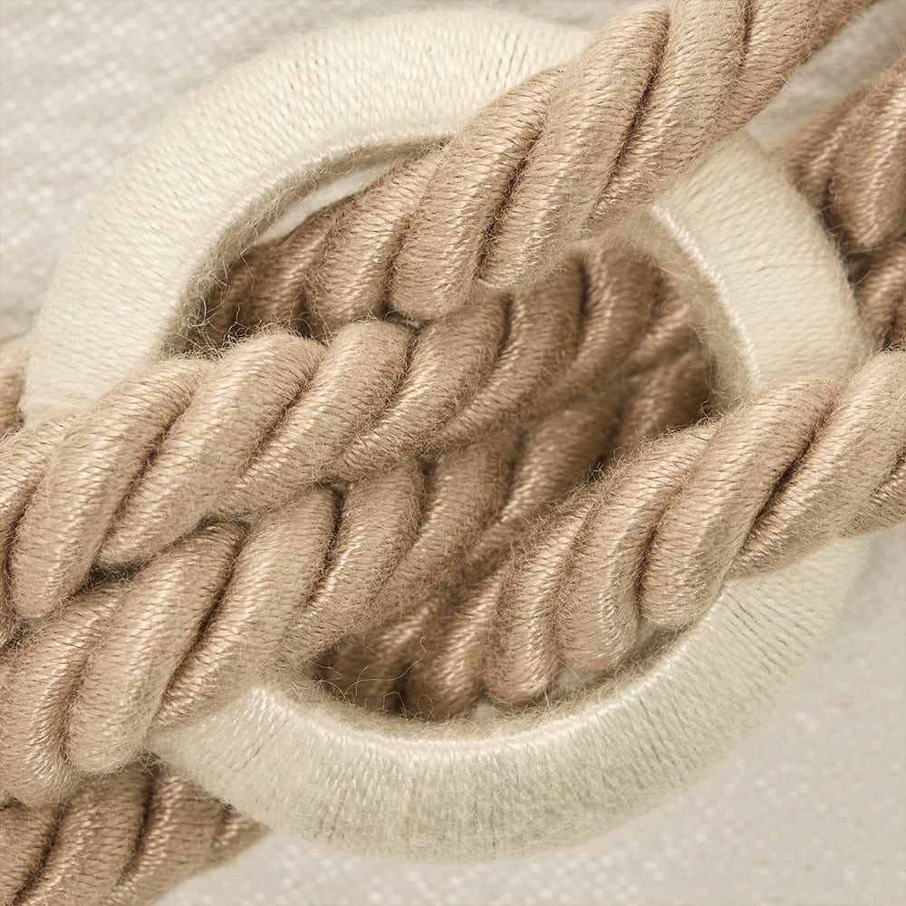 素朴で柔らかなロープに、木目調のリングモチーフを編み込んだデザイン。