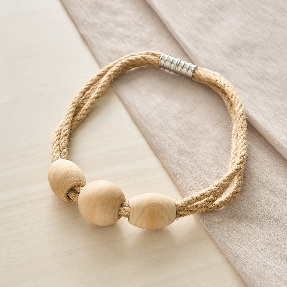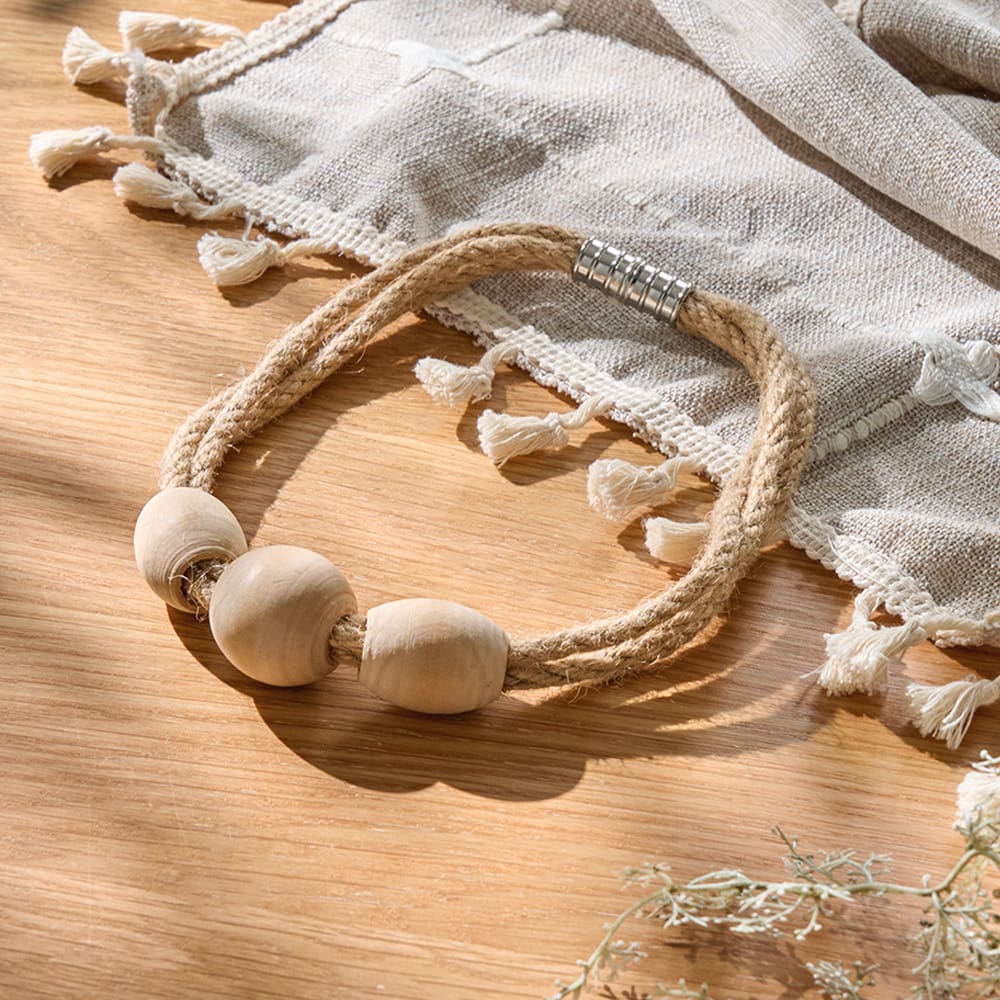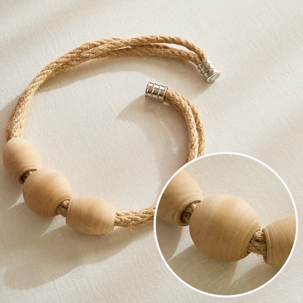麻素材のコードとウッドブロックを組み合わせた、自然素材の豊かな風合いを贅沢に楽しめる木製のマグネットタッセル。