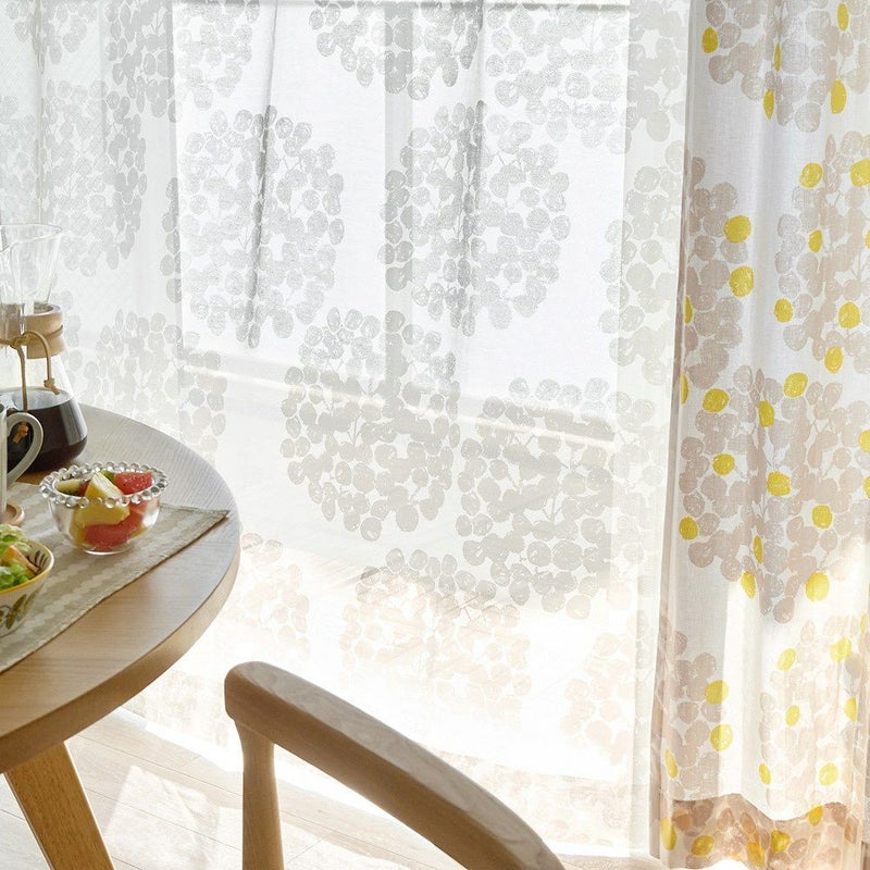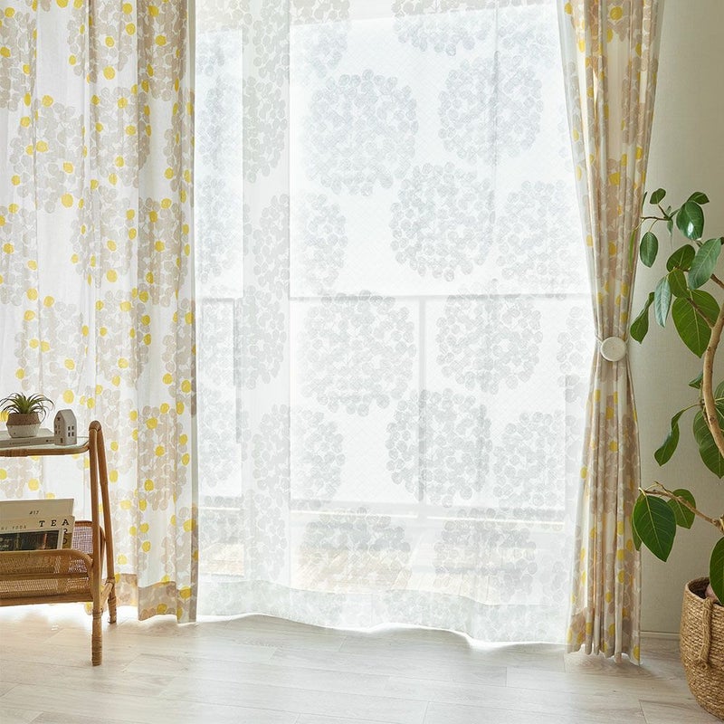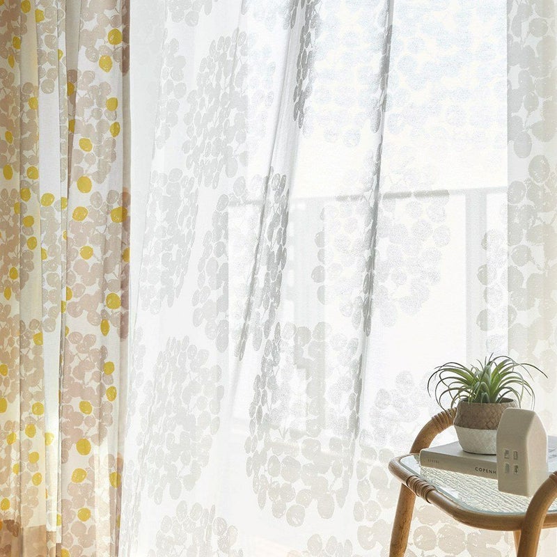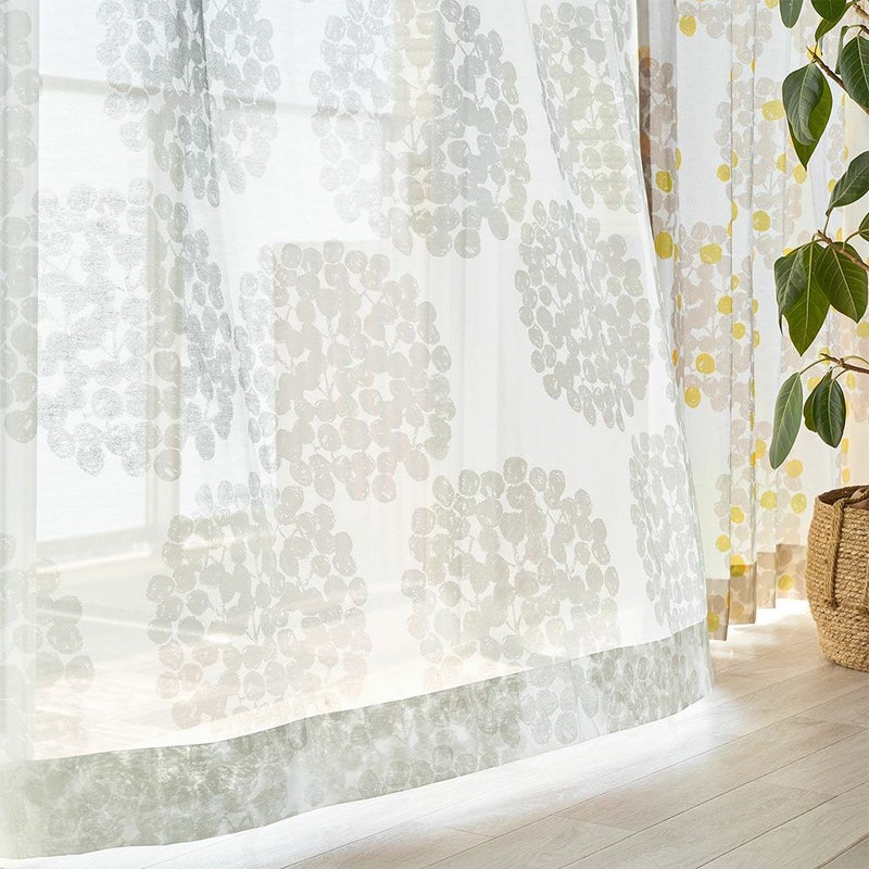 やわらかな手描きのタッチが印象的な<レースフロート>。模様作家・岡理恵子さんによる人気のファブリック<フロート>が、軽やかなレースカーテンになりました。透け感のある生地に白一色で描かれたアジサイ柄は、大柄でも派手すぎず、ナチュラルでやさしい印象に。日差しを受けてふわっと浮かびあがる模様が、窓辺にやわらかな時間を運んでくれます。