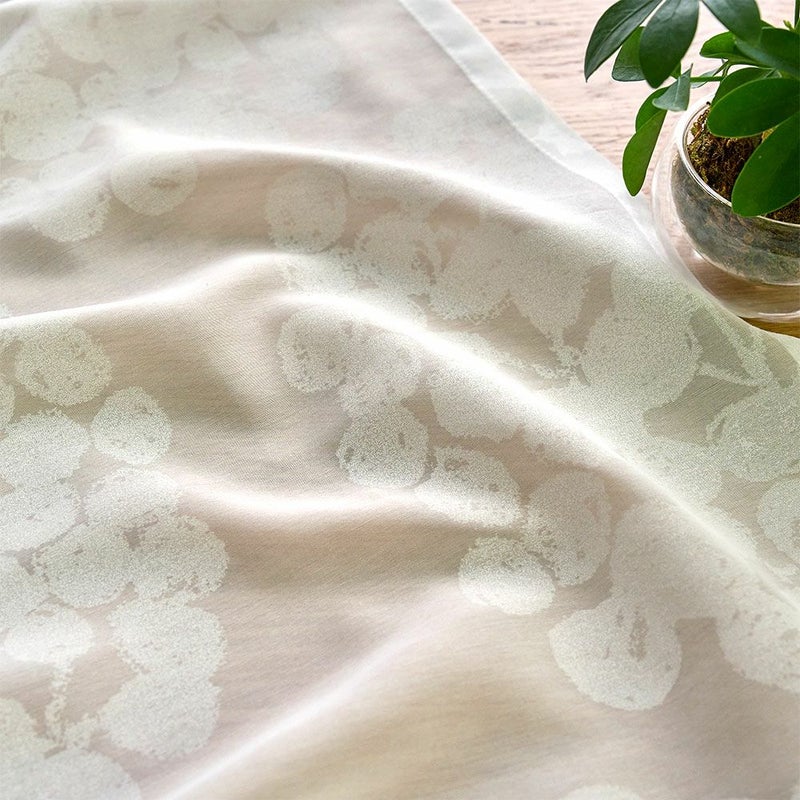 朝の光、午後の光。時間とともに表情を変える<レースフロート>。透け感のある生地に白のアジサイ模様が重なると、まるで光の中に絵が描かれているよう。遮るのではなく受けとめて、やわらかに光を広げるレースカーテンは、空間にほっとする明るさを届けてくれます。