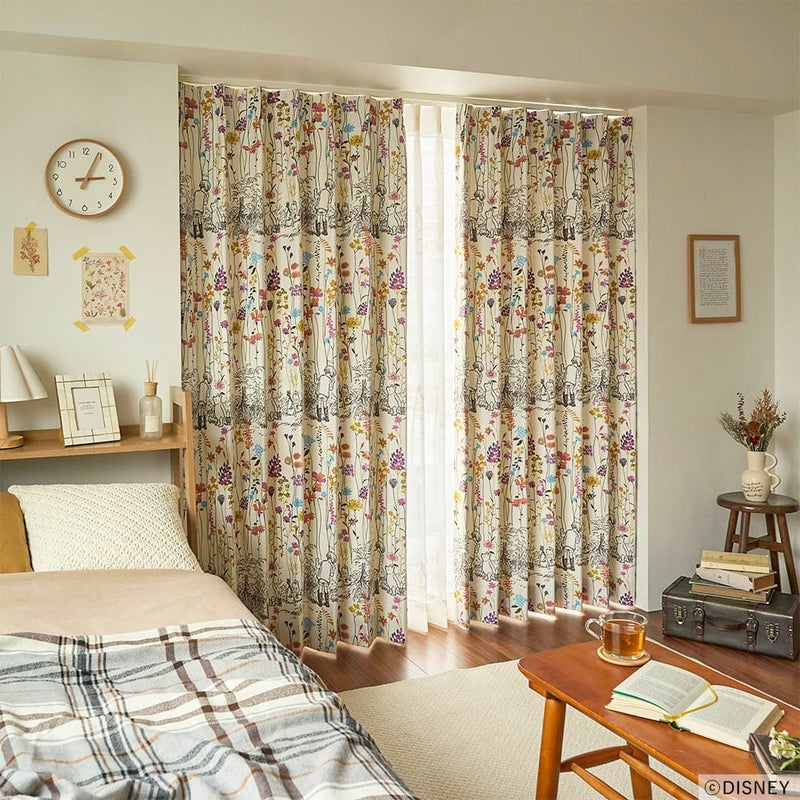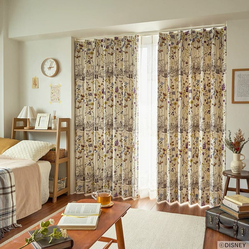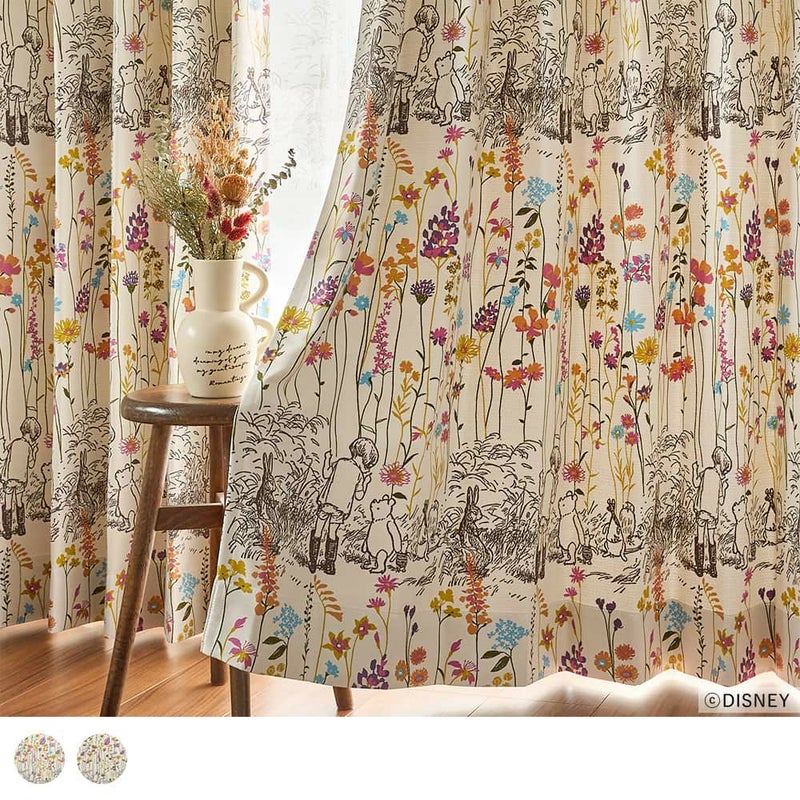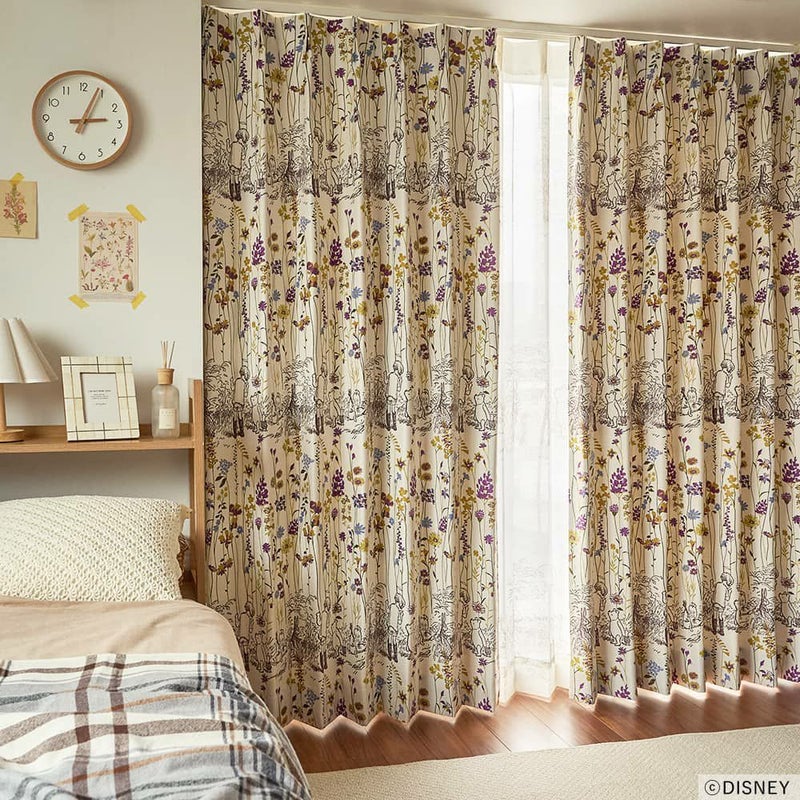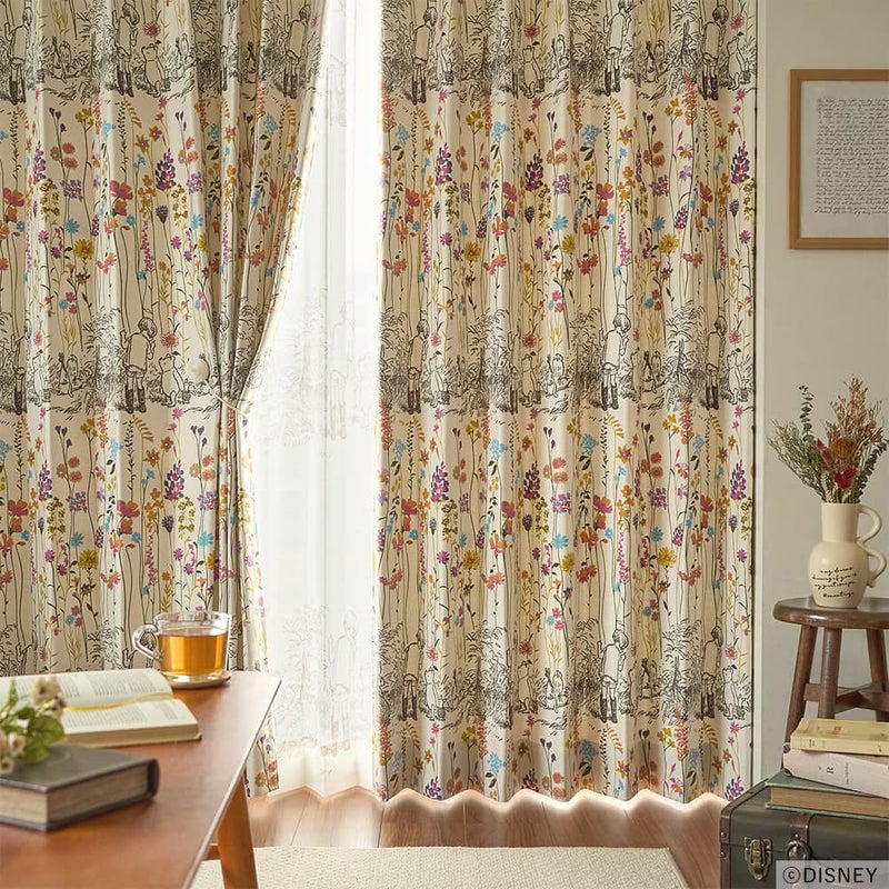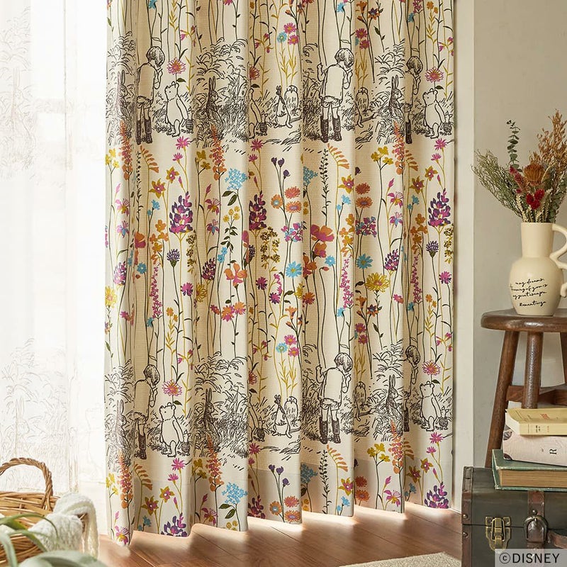 のびのびと鮮やかに咲く花々の陰で、プーさんたちがこっそり内緒話。そんな素敵なお庭でのワンシーンを想像させるカーテンです。カラフルに描かれた花模様が、お部屋いっぱいに幸せな空気を漂わせ、癒しの空間を演出。見るたびに心が和み、自然と笑顔がこぼれる窓辺が、あなたの毎日を明るく彩ります。