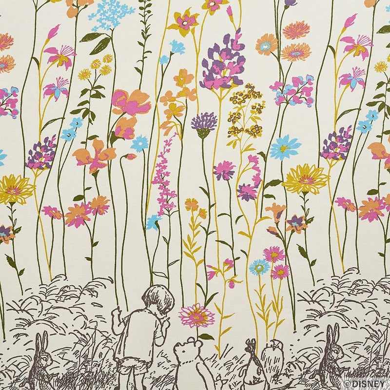 お花畑の中には、プーさんやクリストファー・ロビンなど、お馴染みの仲間たちの姿が。みんなでひそひそと何かをお話し中。お庭の探検計画をたてているのでしょうか。そんな想像が膨らみ、ほっこり癒されるデザインです。
