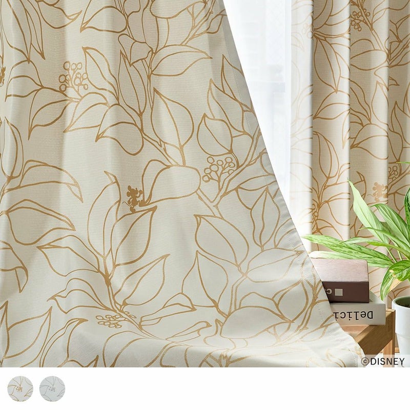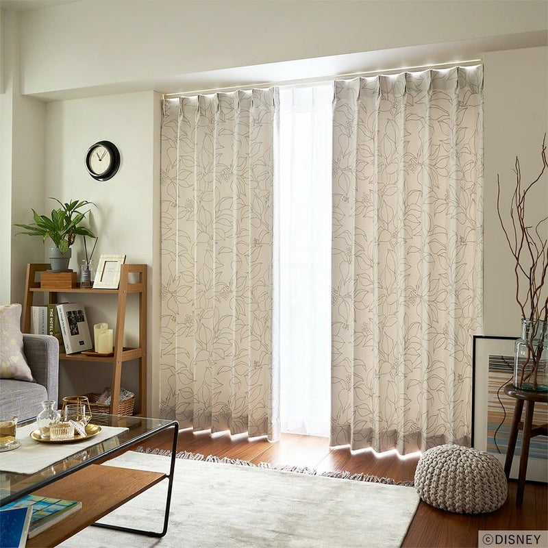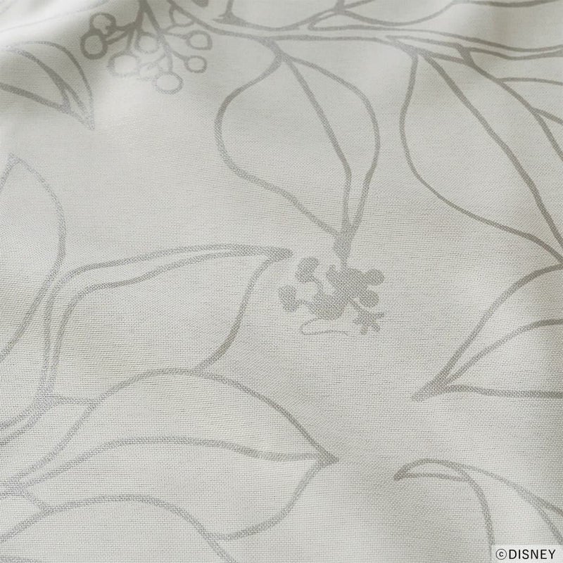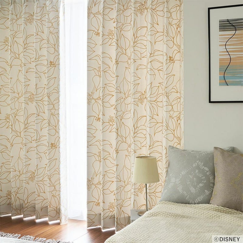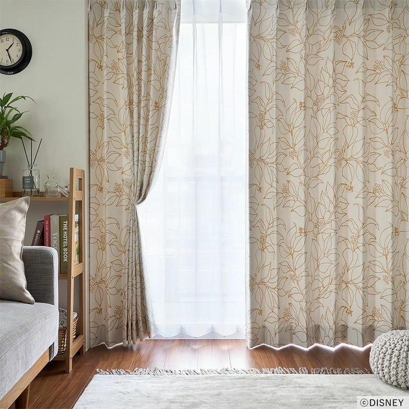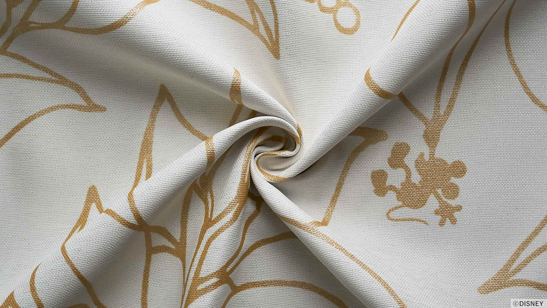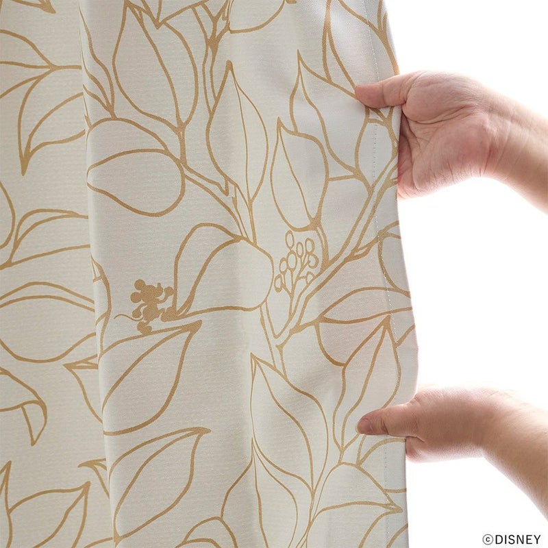 【撮影コーディネート】タッセル <シャンピニオンタッセル アイボリー>大きなリーフ柄に溶け込むように、楽しそうなミッキーが描かれたカーテン。美しいハワイアンリーフのような華やかさを纏いながら、さりげなく心に癒しを届けてくれるデザインです。リーフの間からミッキーを見つけたとき、ふっと心が躍る。そんな隠れミッキーの楽しさも、このカーテンならでは!