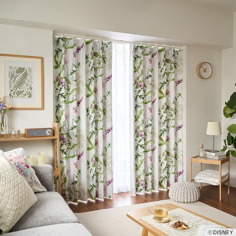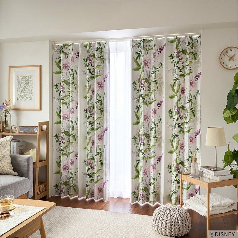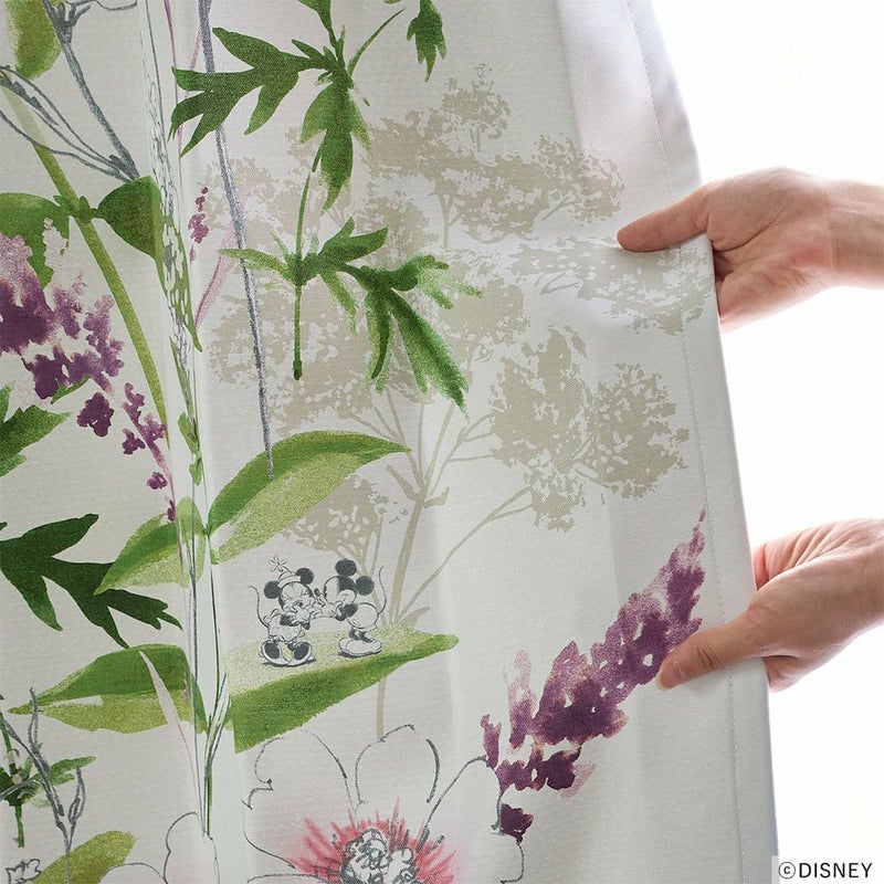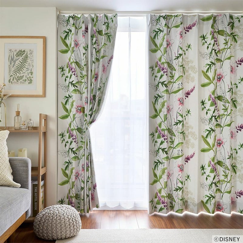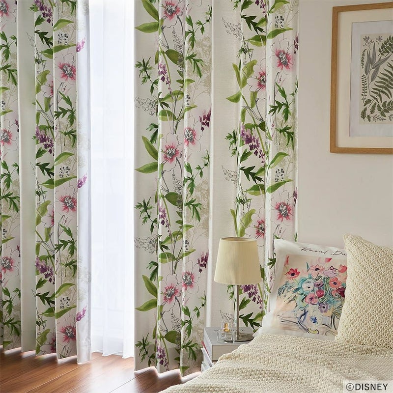 ミッキーとミニーが楽しそうに寄り添う姿が、花柄の中にそっと現れるカーテン。やわらかな水彩タッチの花模様は、自然の中で深呼吸するような、ゆったりとした時間を届けてくれます。慌ただしい日常に、やすらぎを。自然の彩りに包まれて、心がほどけるカーテンです。