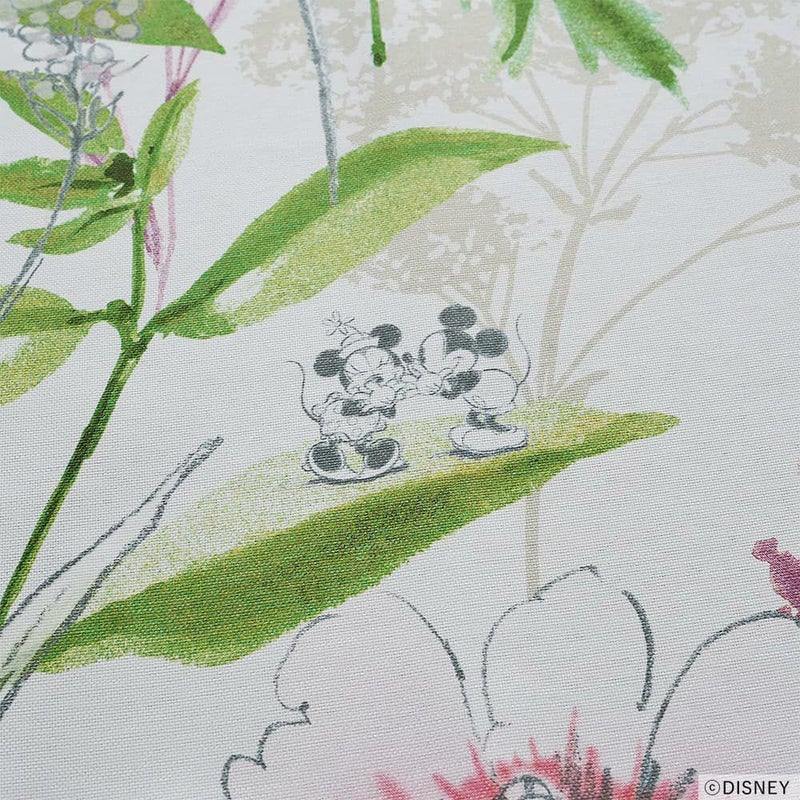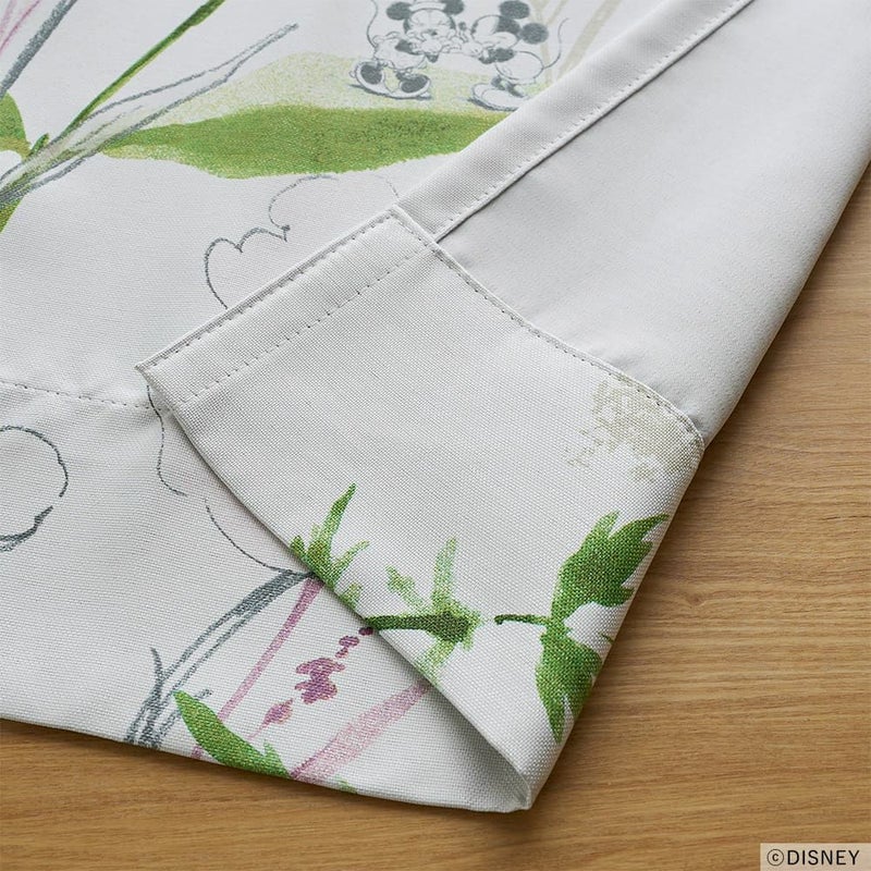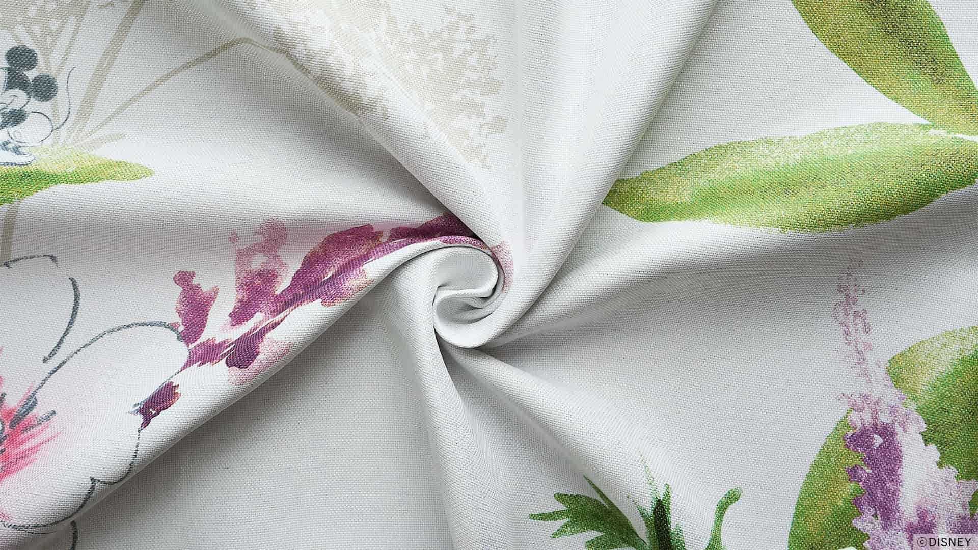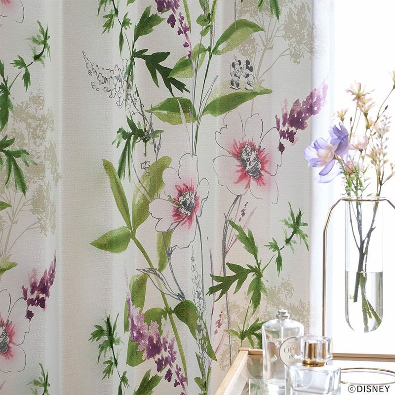 ミッキーとミニーが楽しそうに寄り添う姿が、花柄の中にそっと現れるカーテン。やわらかな水彩タッチの花模様は、自然の中で深呼吸するような、ゆったりとした時間を届けてくれます。慌ただしい日常に、やすらぎを。自然の彩りに包まれて、心がほどけるカーテンです。