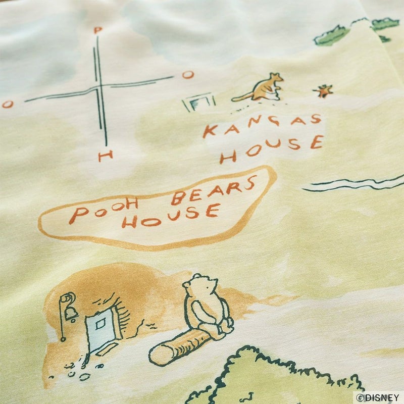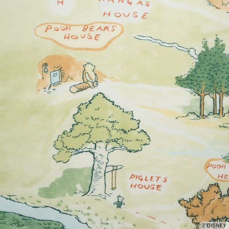 やわらかなレースに広がる地図は、プーさんたちが暮らす「100エーカーの森」。お馴染みの家や木々、小道まで、手書き風の優しいタッチで描かれています。眺めるたびに楽しい物語がはじまり、まるで自分も一緒に冒険しているよう。そんな夢とわくわくがたっぷりと詰まった1枚です。