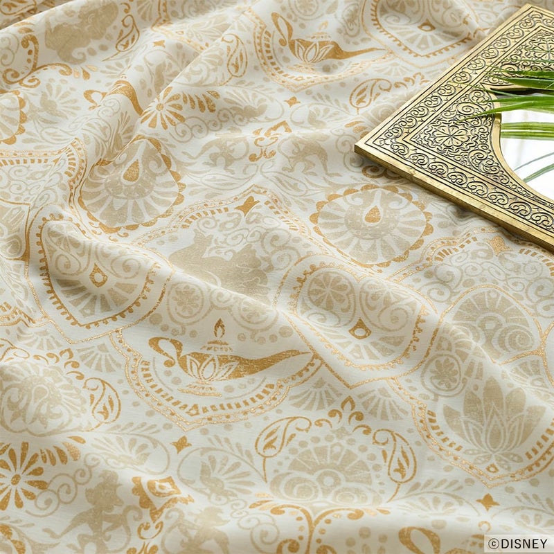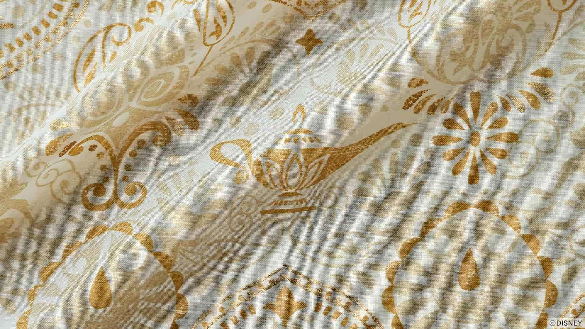 よく目を凝らしてみると、アラジンやジャスミン、ジーニー、そしてランプのシルエットが。遠目には上品なダマスク模様、近づくとさりげなく浮かび上がるアラジンのモチーフ。キャラクター感を抑えたデザインだから、子どもっぽくならず、上質な印象に。ゴールドの輝きがひと目で心を奪う、華やかでゴージャスな一枚です。