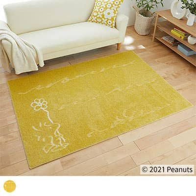 【撮影コーディネート】クッションカバー< フラワーメイズ イエロー>原っぱにたたずむウッドストックが可愛いデザイン♪防ダニ加工や遊び毛防止加工も施された、機能も可愛さも満点のデザインラグです。